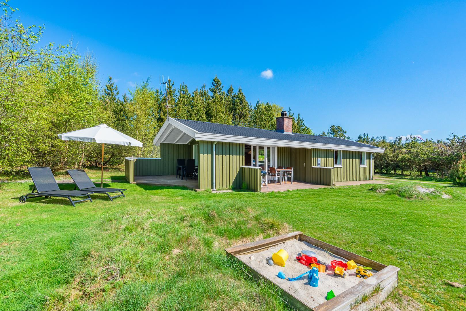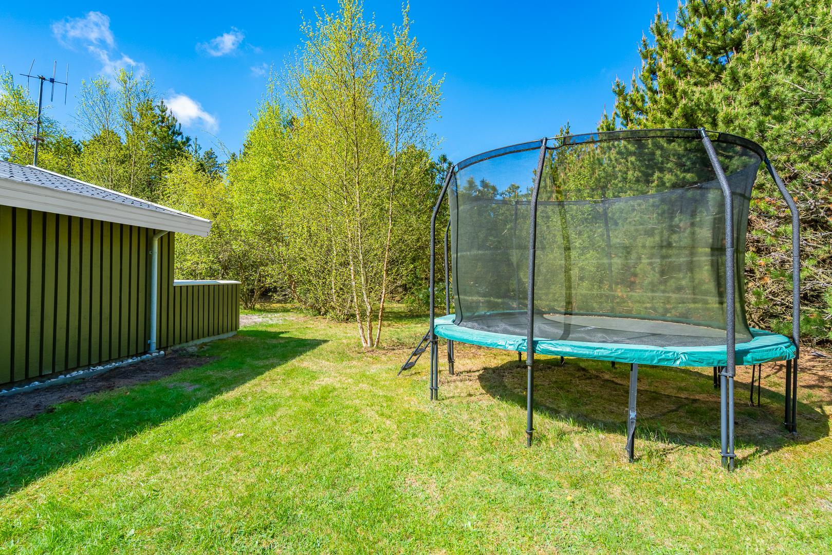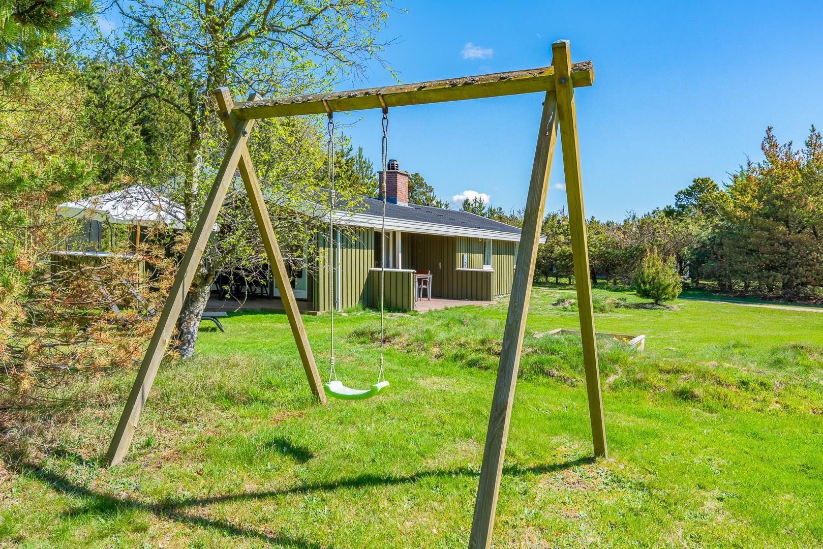 For de mindste feriegæster er der både sandkasse, gynger og trampolin – og god plads til boldspil og leg.