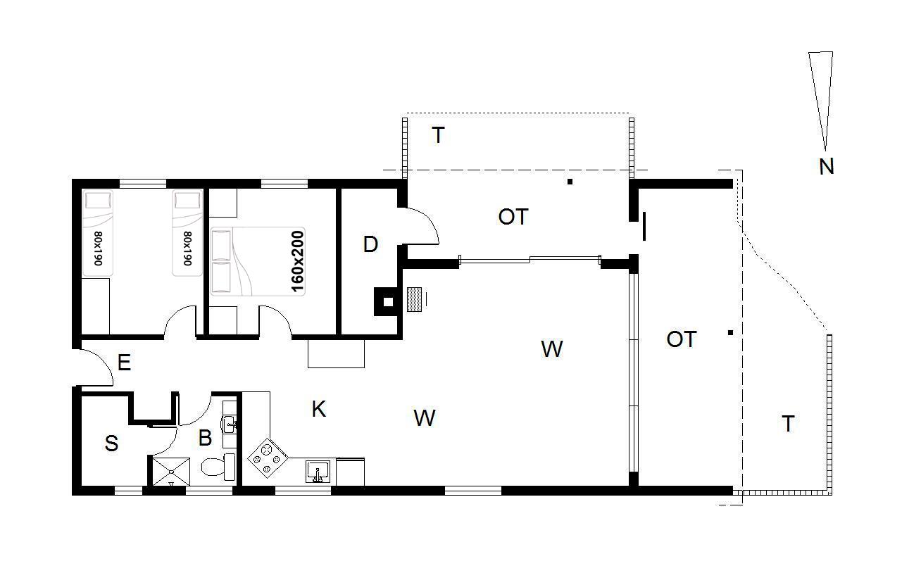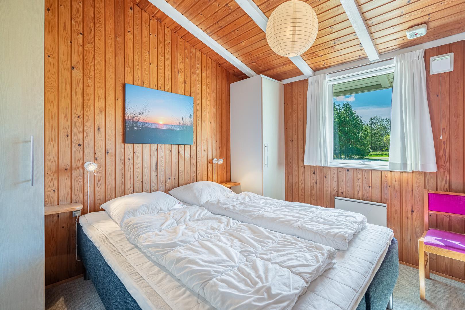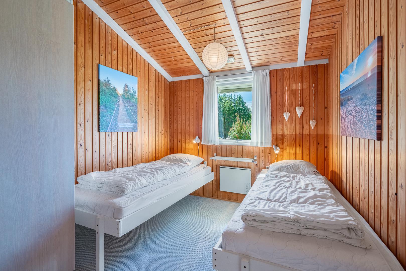 Huset rummer sovepladser til fire personer fordelt på ét soveværelse med dobbeltseng (160 x 200 cm) og ét med to enkeltsenge (80 x 190 cm), ideelt til både børn og voksne.