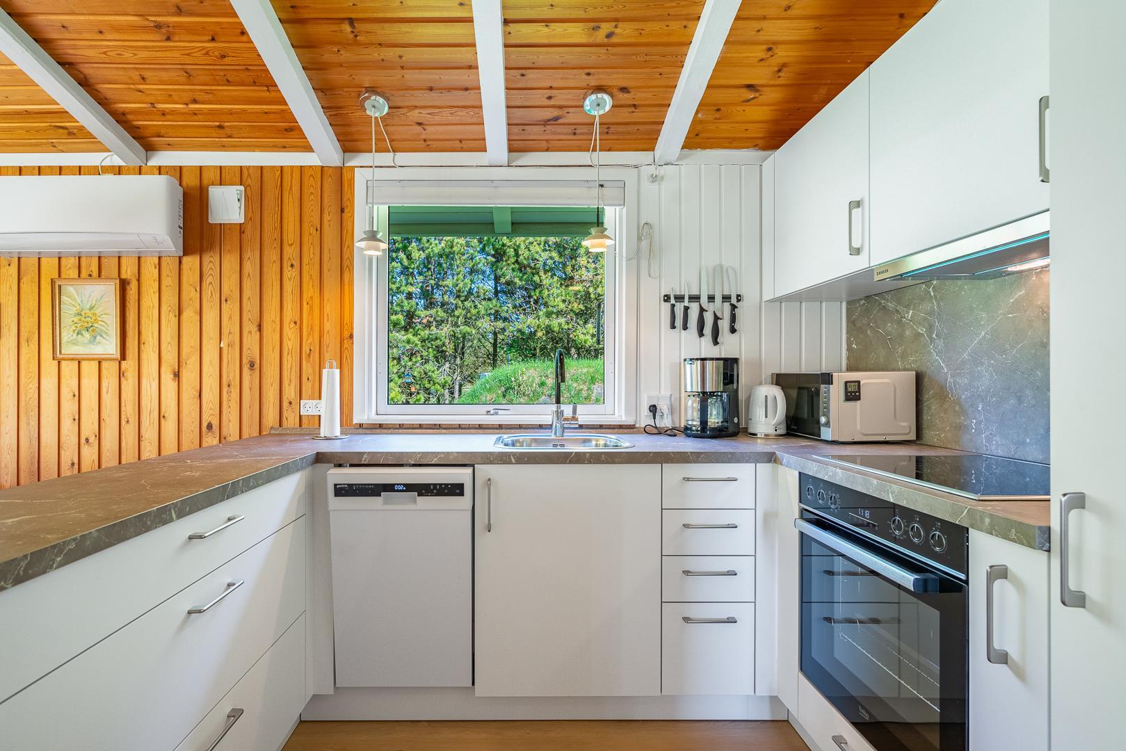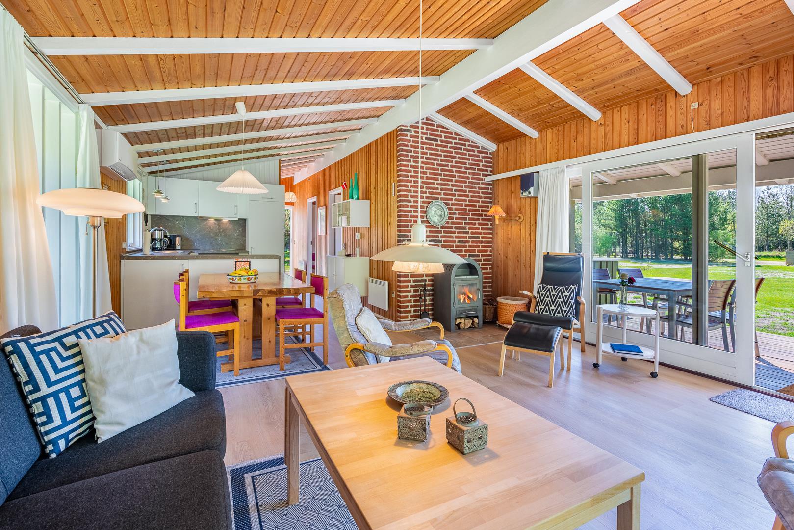 Det nye køkken fra 2025 er moderne og veludstyret, inkl. opvaskemaskine, og ligger i åben forbindelse med opholdsstuen, hvor brændeovnen sørger for varme og stemning på kølige aftener.