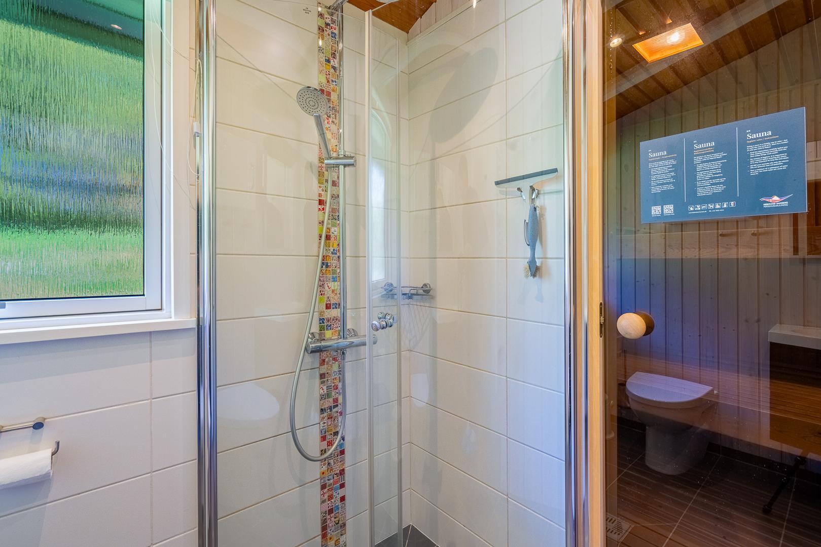 Badeværelset er nyere, flot og funktionelt med gulvvarme og adgang til egen sauna – perfekt efter en dag i naturen.