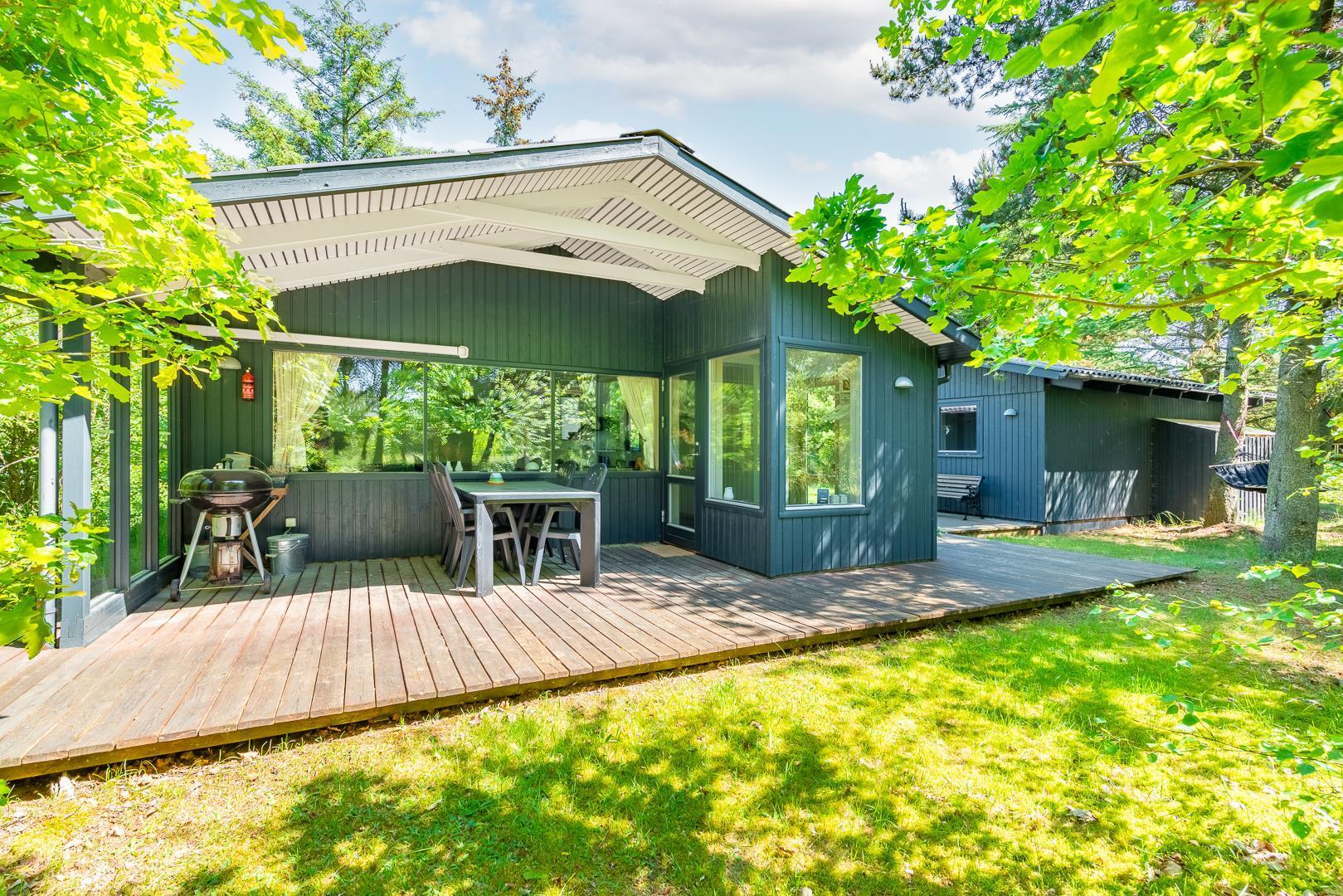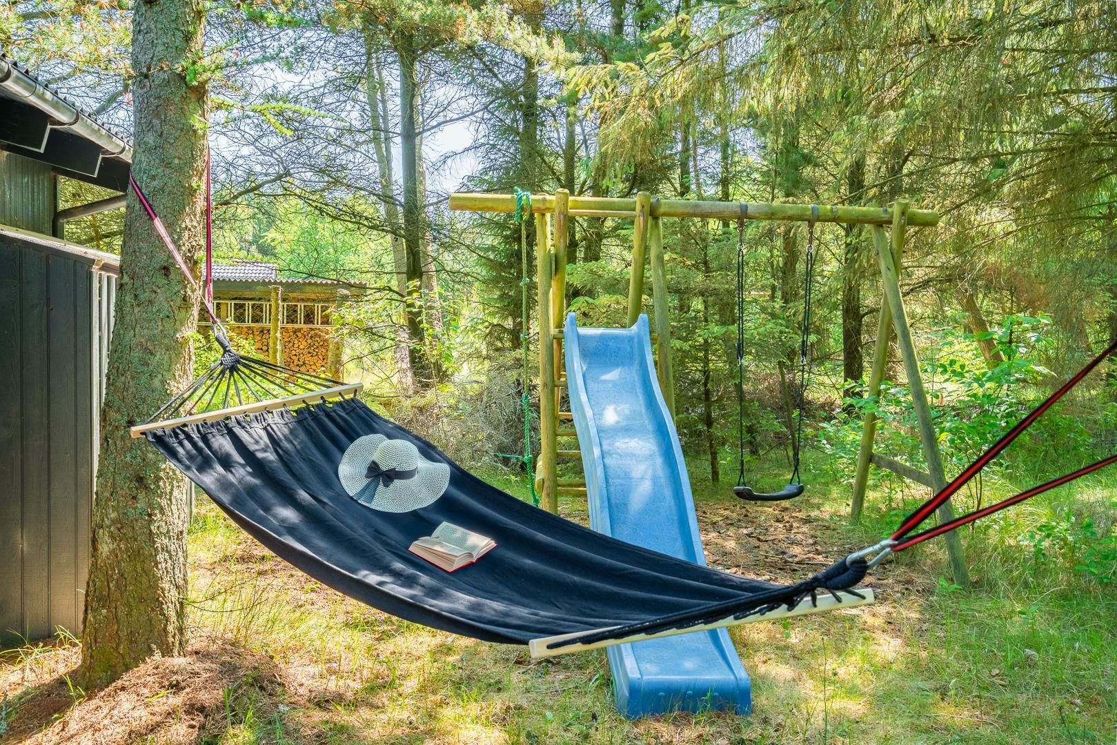 Husets store terrasse indbyder til at nyde solen dagen lang – her finder du en fantastisk terrasse midt i naturen. Med liggestole og havemøbler til rådighed kan du slappe af i solen, mens fuglene synger i trætoppene. Den overdækkede terrasse giver mulighed for at opholde sig ude, selv når vejret er mindre godt. Udenfor er der også en hyggelig hængekøje, hvor du kan smide fødderne op og slappe af under åben himmel. På de lune aftener er terrassen det perfekte sted til grillmiddage og planlægning af næste dags eventyr.