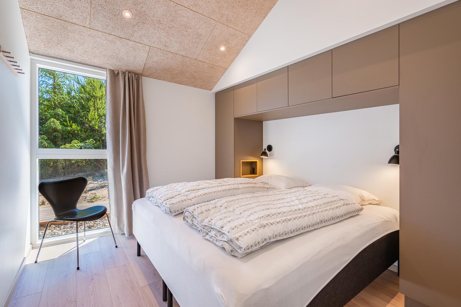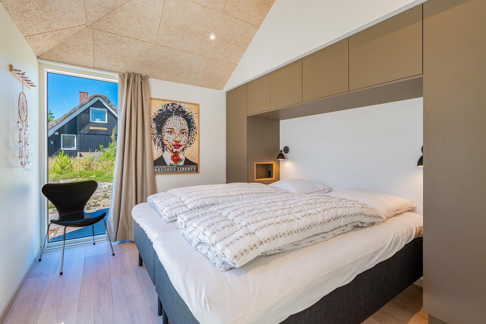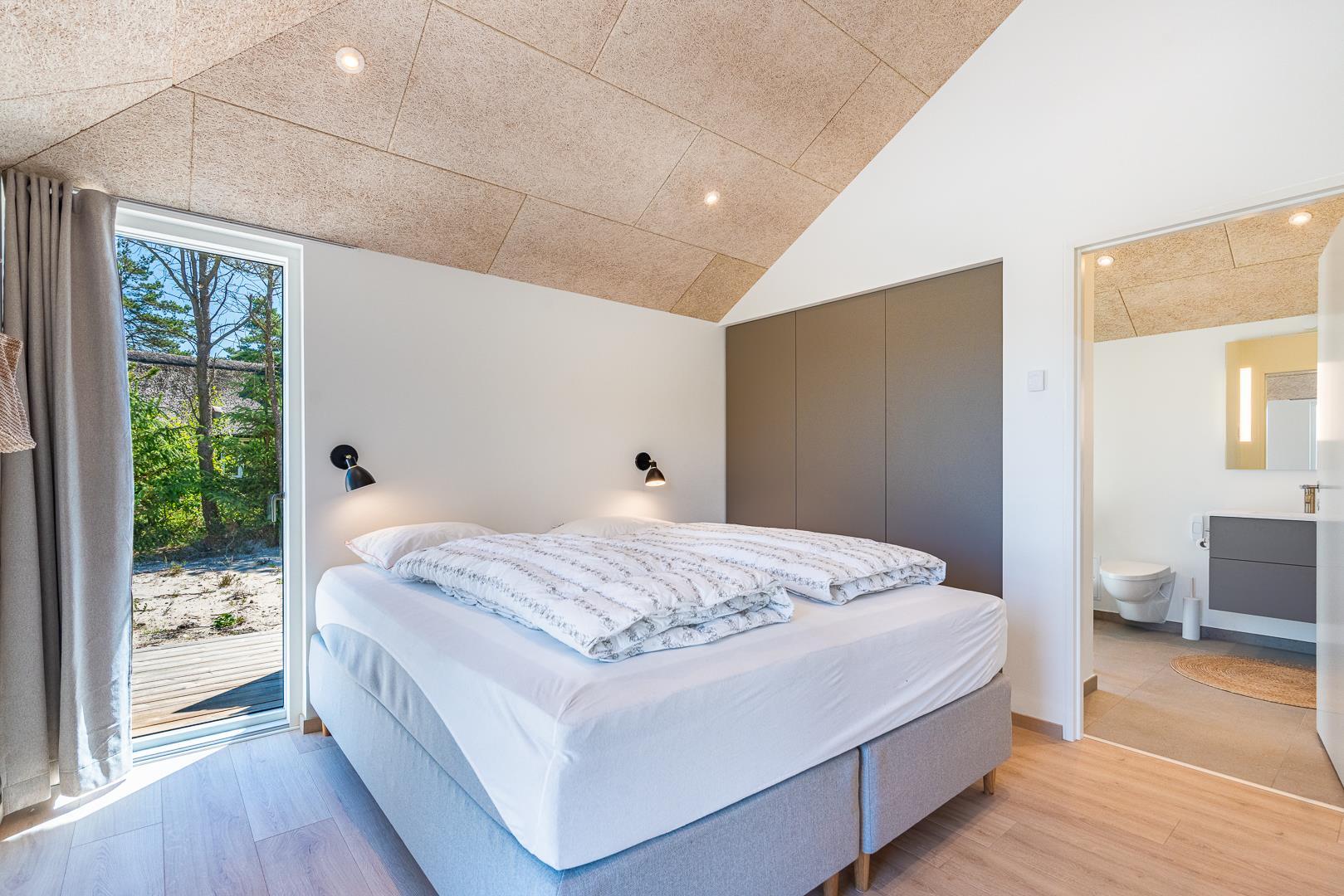 Sommerhuset rummer 4 soveværelser – alle med dobbeltsenge – samt 2 moderne badeværelser, så alle får både plads og komfort. Der er gulvvarme i hele sommerhuset, og opvarmningen sker via en energieffektiv varmepumpe, hvilket giver et behageligt indeklima året rundt.