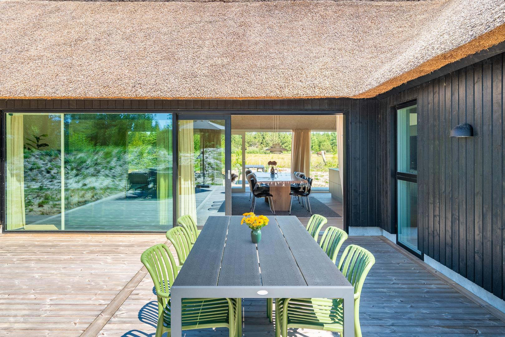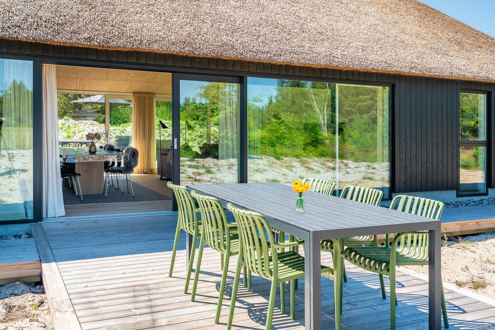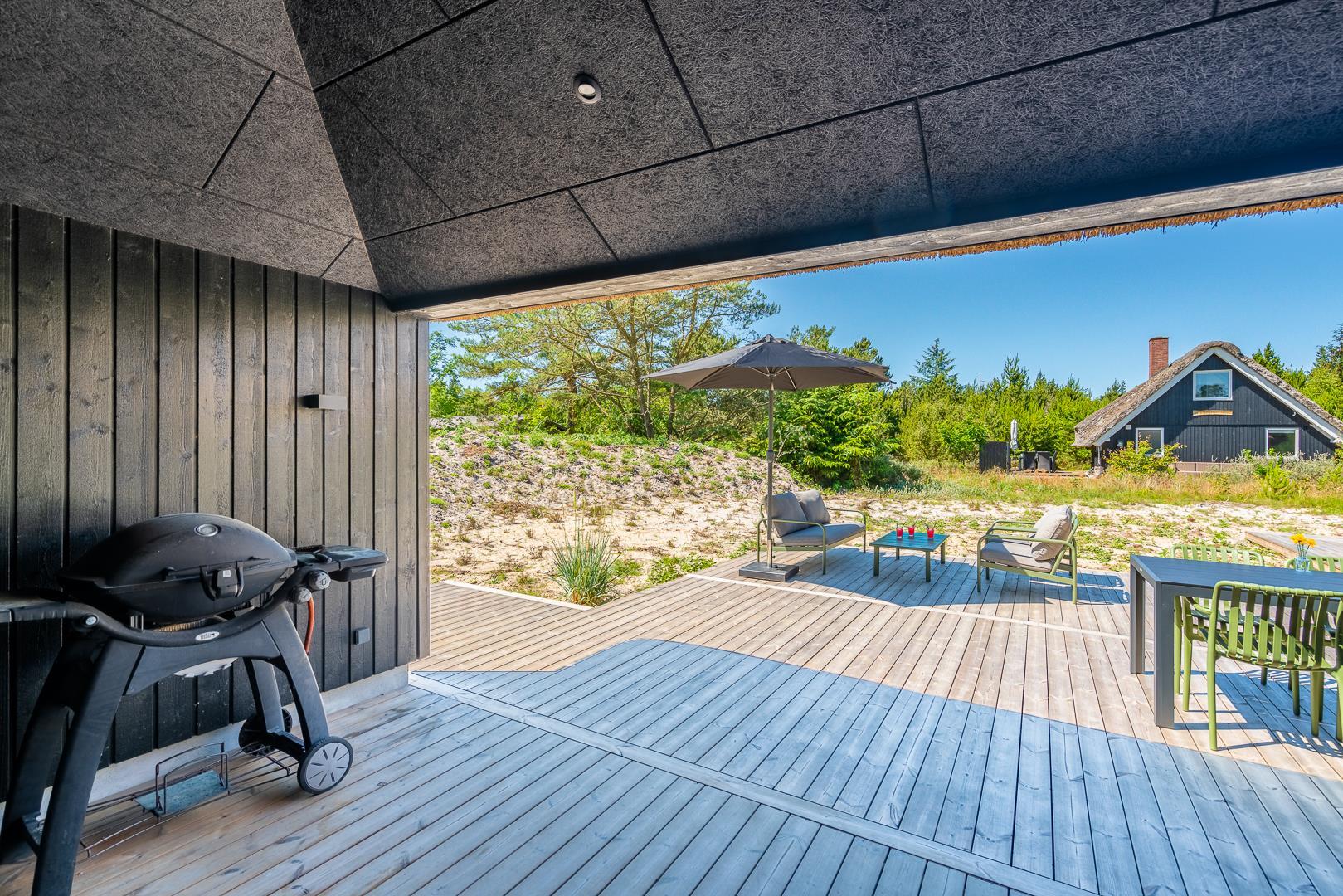 Den store, overdækkede terrasse er et af sommerhusets absolutte højdepunkter. Her kan I nyde morgenkaffen, slappe af med en god bog eller forlænge de lyse sommeraftener i læ for vind og vejr.