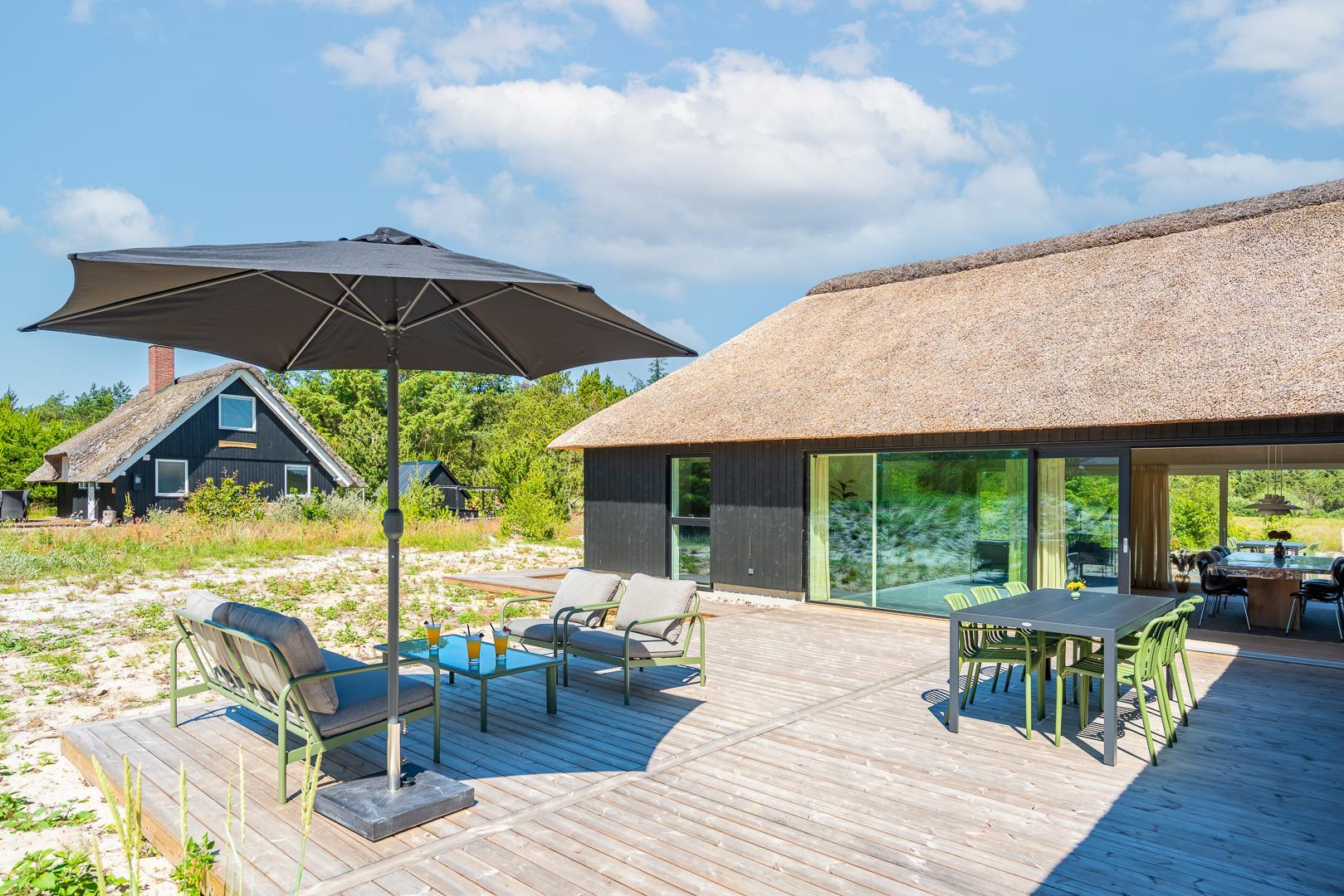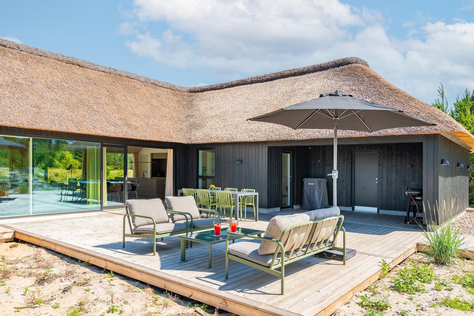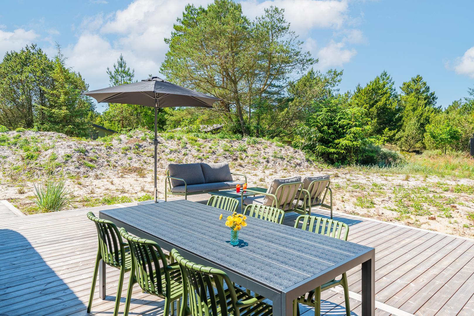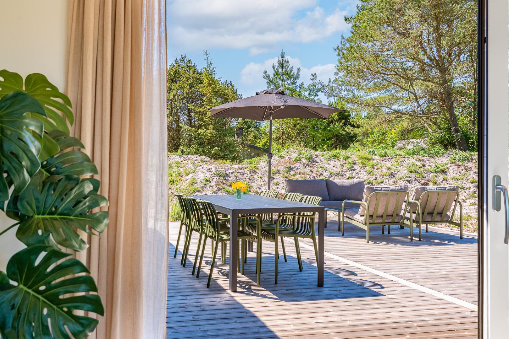 Den store, overdækkede terrasse er et af sommerhusets absolutte højdepunkter. Her kan I nyde morgenkaffen, slappe af med en god bog eller forlænge de lyse sommeraftener i læ for vind og vejr.