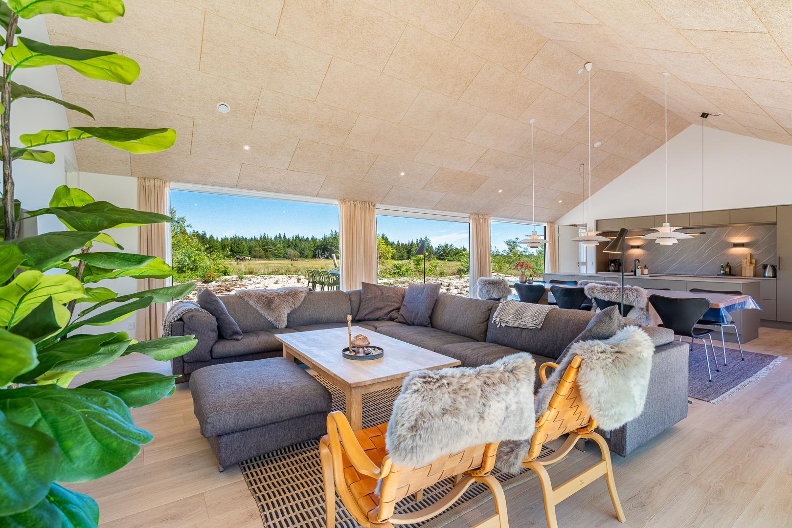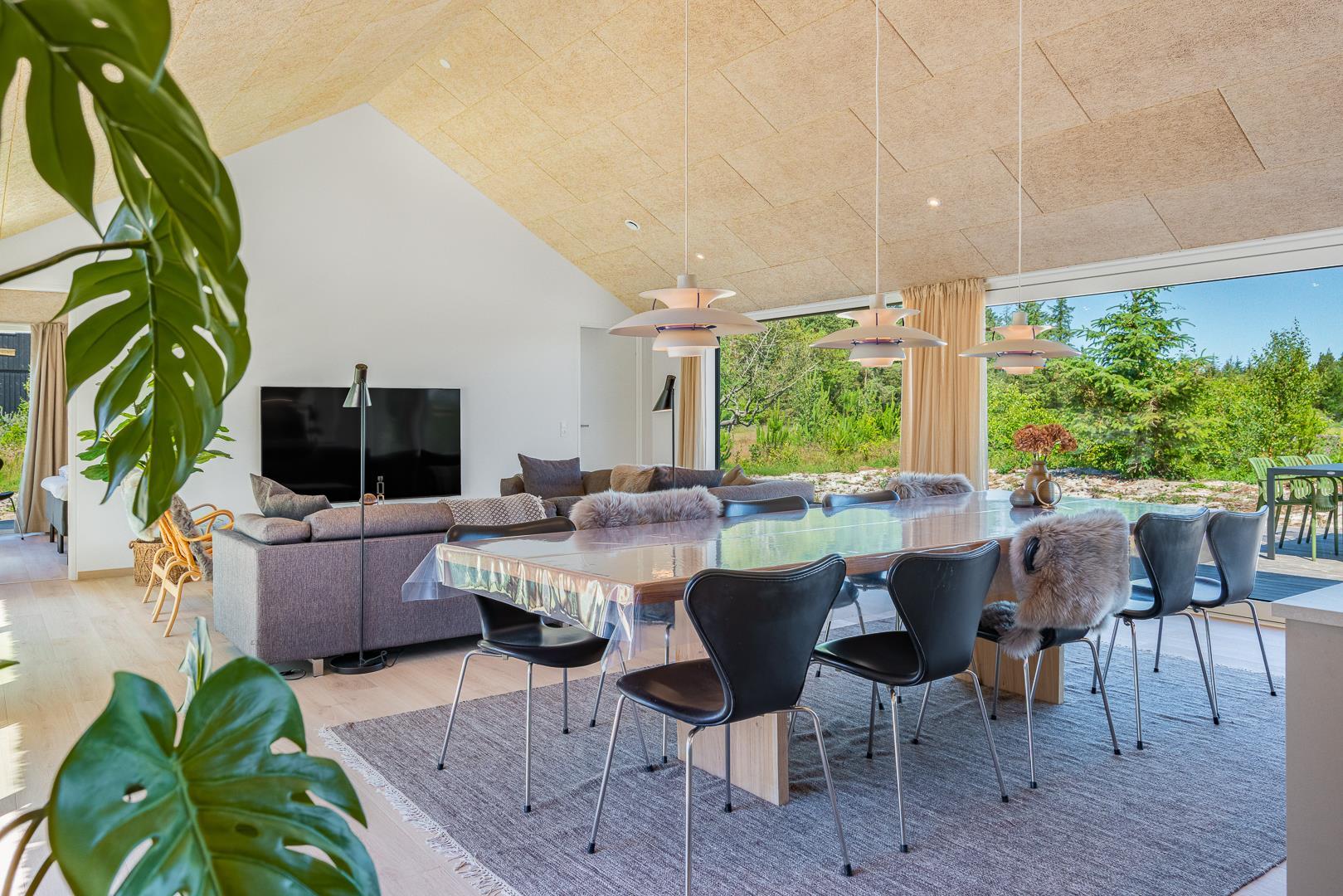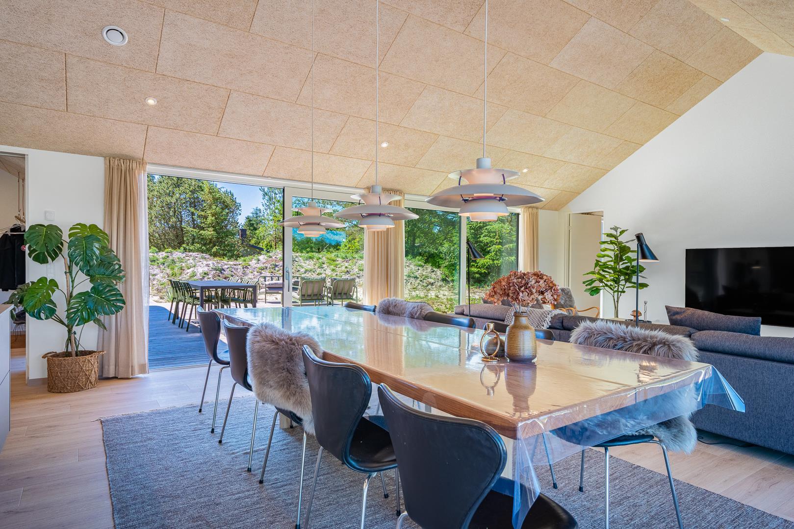 Med sine 145 m² byder sommerhuset på masser af lys, luft og gennemtænkt indretning – perfekt til en afslappende ferie med familie eller venner i de naturskønne omgivelser tæt på Vesterhavet.