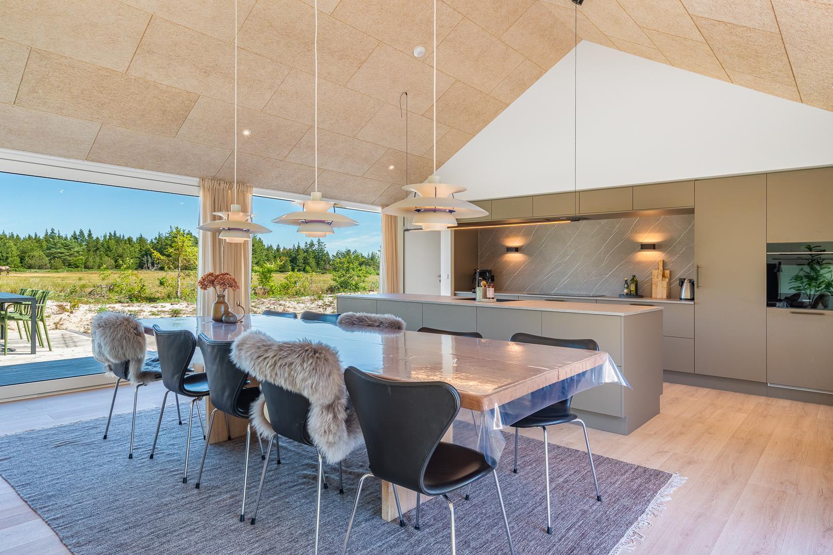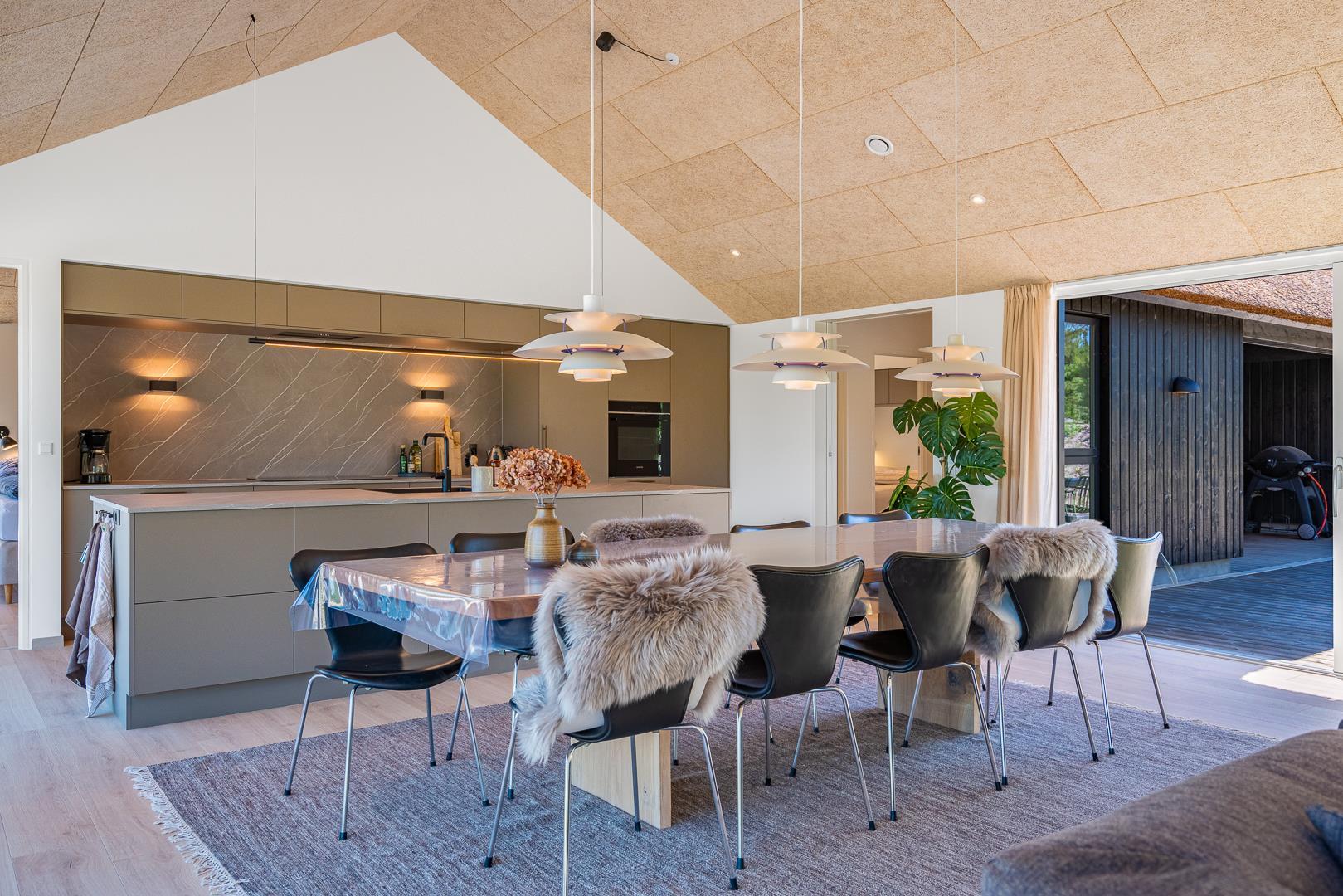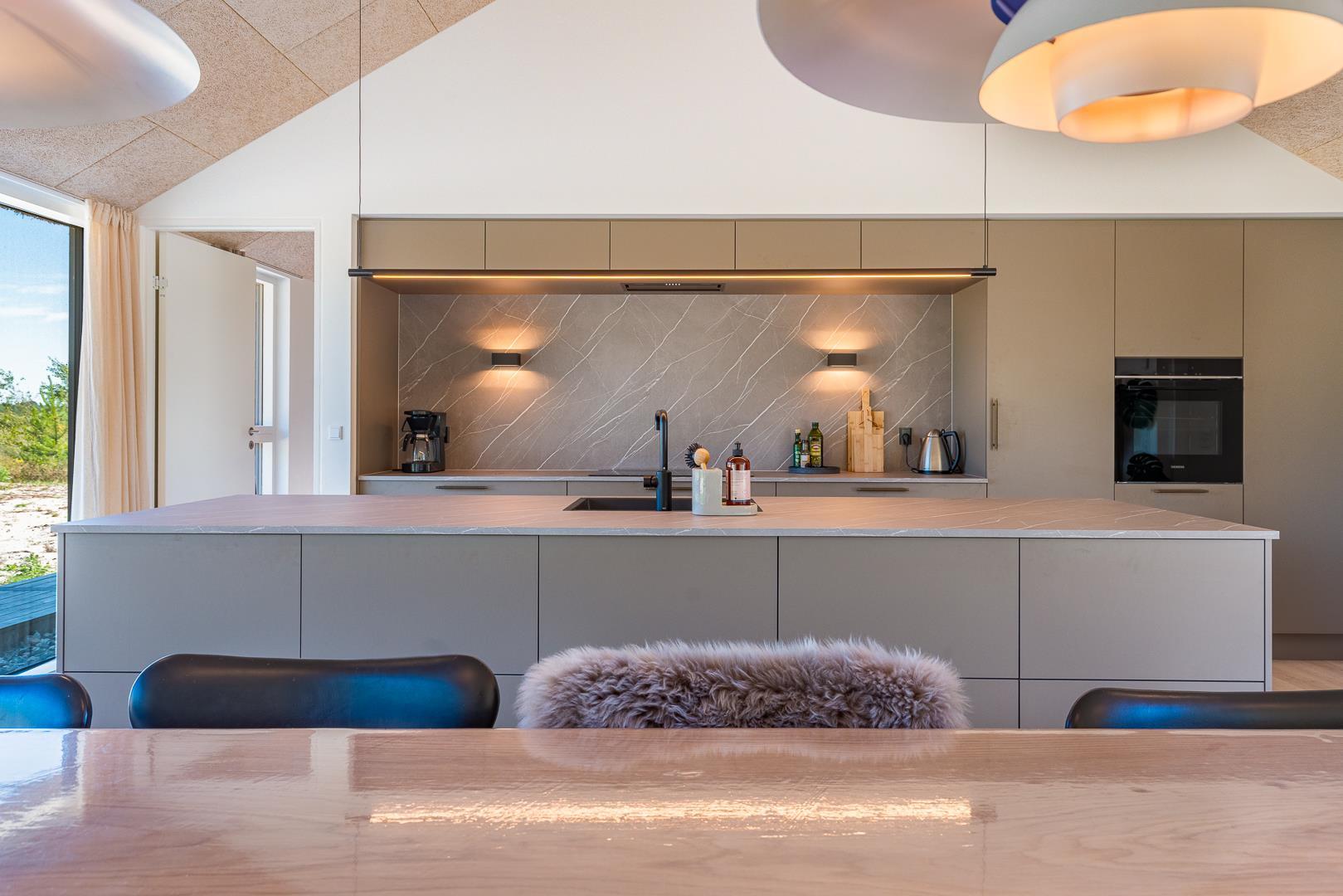 Det store, åbne køkken er fuldt udstyret og har god plads til fælles madlavning. Her kan I samles om både mad og hyggelige stunder. Stuen og spiseområdet ligger i forlængelse af køkkenet og skaber et naturligt samlingspunkt – uanset om aftenen står på brætspil, afslapning eller en god film på sofaen.