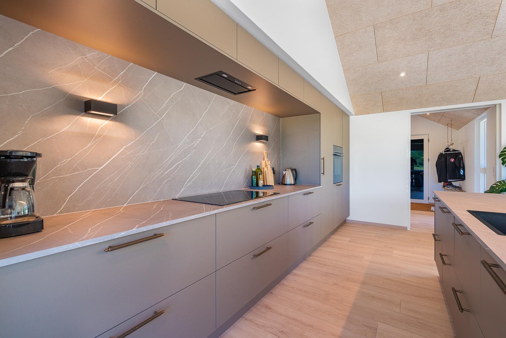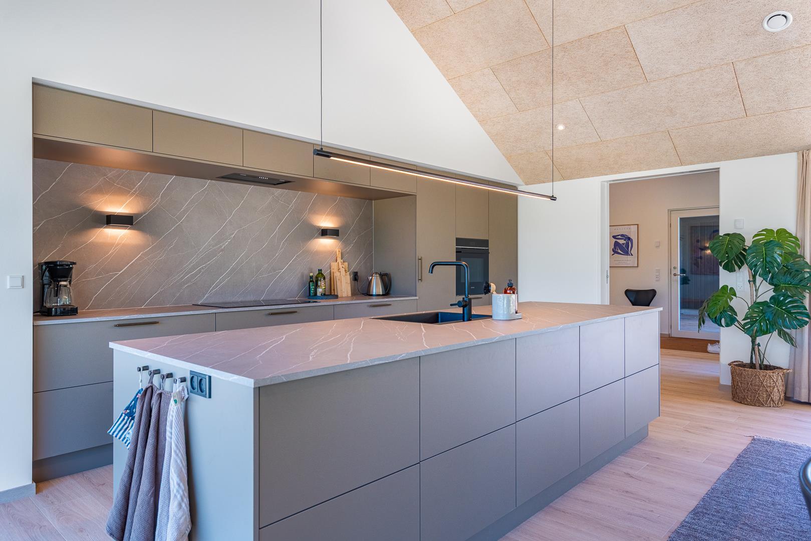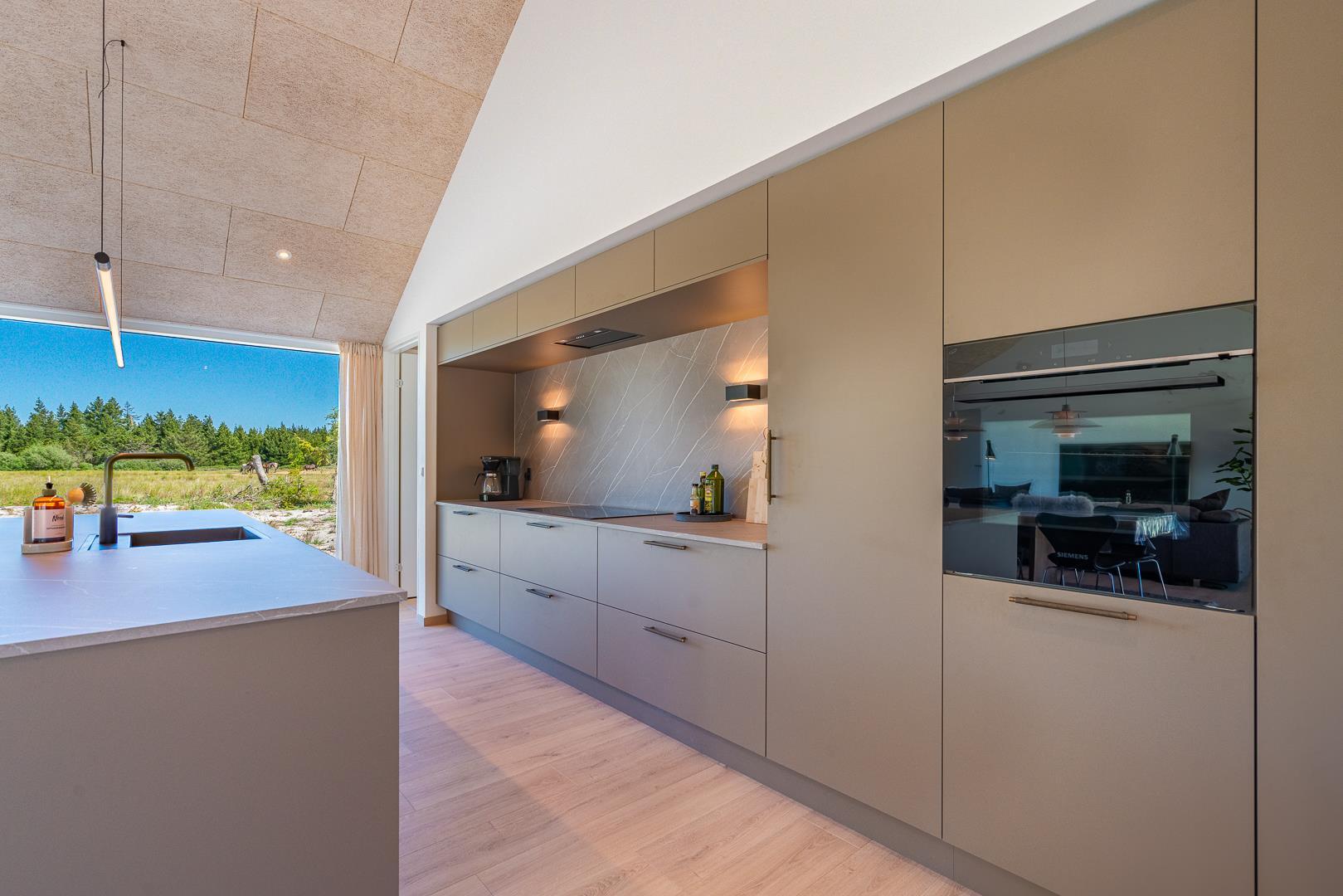 Det store, åbne køkken er fuldt udstyret og har god plads til fælles madlavning. Her kan I samles om både mad og hyggelige stunder. Stuen og spiseområdet ligger i forlængelse af køkkenet og skaber et naturligt samlingspunkt – uanset om aftenen står på brætspil, afslapning eller en god film på sofaen.