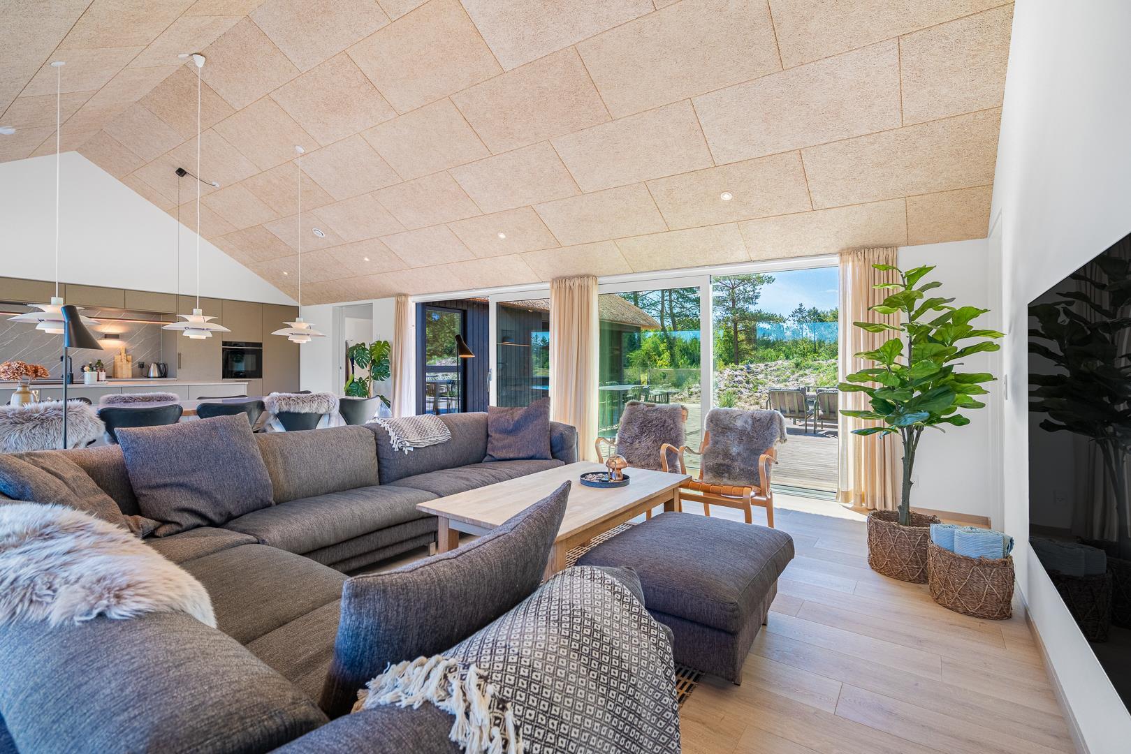 Det lyse opholdsrum er indrettet i moderne, skandinavisk stil, der kombinerer funktionalitet og hygge på bedste vis.