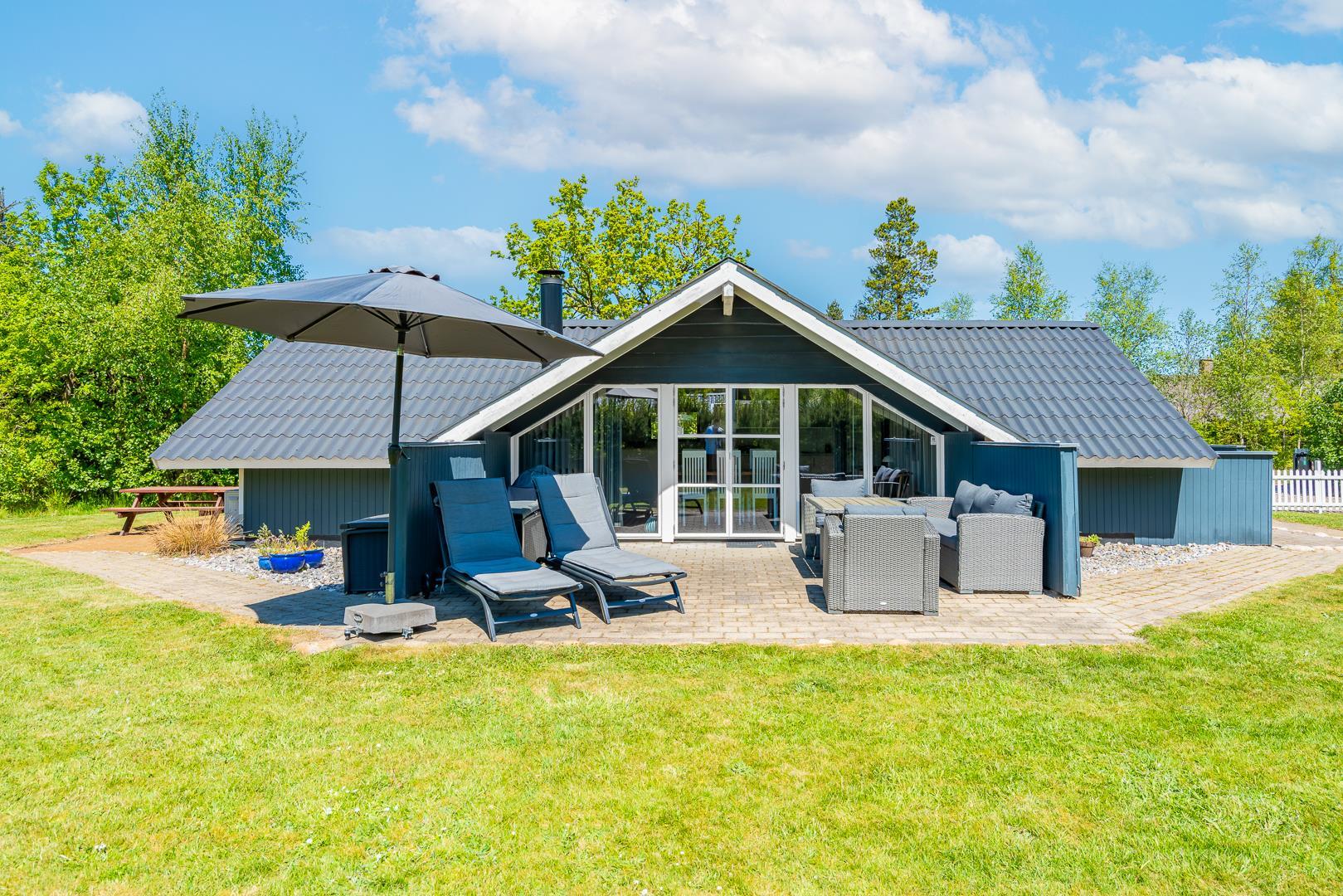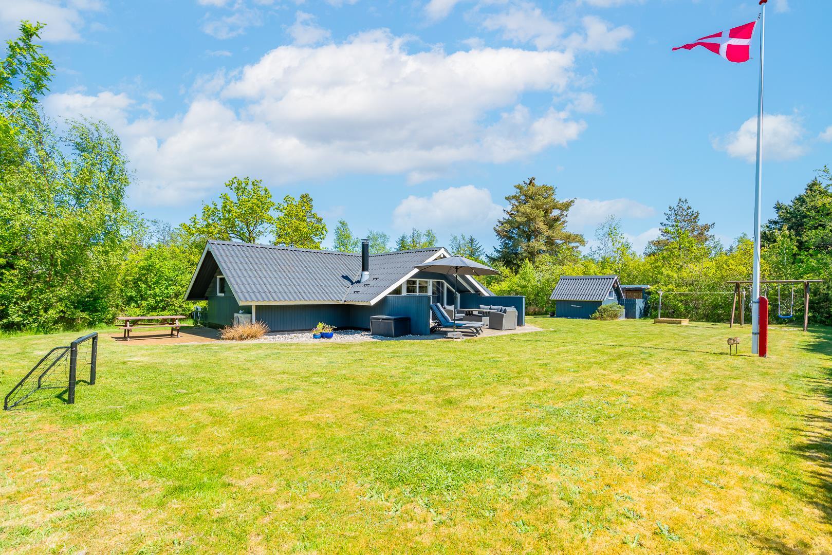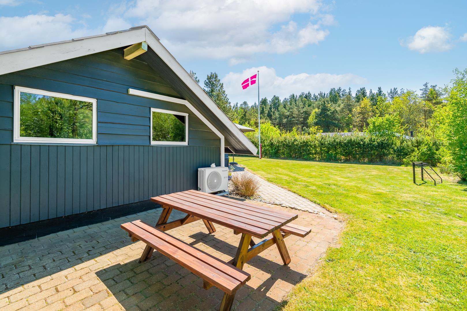 Dette indbydende feriehus i træ ligger på en dejlig, lukket naturgrund med græsplæne – omgivet af høje træer, der giver god læ og privatliv. Huset har hele tre solrige terrasser som er godt afskærmet – perfekte til både afslapning, måltider og udeliv. Grunden er indhegnet, så dine hunde kan færdes frit og sikkert.