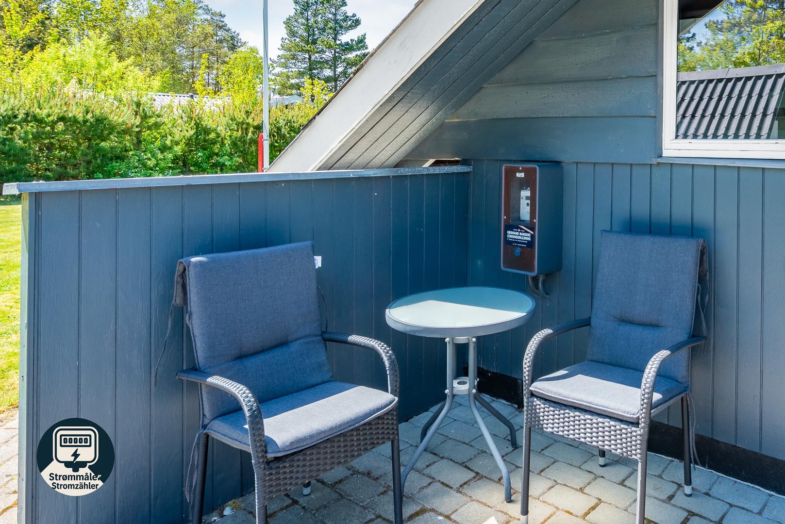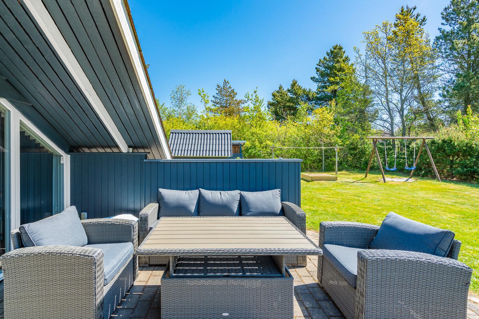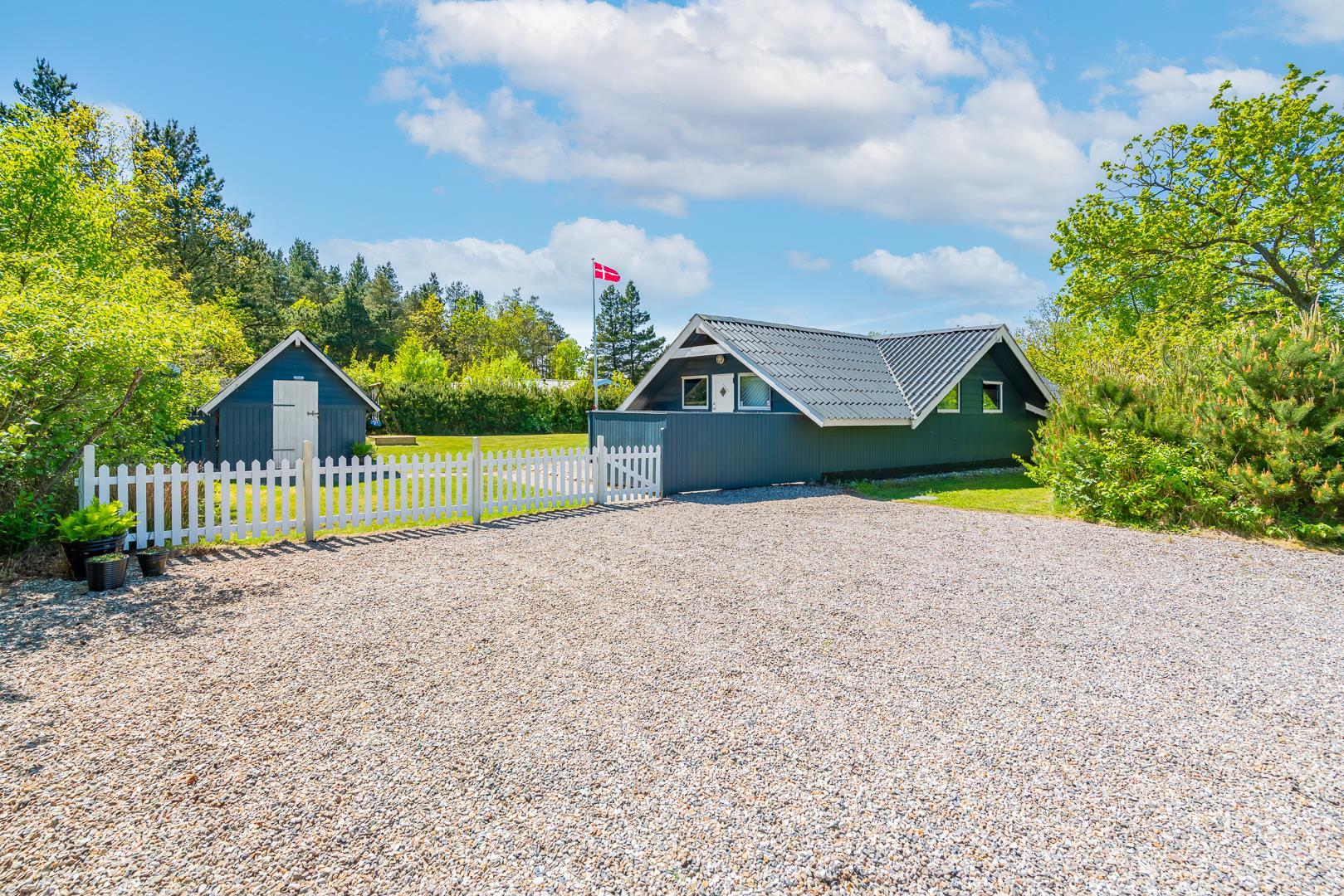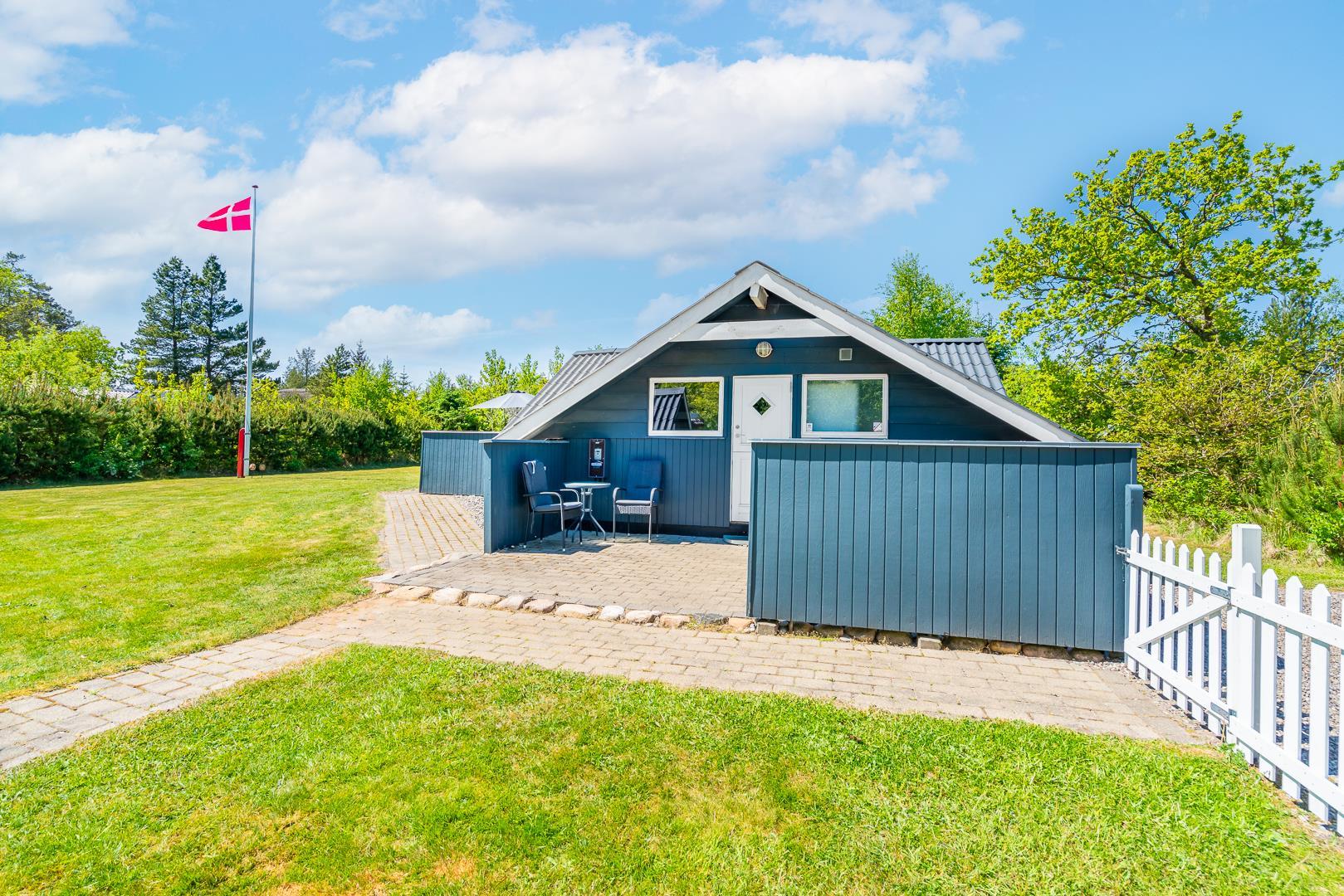 Dette indbydende feriehus i træ ligger på en dejlig, lukket naturgrund med græsplæne – omgivet af høje træer, der giver god læ og privatliv. Huset har hele tre solrige terrasser som er godt afskærmet – perfekte til både afslapning, måltider og udeliv. Grunden er indhegnet, så dine hunde kan færdes frit og sikkert.
