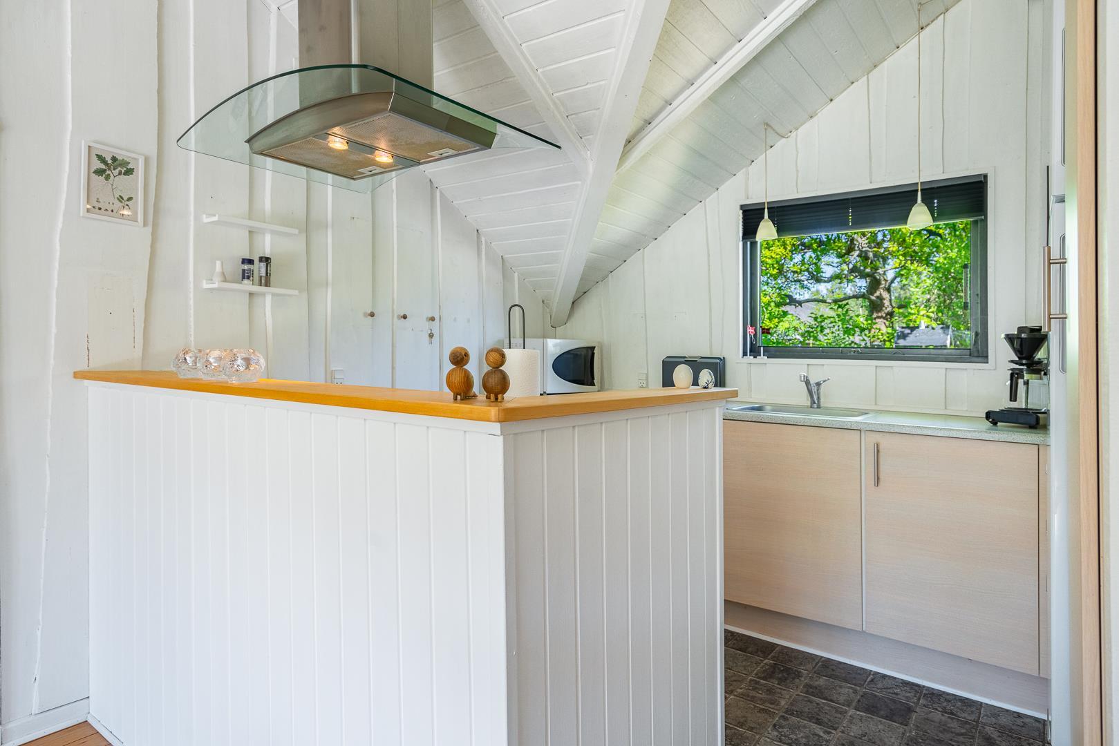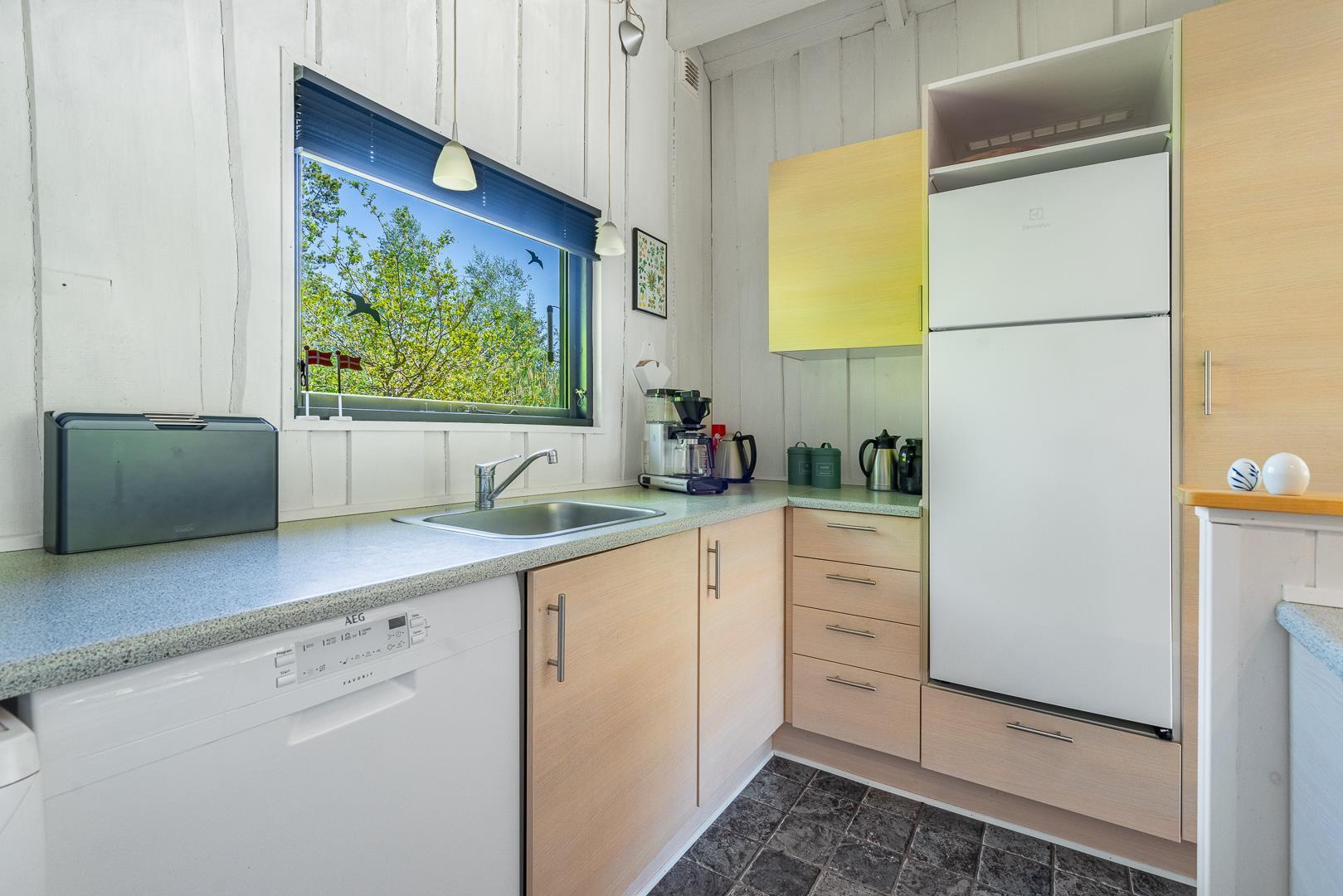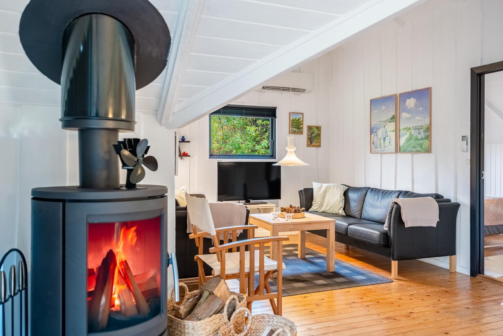 Huset fremstår meget velholdt og er smagfuldt indrettet. Det funktionelle køkken er udstyret med keramisk komfur, mikroovn og opvaskemaskine – og ligger i åben forbindelse med den lyse opholdsstue. Her er komfortable møbler og en brændeovn til hygge.