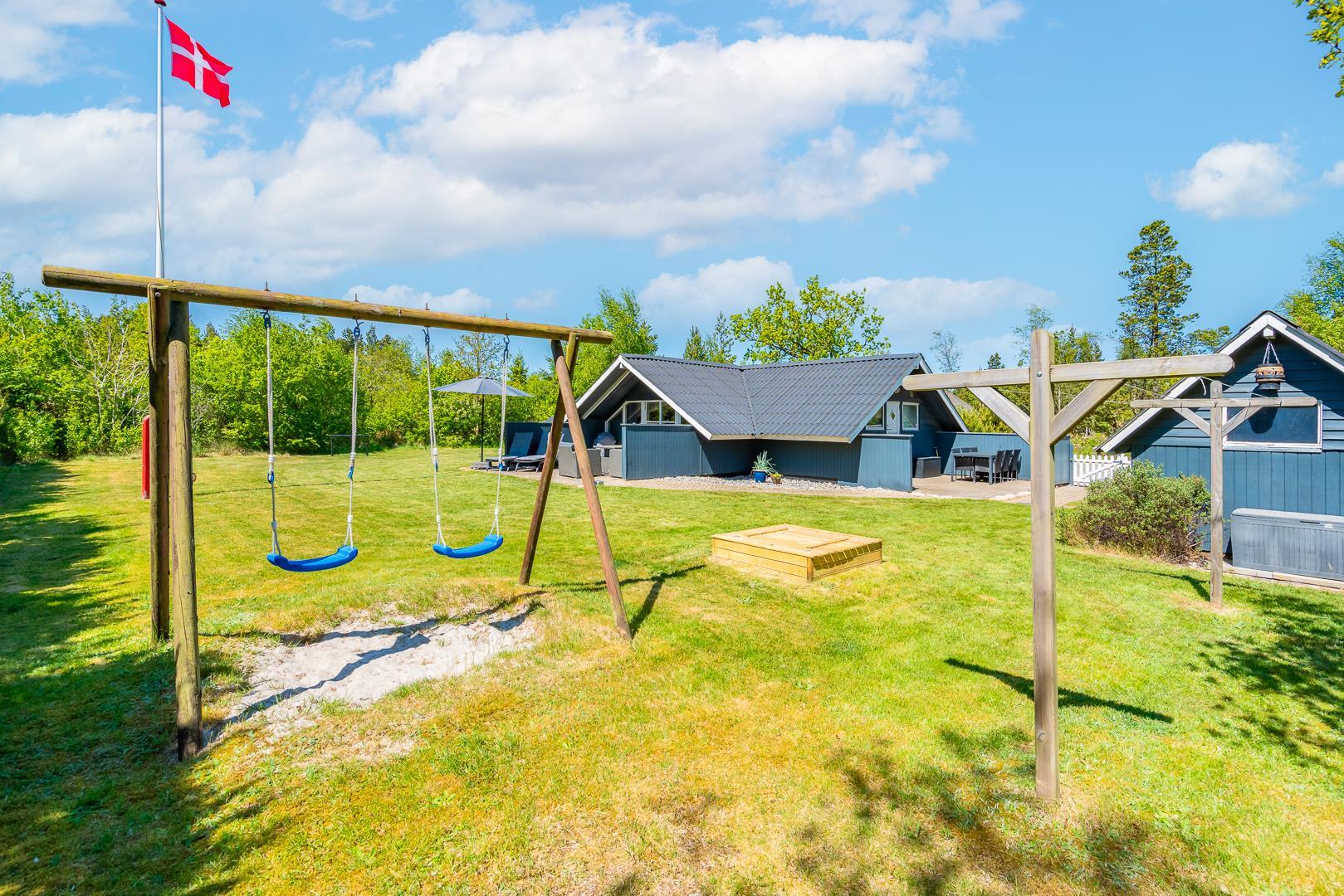 Kun tre minutters gang fra huset finder du en stor offentlig skovlegeplads – perfekt til børn og aktive familier. På den indhegnede grund er der også gynge og sandkasse til de mindste gæster. Dette feriehus er et oplagt valg for jer, der ønsker en afslappende ferie i rolige, naturskønne omgivelser – med plads til både børn og hunde.