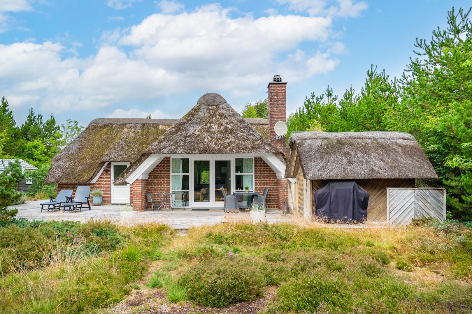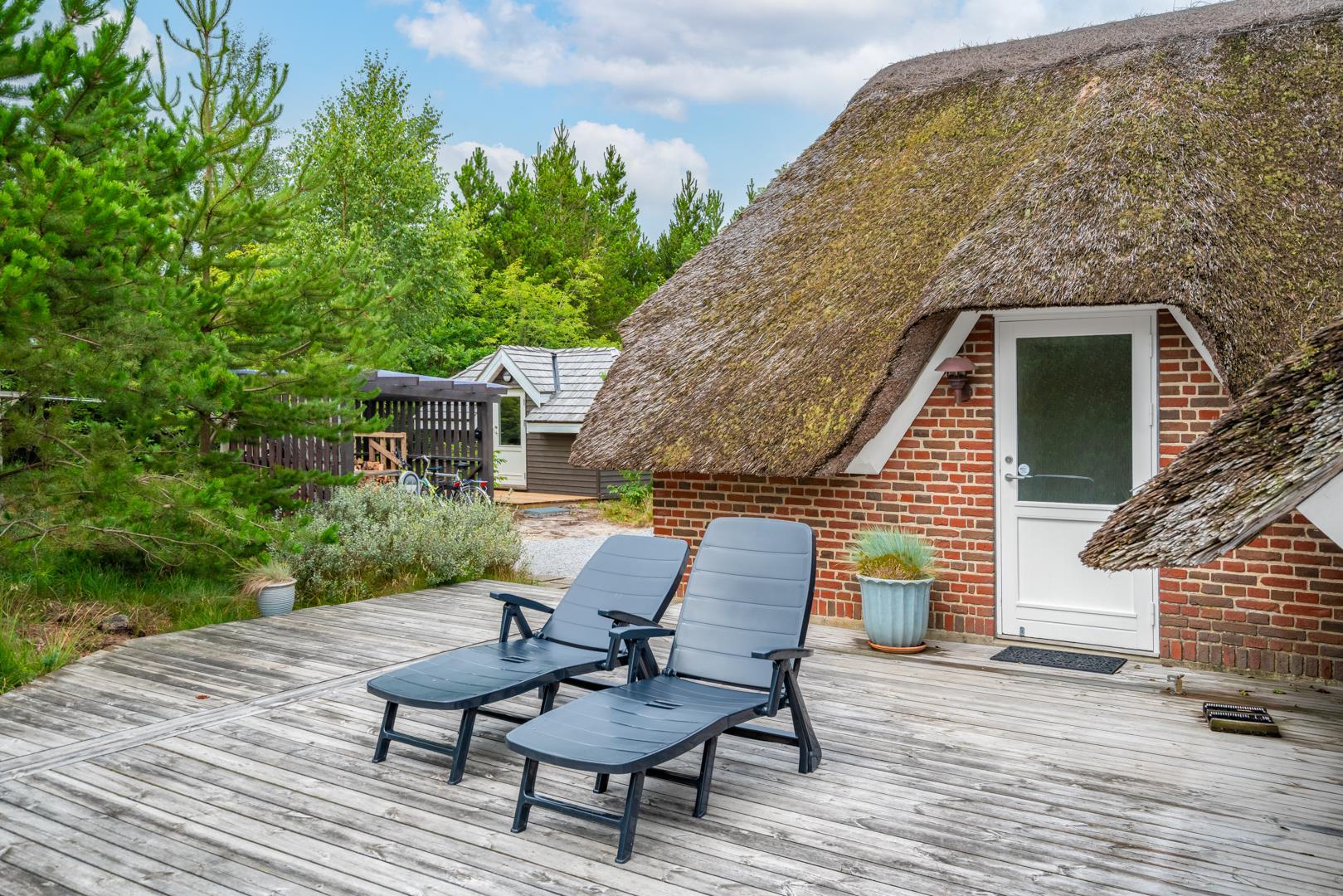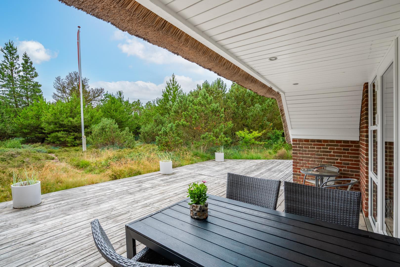 Udenfor kan I nyde den store, overdækkede terrasse, hvor I både kan spise morgenmad i det fri og hygge jer om aftenen – uanset vejret. Her er god plads til at trække vejret, lade børnene lege og bare være sammen. Grunden er omgivet af natur, hvilket giver både ro og privatliv.