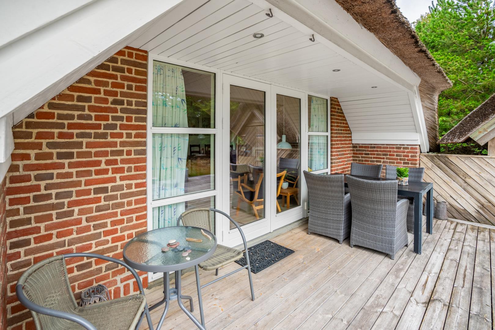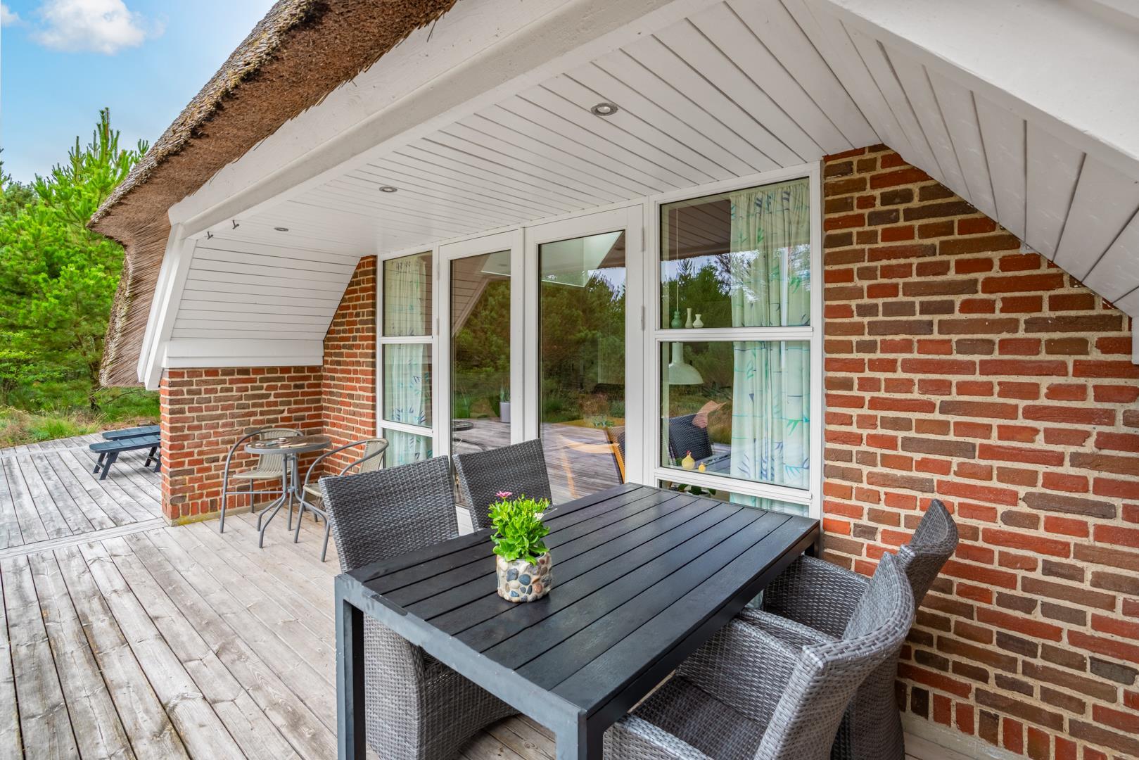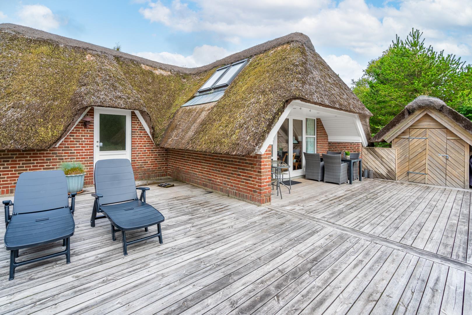 Udenfor kan I nyde den store, overdækkede terrasse, hvor I både kan spise morgenmad i det fri og hygge jer om aftenen – uanset vejret. Her er god plads til at trække vejret, lade børnene lege og bare være sammen. Grunden er omgivet af natur, hvilket giver både ro og privatliv.