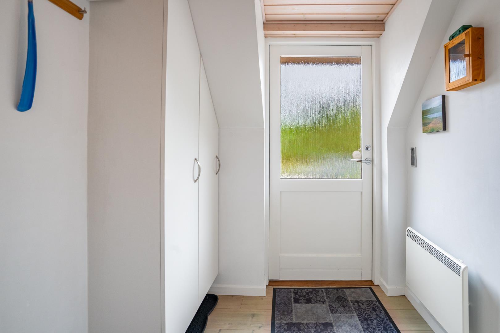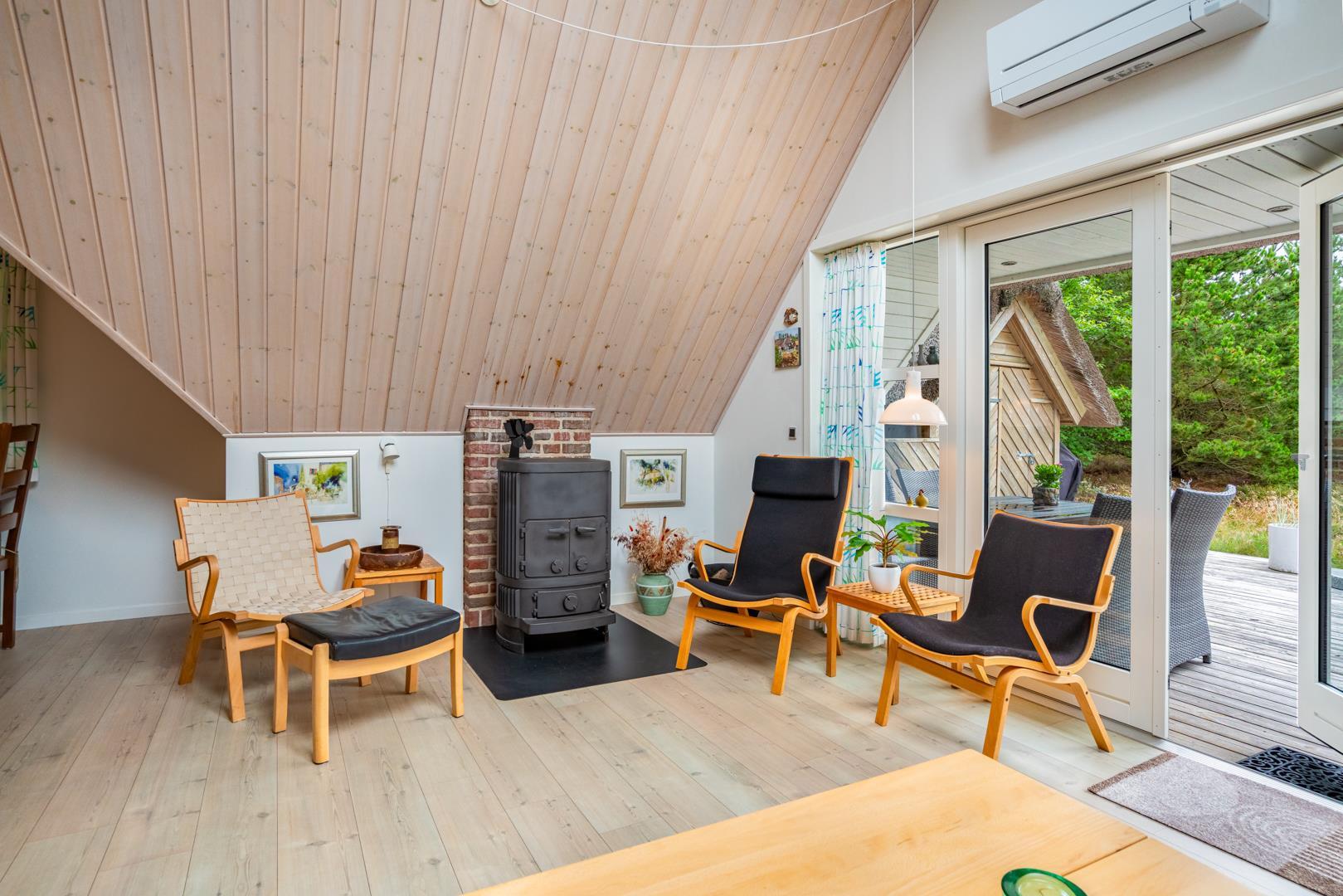 Indenfor venter jer 86 m² med en velindrettet stue, hvor brændeovnen skaber varme og hygge, især når det rusker udenfor. Huset har en moderne varmepumpe, så temperaturen er behagelig året rundt.