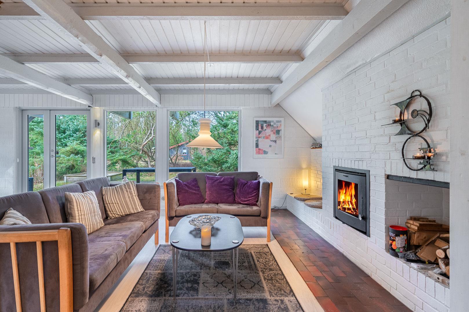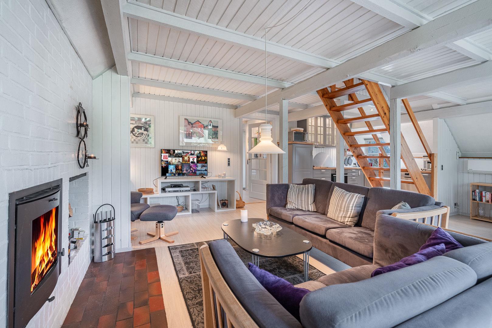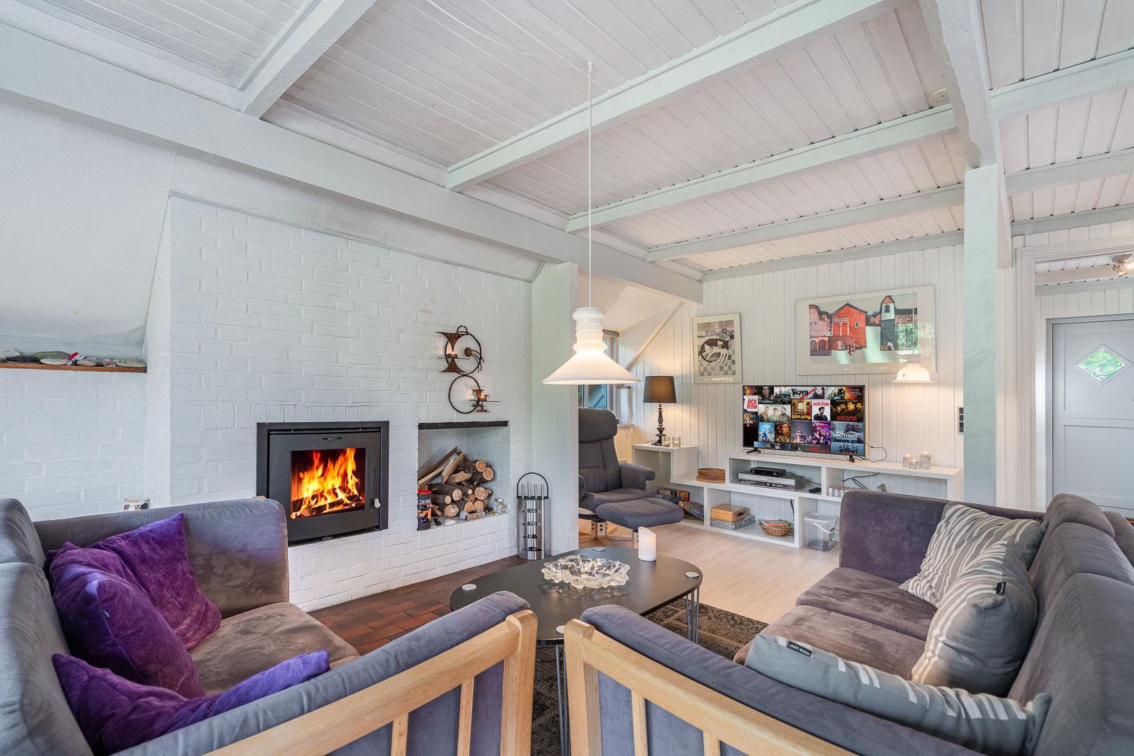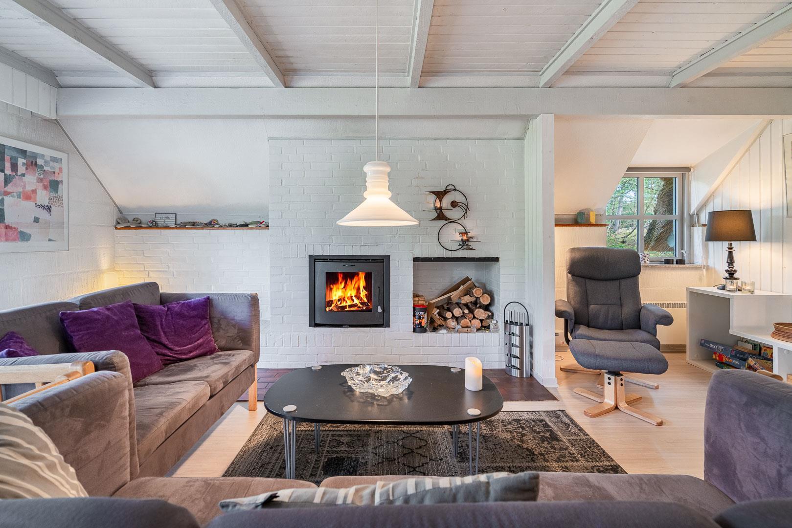 Den lyse stue har brændeovn – så der er dømt hygge på kolde dage. Smæk benene op, sæt en film på via Chromecast og nyd aftenen med familien. I det moderne køkken finder I selvfølgelig opvaskemaskine, så I kan bruge tiden på det sjove og ikke opvasken.