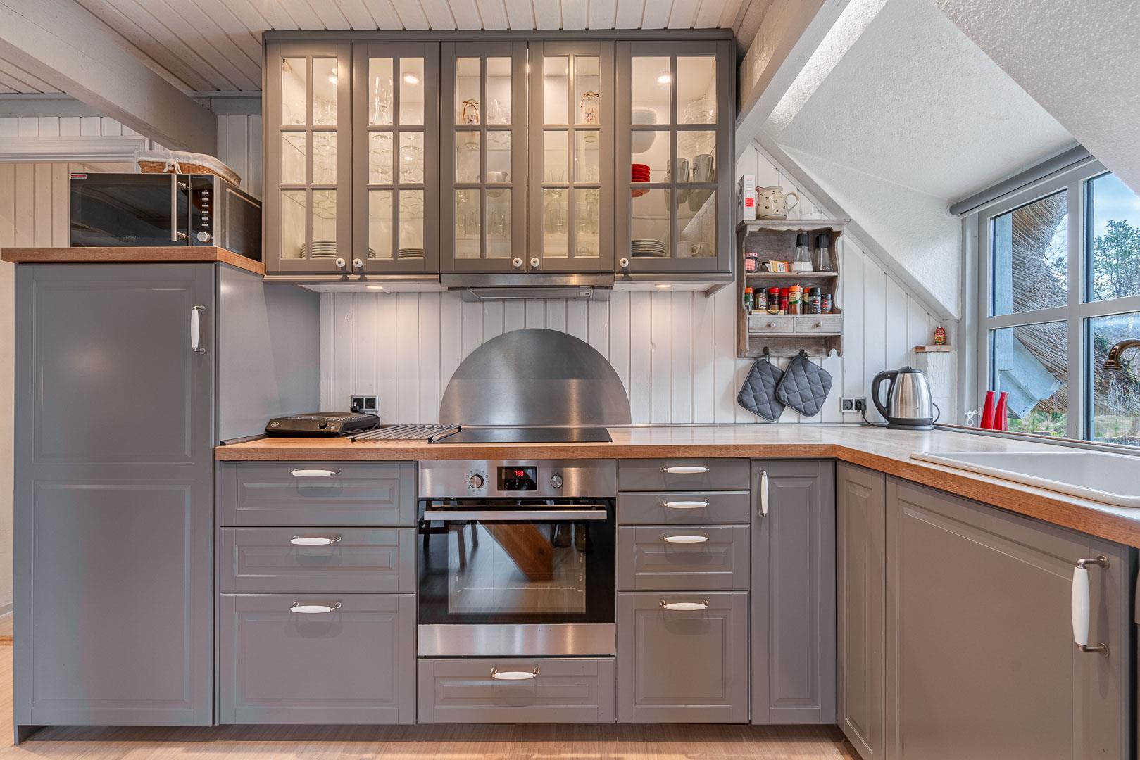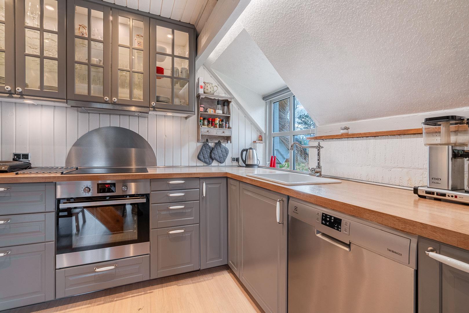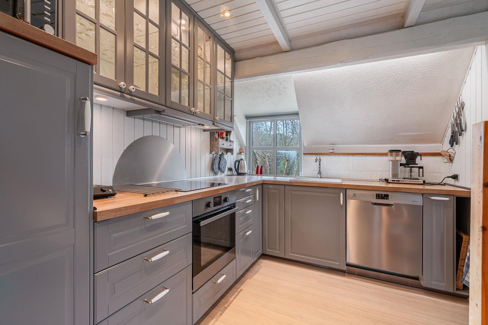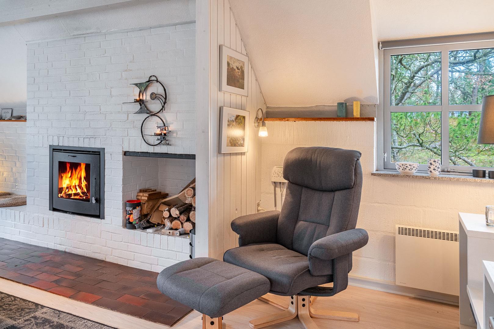 Den lyse stue har brændeovn – så der er dømt hygge på kolde dage. Smæk benene op, sæt en film på via Chromecast og nyd aftenen med familien. I det moderne køkken finder I selvfølgelig opvaskemaskine, så I kan bruge tiden på det sjove og ikke opvasken.
