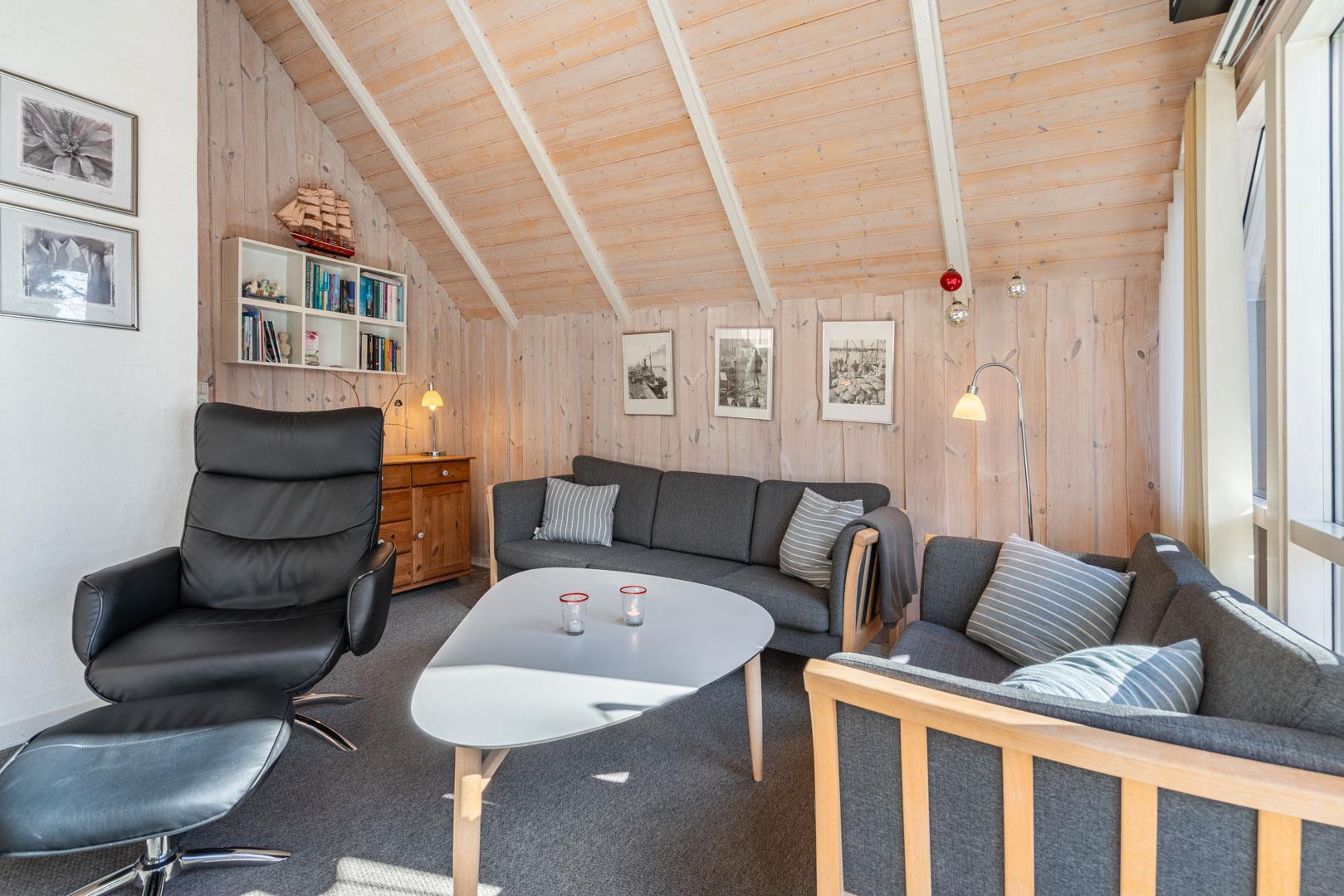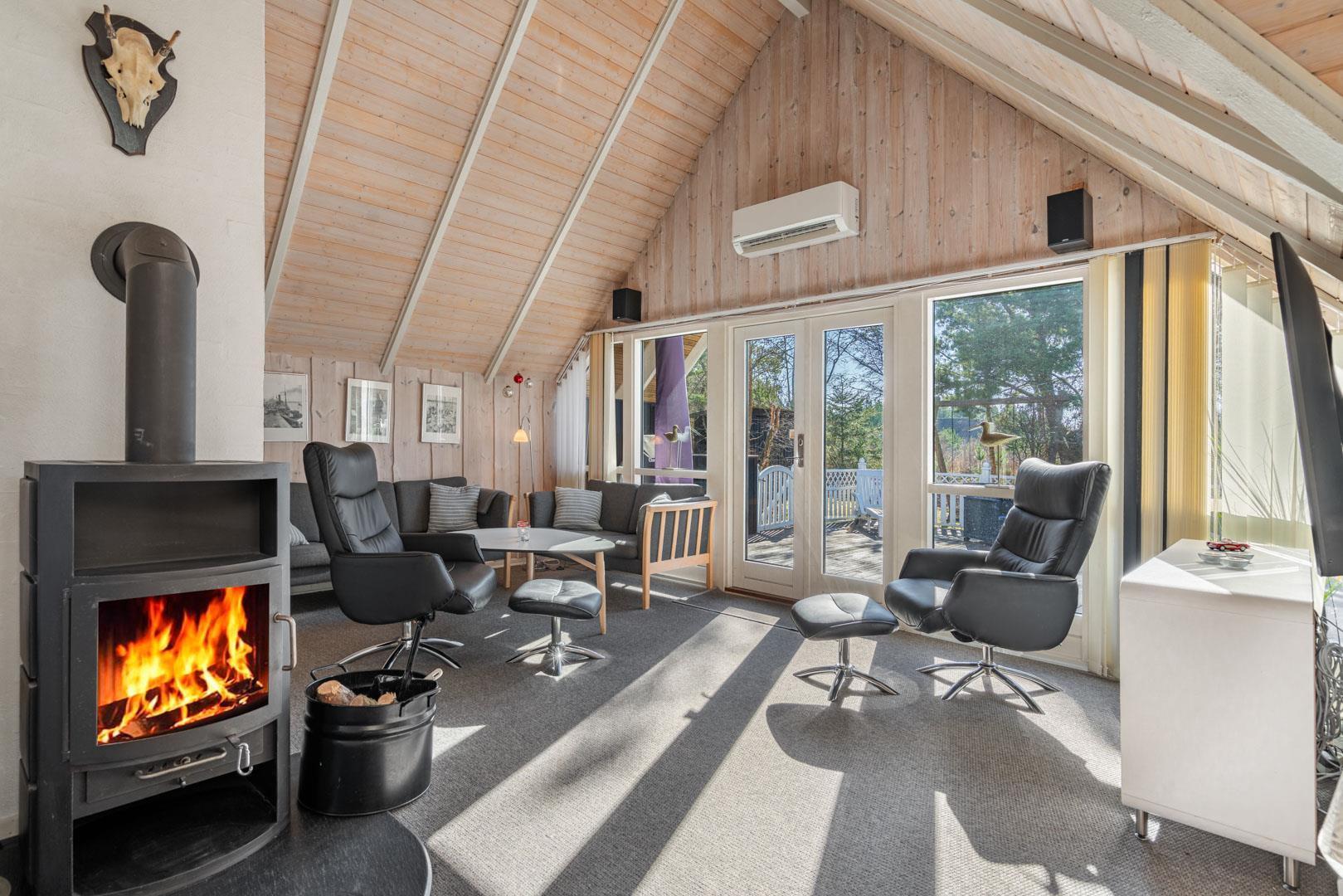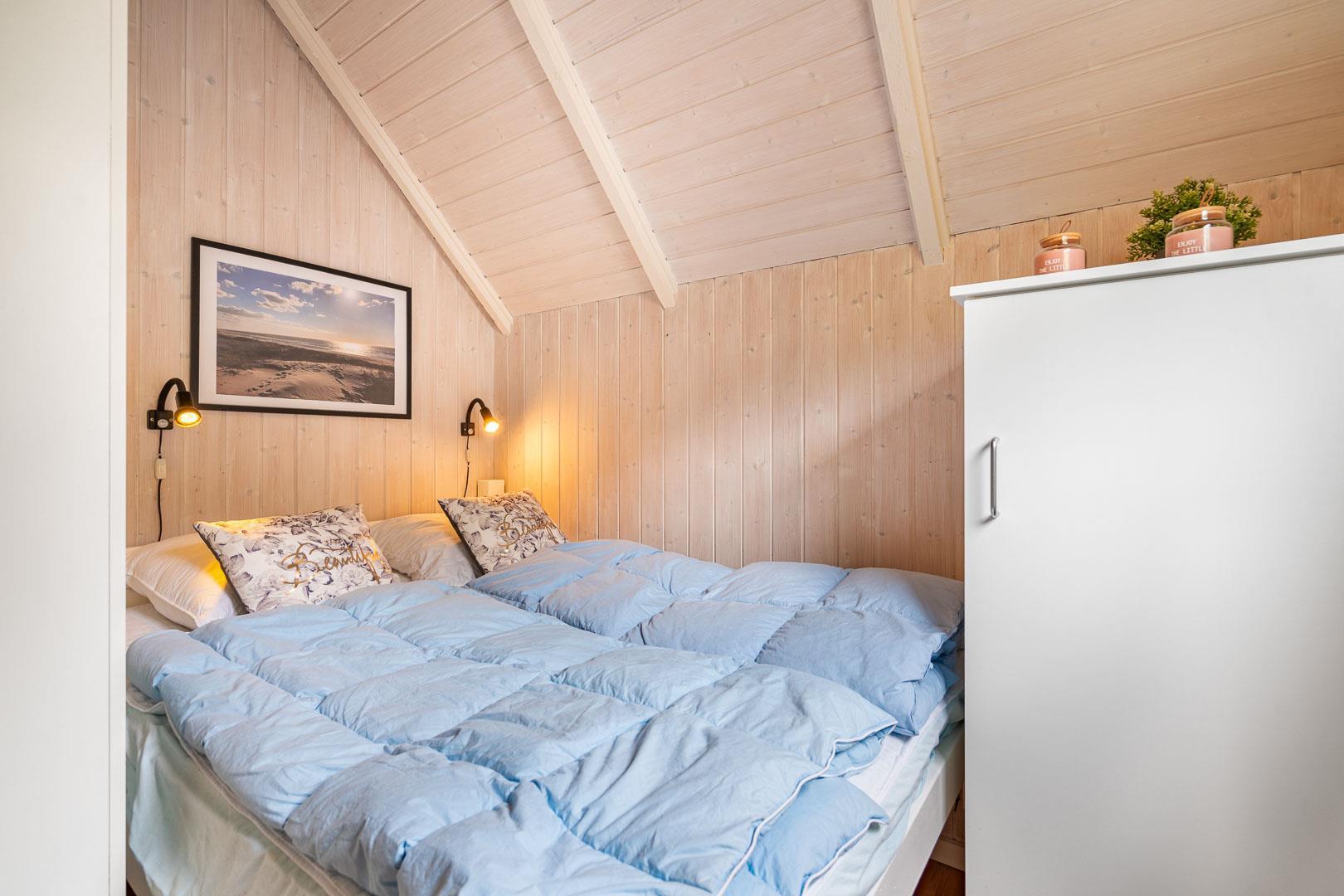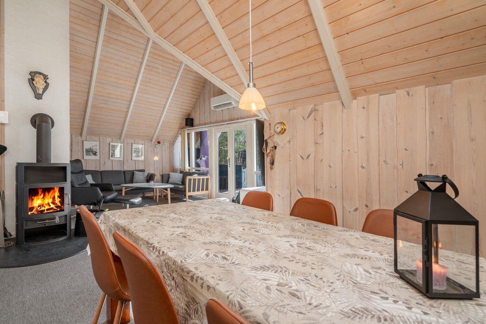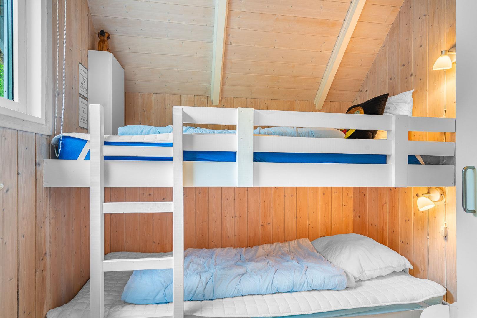 Indretningen byder på tre soveværelser: to med dobbeltsenge og ét med køjeseng – ideelt til både familier og par. Det lyse opholdsrum har loft til kip, brændeovn og en velmøbleret stue, der indbyder til hygge og samvær.