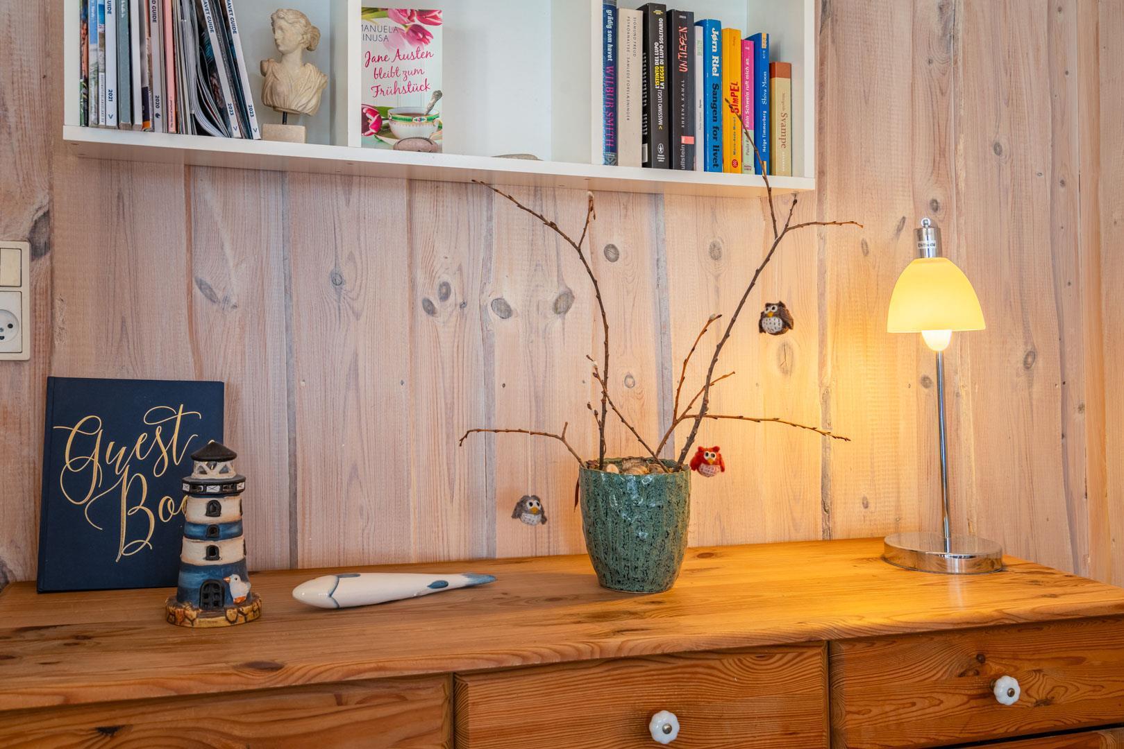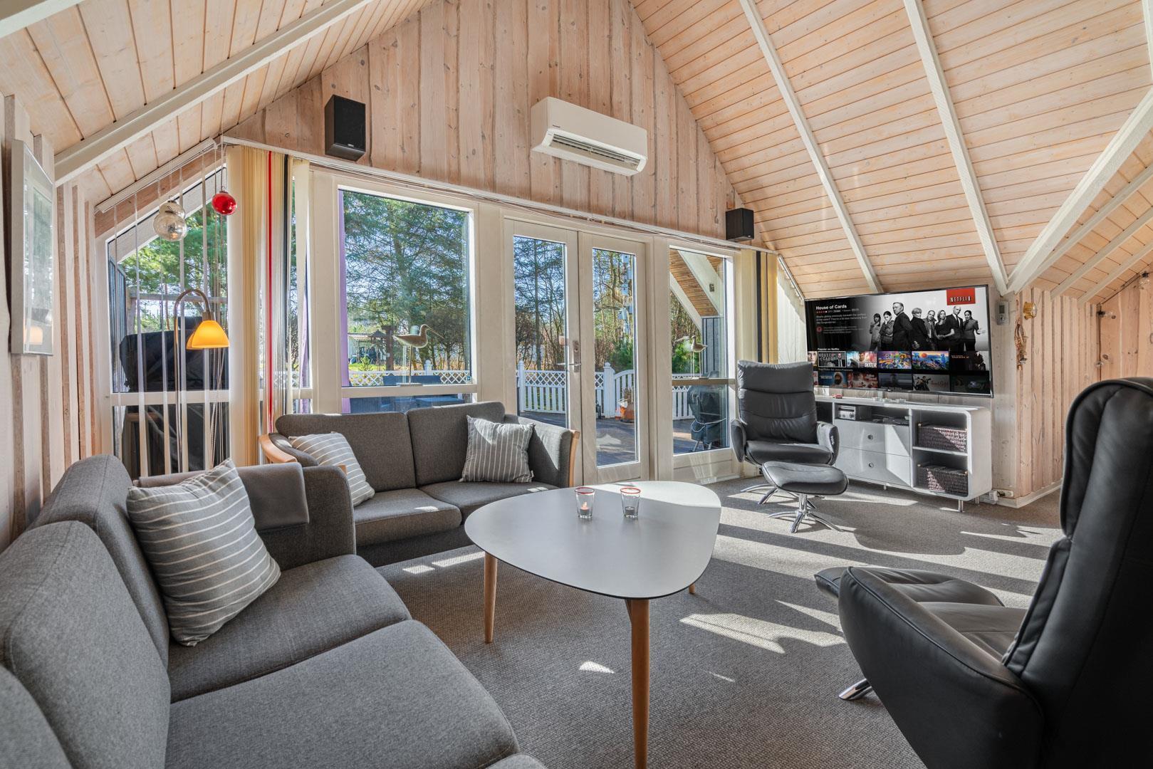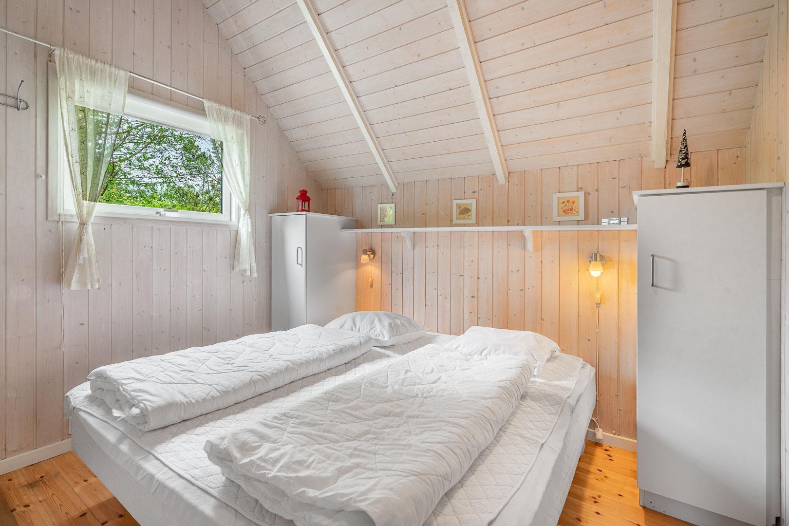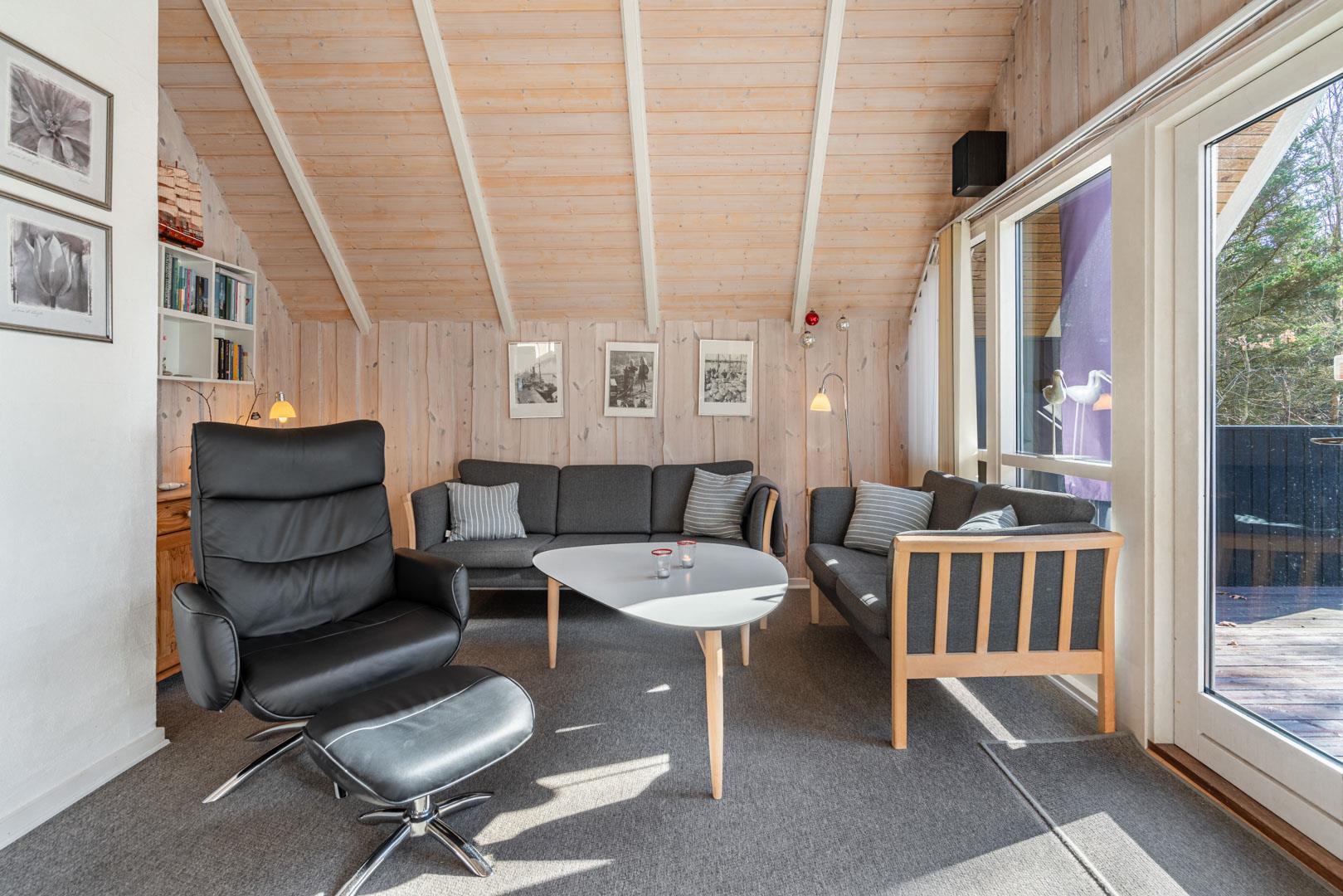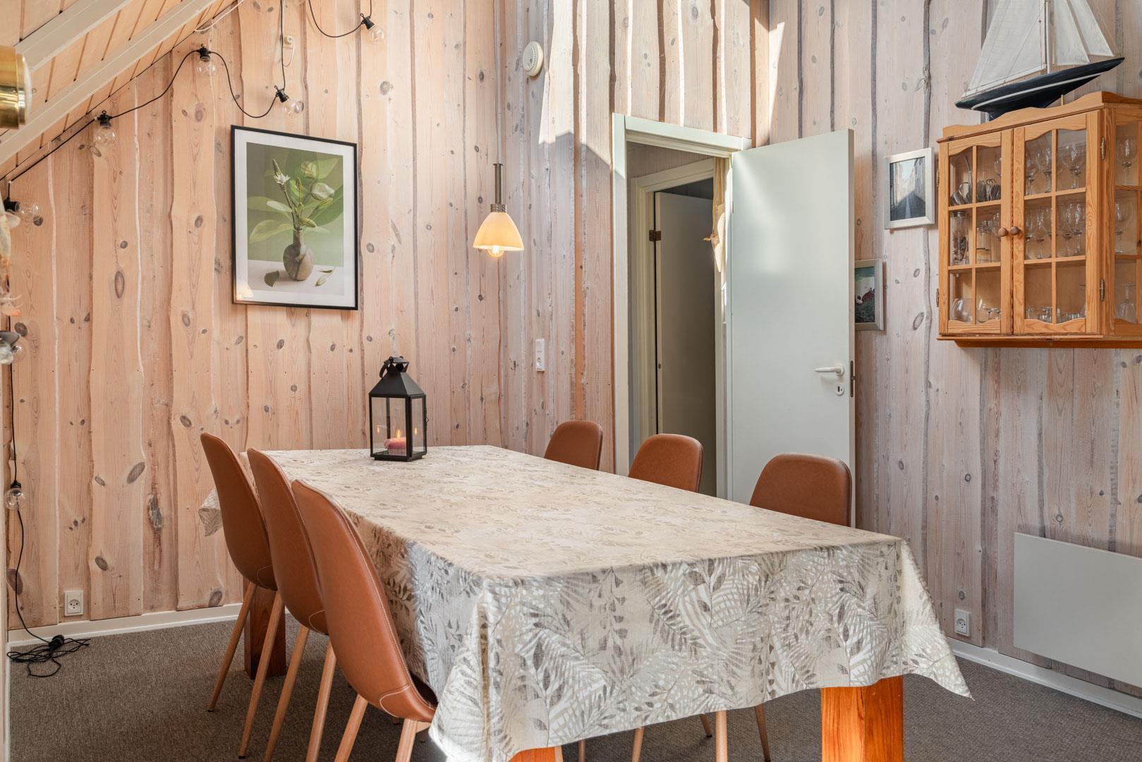 Indretningen byder på tre soveværelser: to med dobbeltsenge og ét med køjeseng – ideelt til både familier og par. Det lyse opholdsrum har loft til kip, brændeovn og en velmøbleret stue, der indbyder til hygge og samvær.