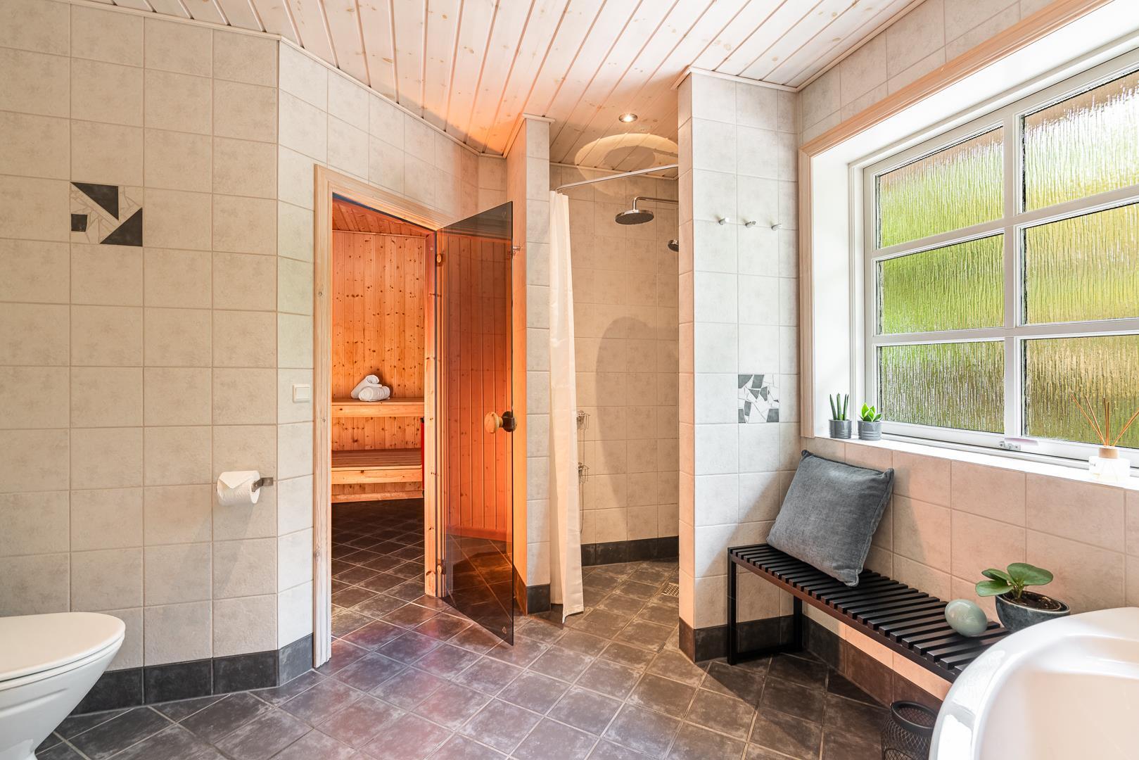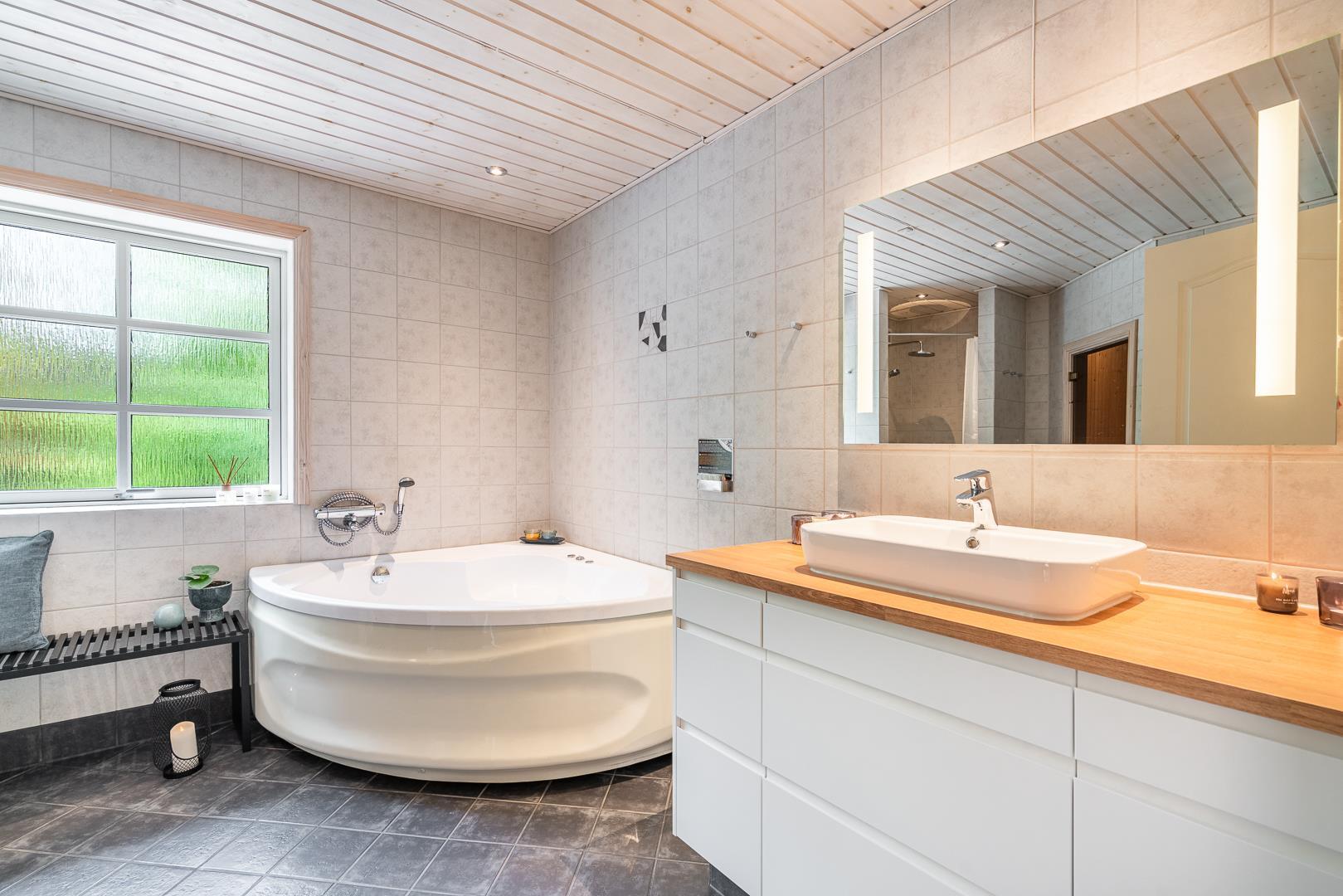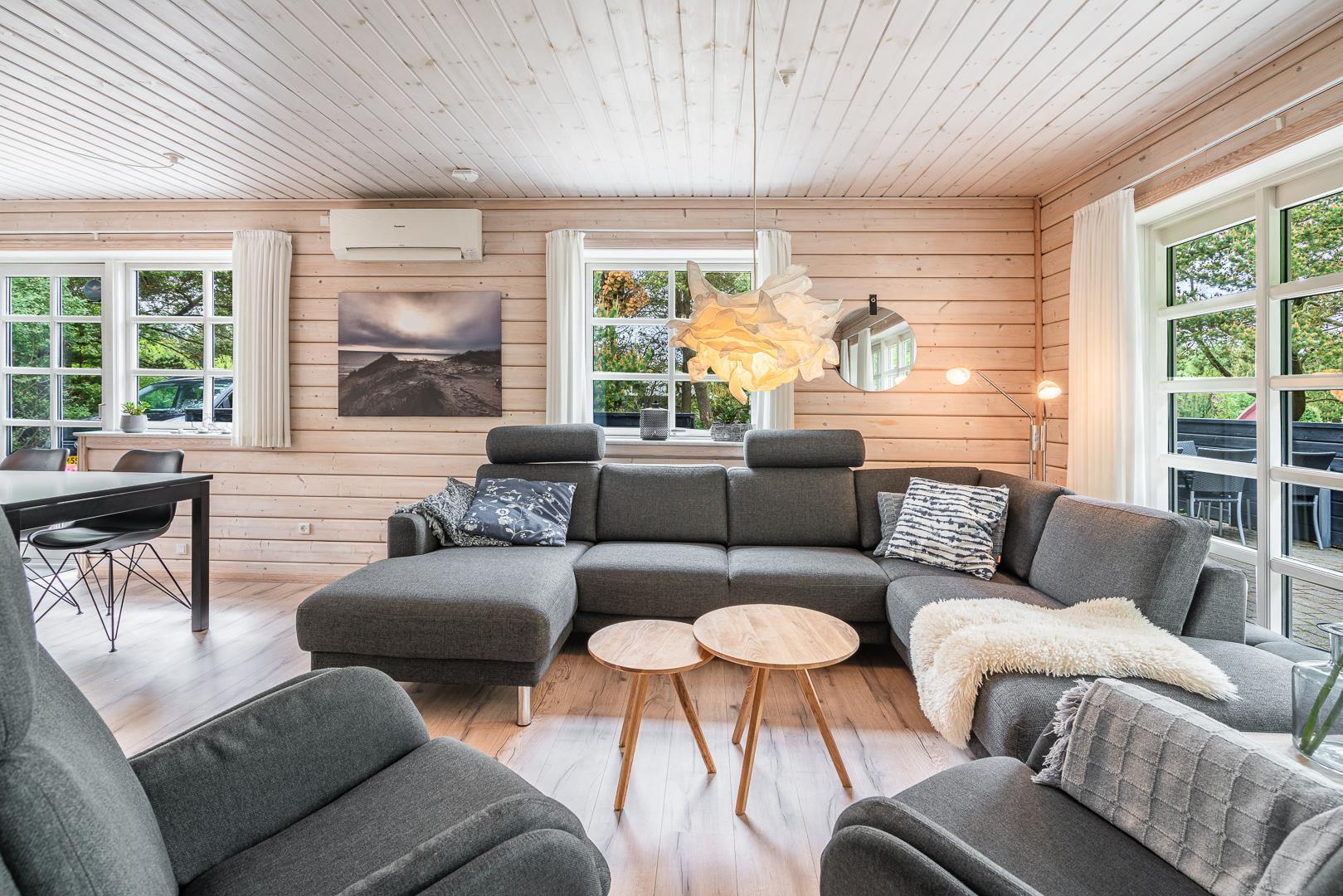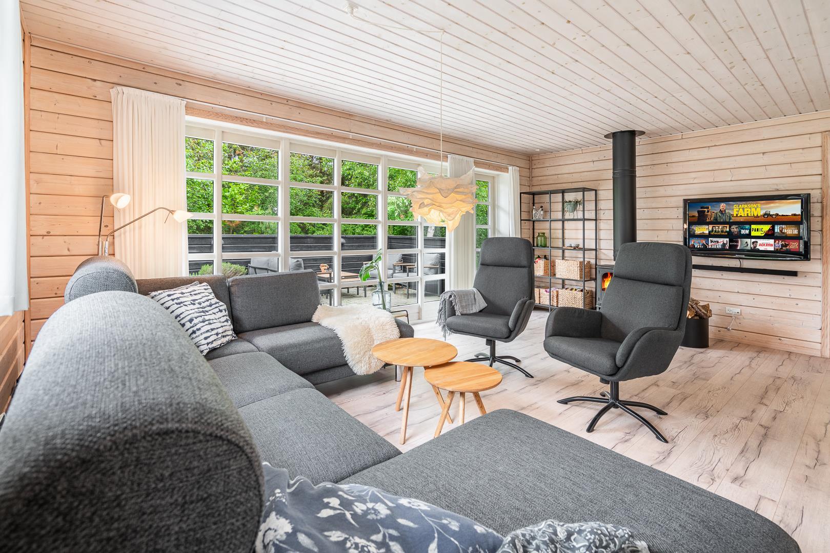 Dejlig stue med pæn møblering, brændeovn og fladskærms tv - varmepumpe sørger desuden for godt indeklima samt billigere strøm forbrug. Køkken med opvaskemaskine, separat fryser og mikroovn i åben forbindelse til spise pladsen. Stort badeværelse med spa og sauna, samt gulvvarme. Dejligt bryggers med vaskemaskine og tørretumbler. Afskærmet terrasse.