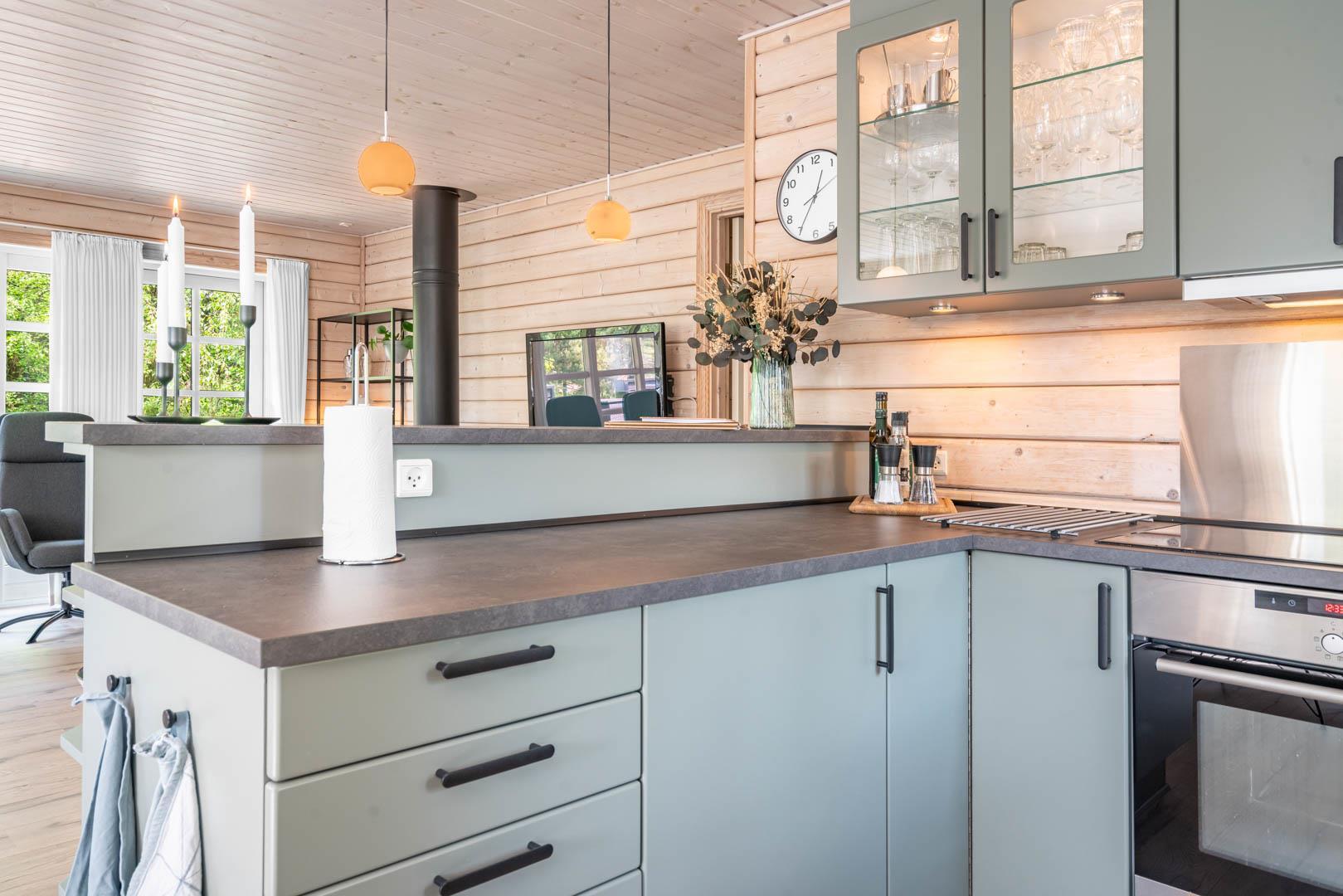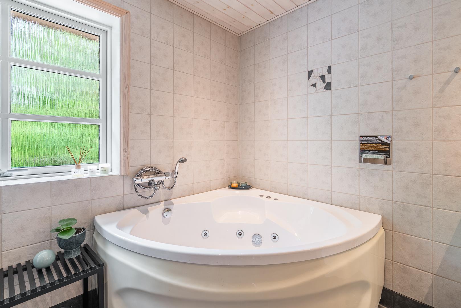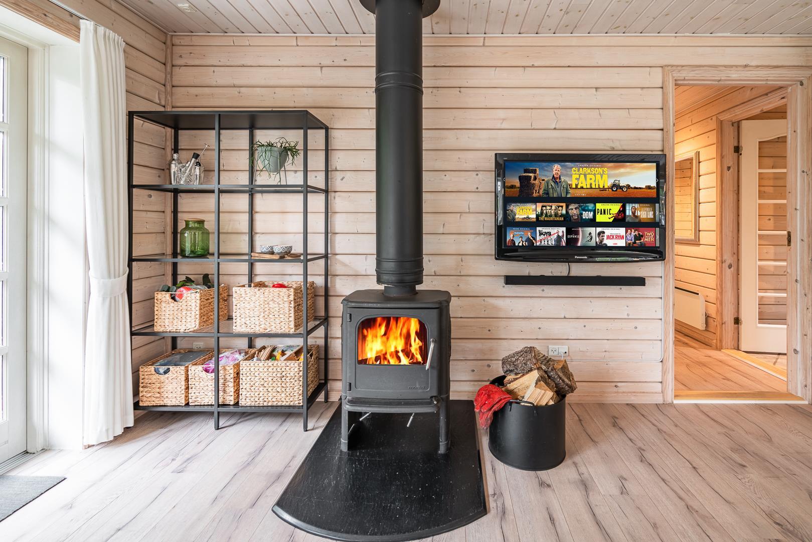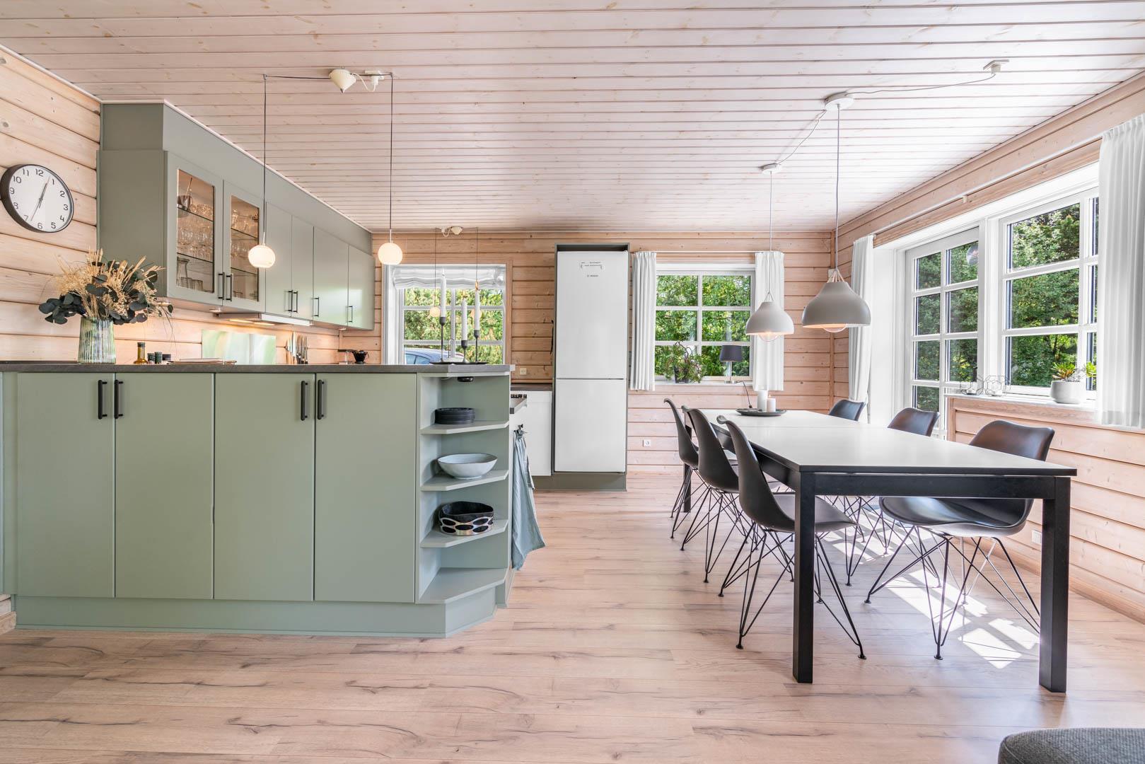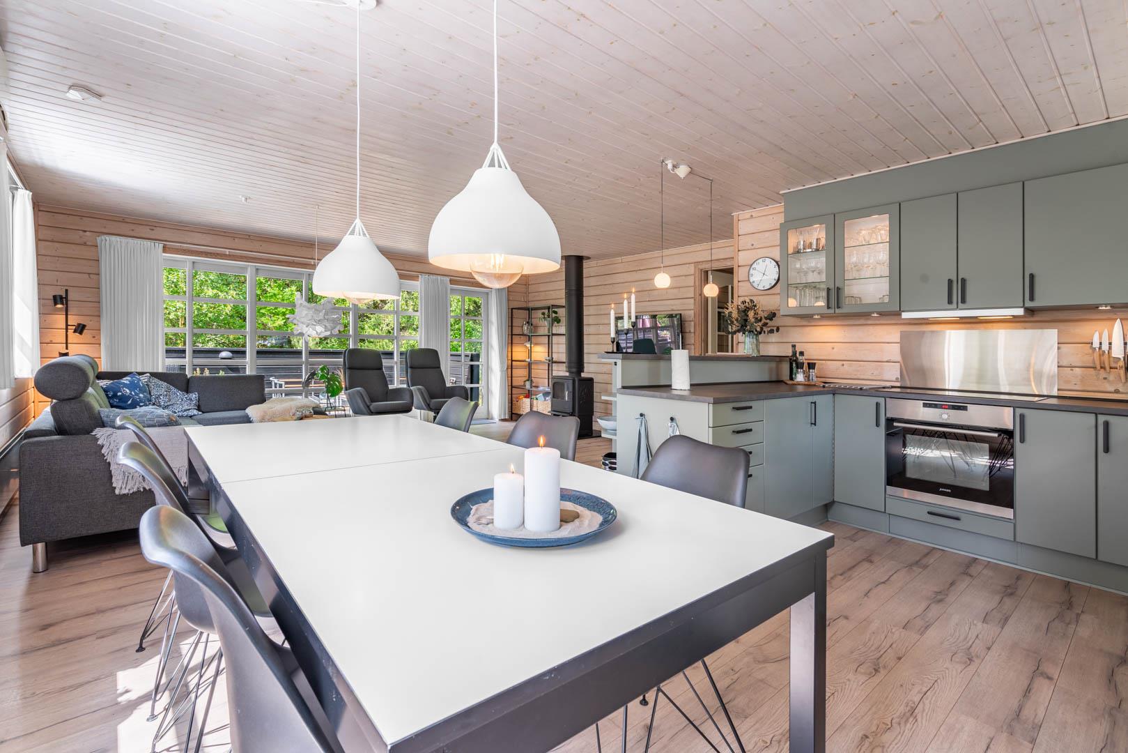 Dejlig stue med pæn møblering, brændeovn og fladskærms tv - varmepumpe sørger desuden for godt indeklima samt billigere strøm forbrug. Køkken med opvaskemaskine, separat fryser og mikroovn i åben forbindelse til spise pladsen. Stort badeværelse med spa og sauna, samt gulvvarme. Dejligt bryggers med vaskemaskine og tørretumbler. Afskærmet terrasse.