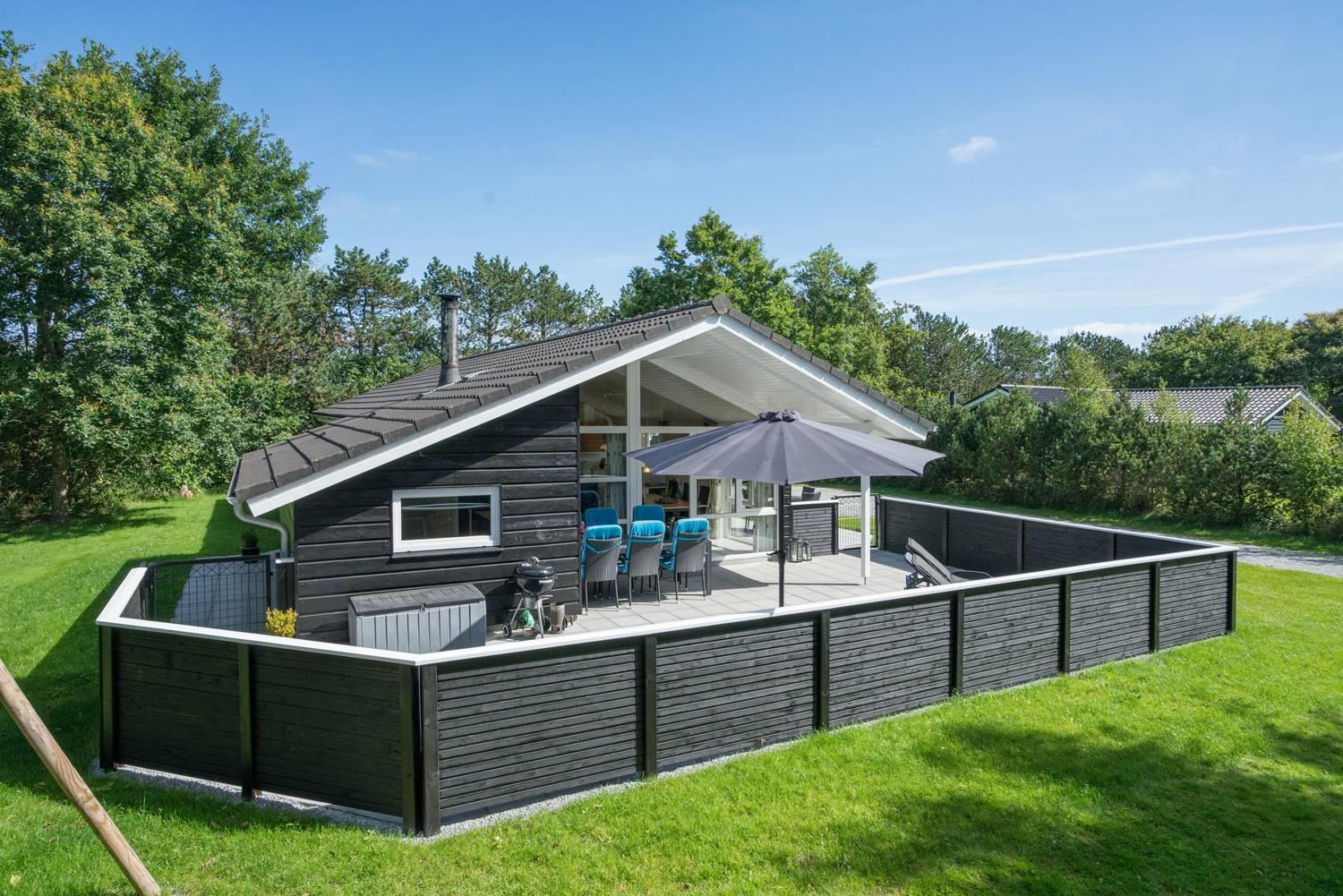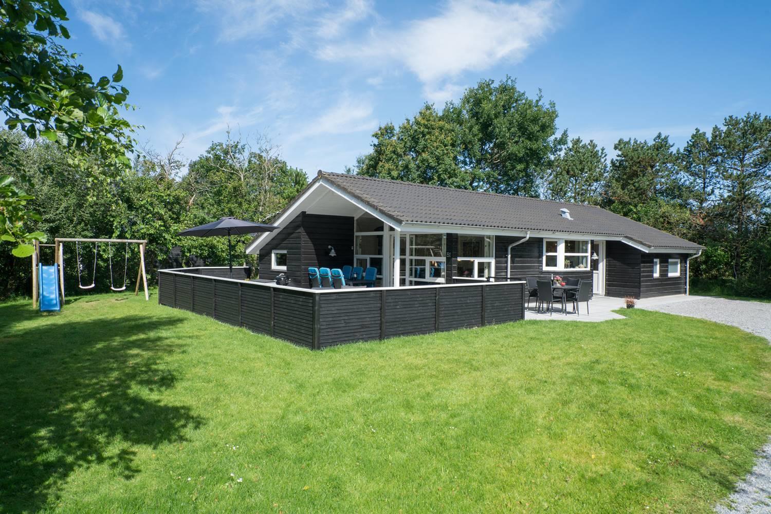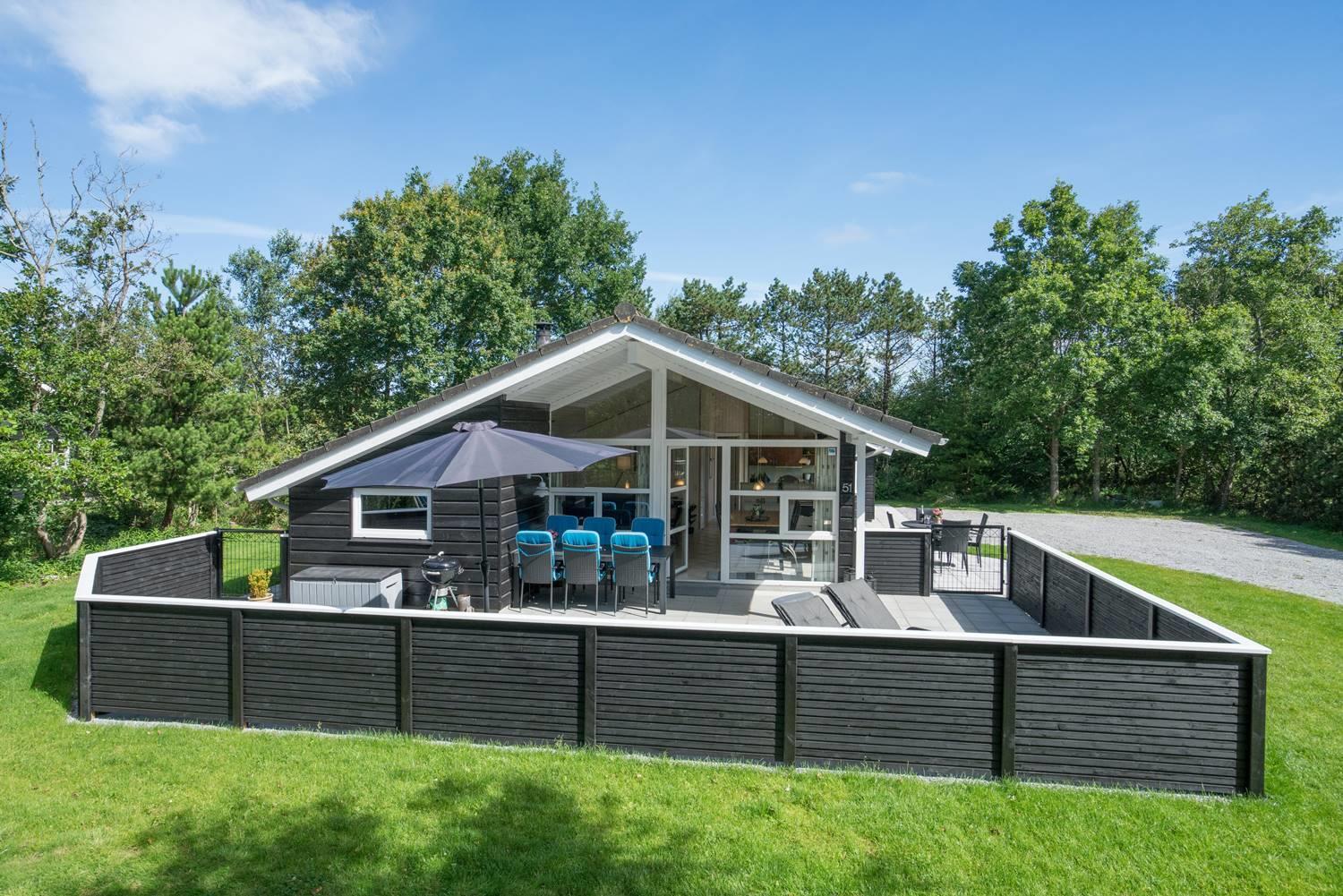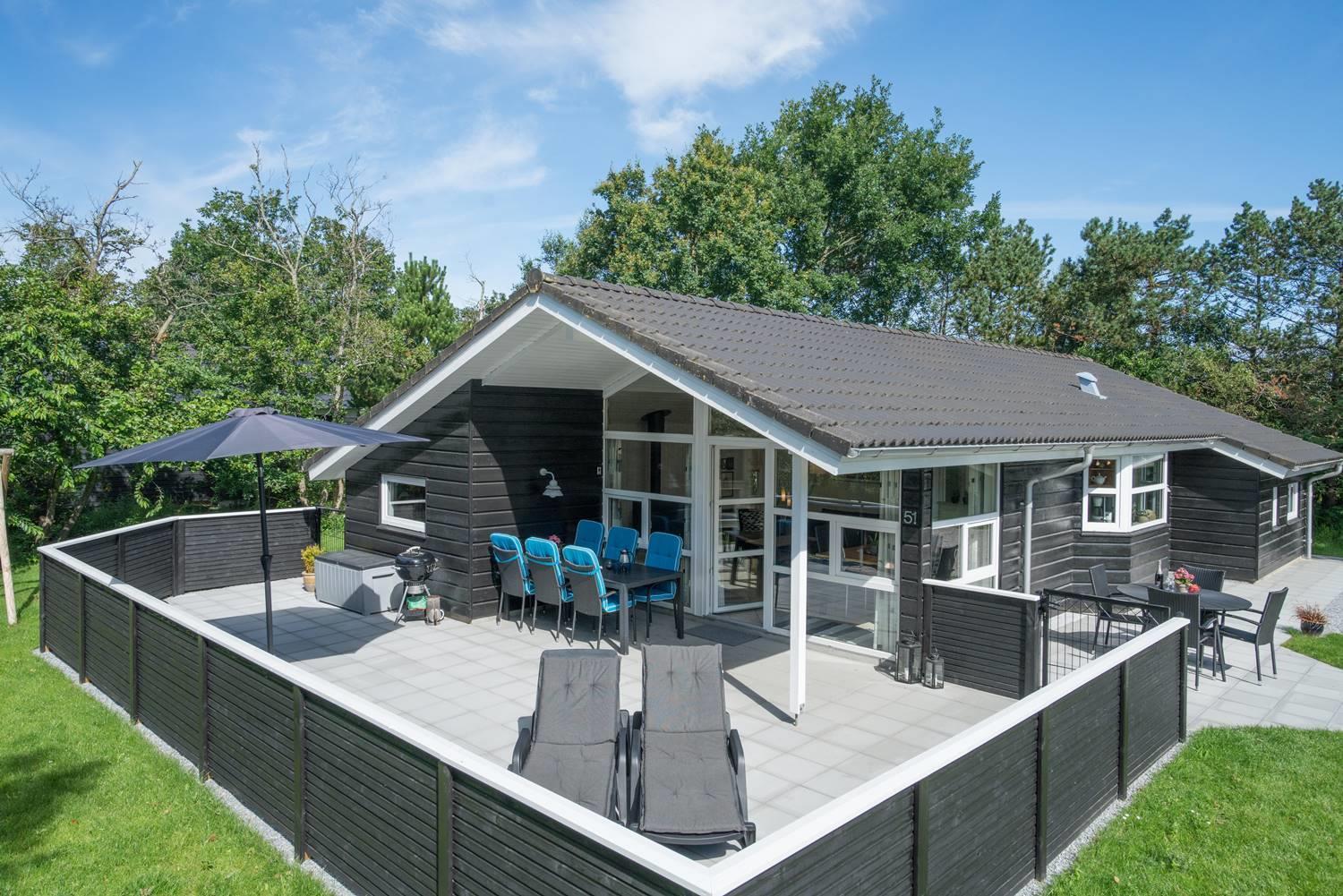 På en velbeplantet grund, med højt til himlen, finder I dette dejlige feriehus på Vestervang 51. Der er med helt lukket terrasse styr på børn og hunde - desuden er der fliser omkring hele huset, så du kan gå tørskoet. Huset er personligt og velholdt med hyggelig indretning og giver mulighed for plads til 6 personer. Her er 3 soverum, hvoraf 2 har dobbeltseng og et soverum har TV. Det sidste soverum er indrettet med enkelt senge. Her findes 2 badeværelser - det ene byder på spa og sauna, som har mange positive virkninger. Et hyggeligt køkken med mikroovn, opvaskemaskine og fryser på 60 liter, er med til at skabe rum for hele familien. Spiseplads og stue med smart -tv, skaber rum for dejligt samvær - her er både brændeovn og varmepumpe som er medvirkende til en billigere strøm regning.