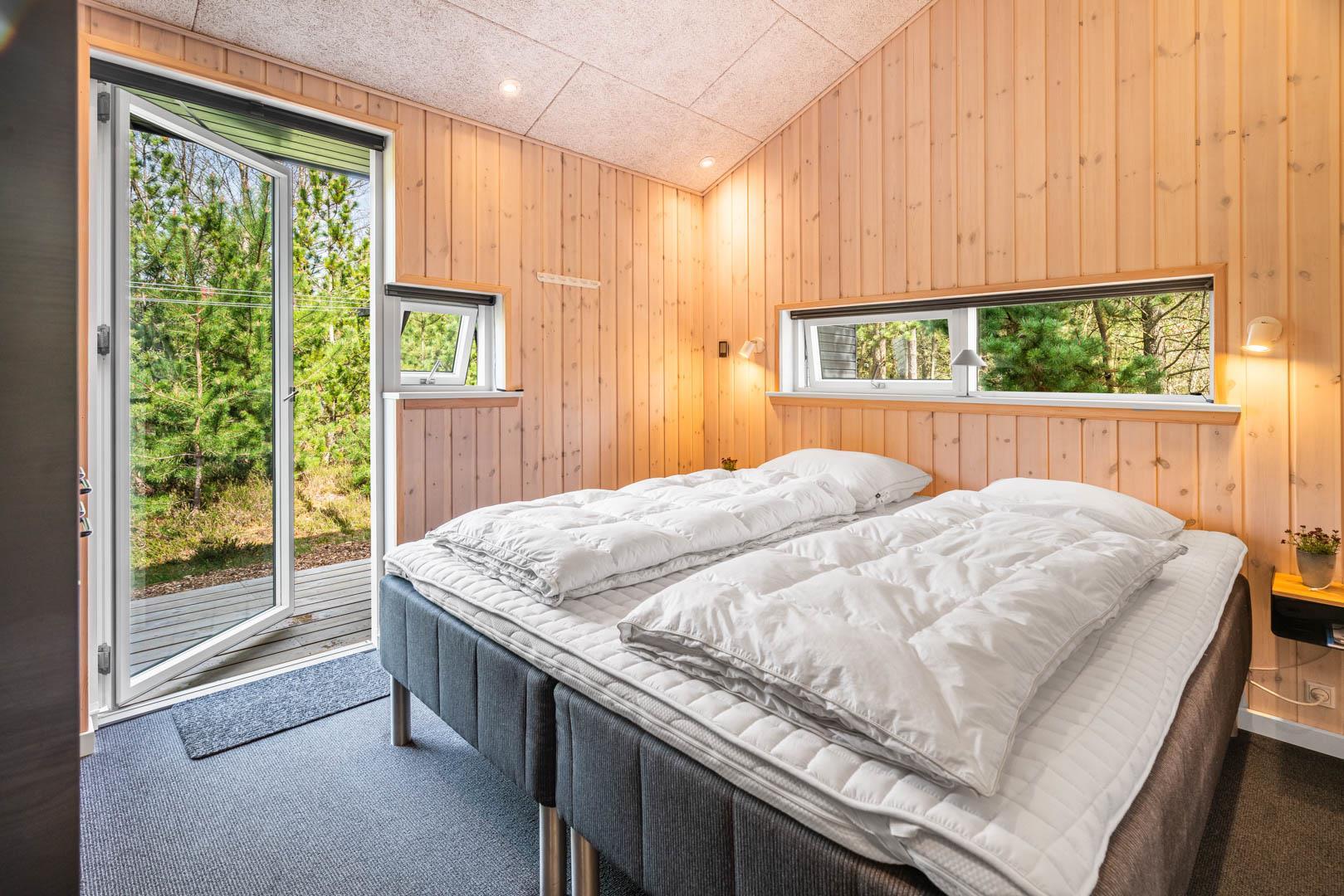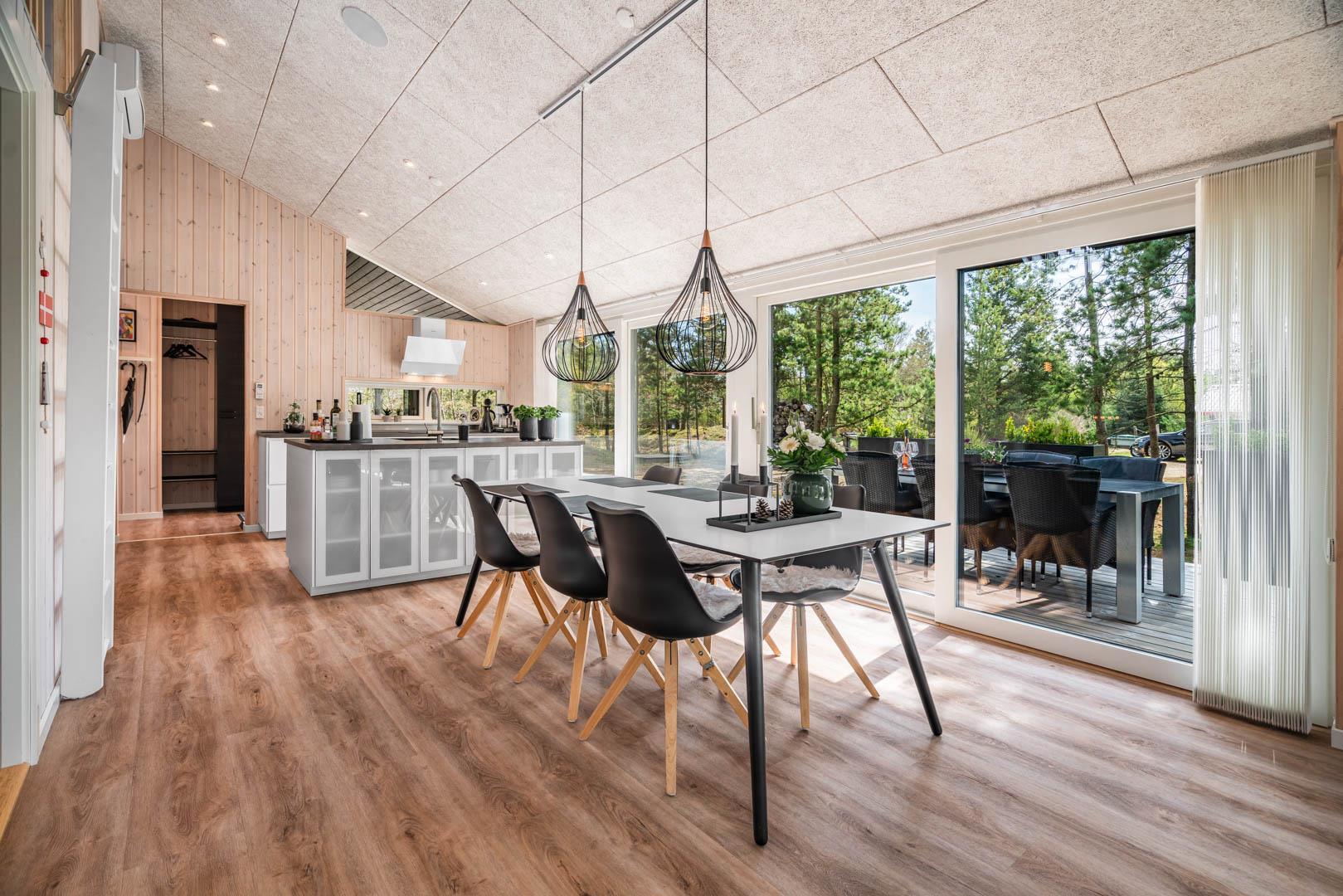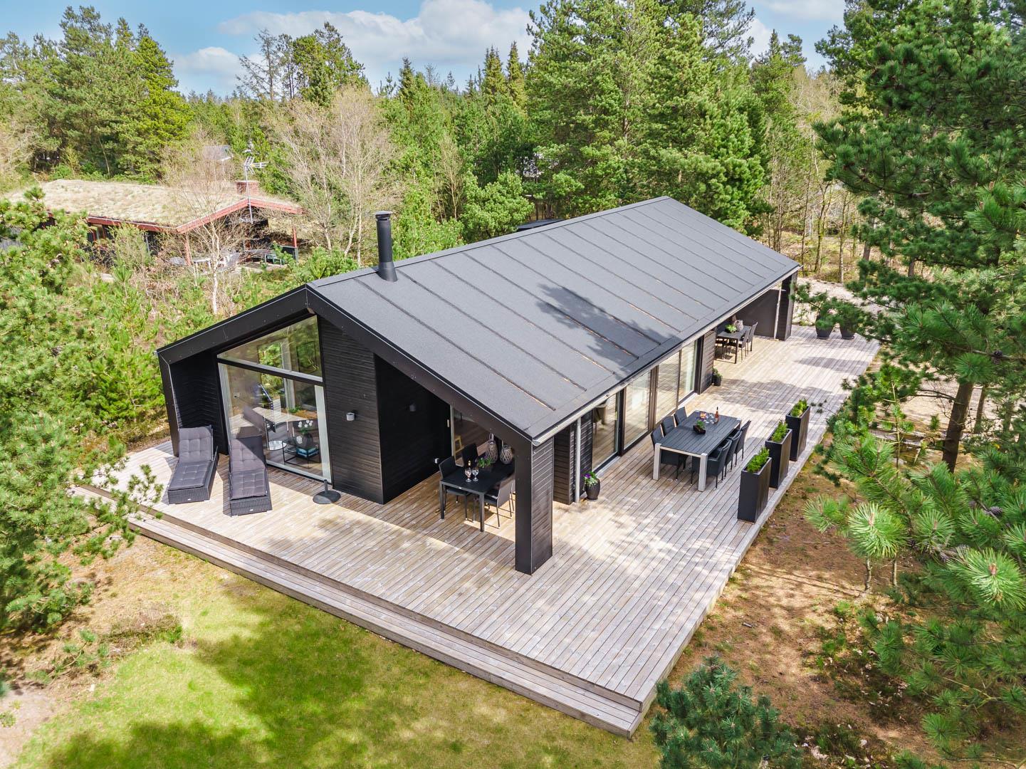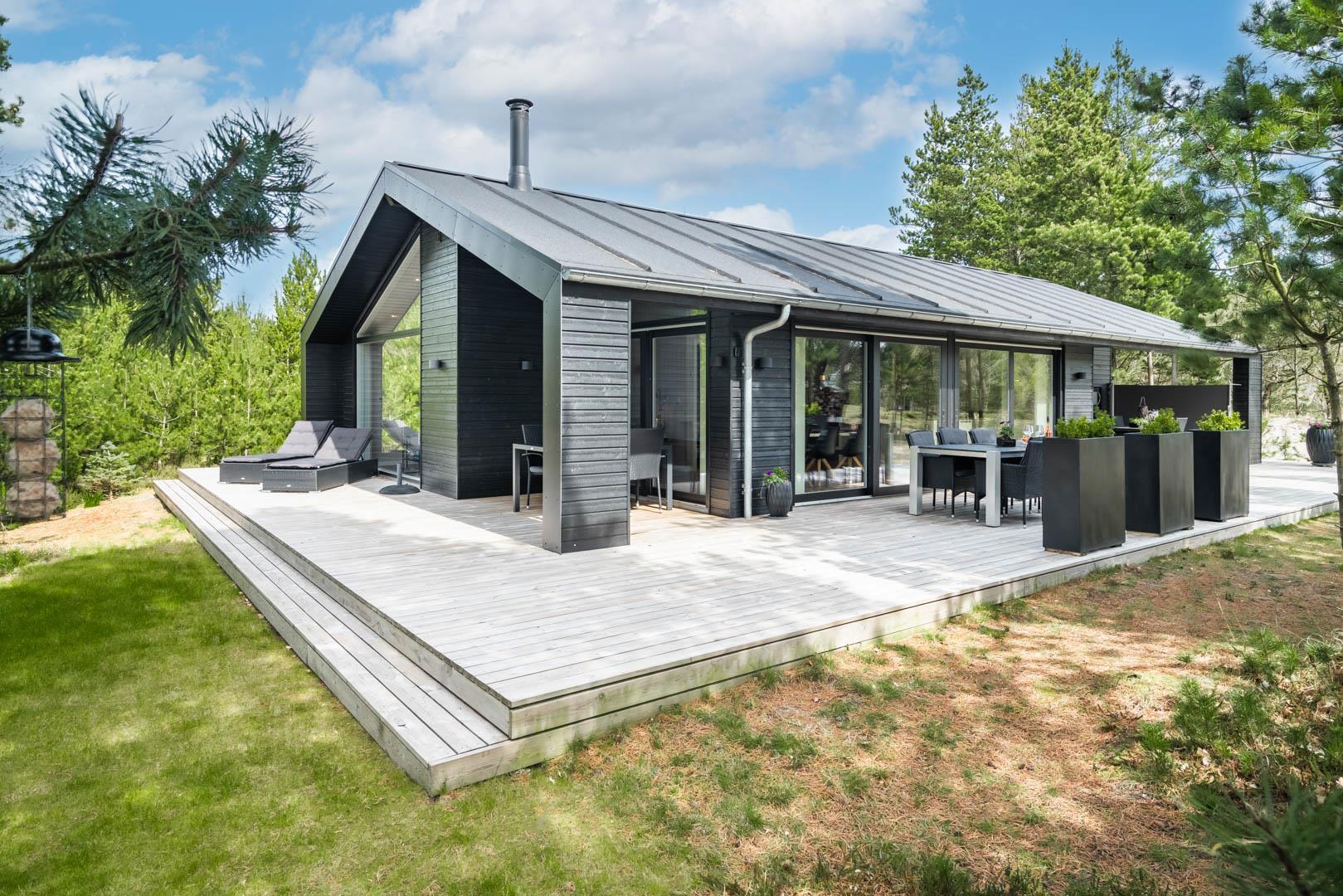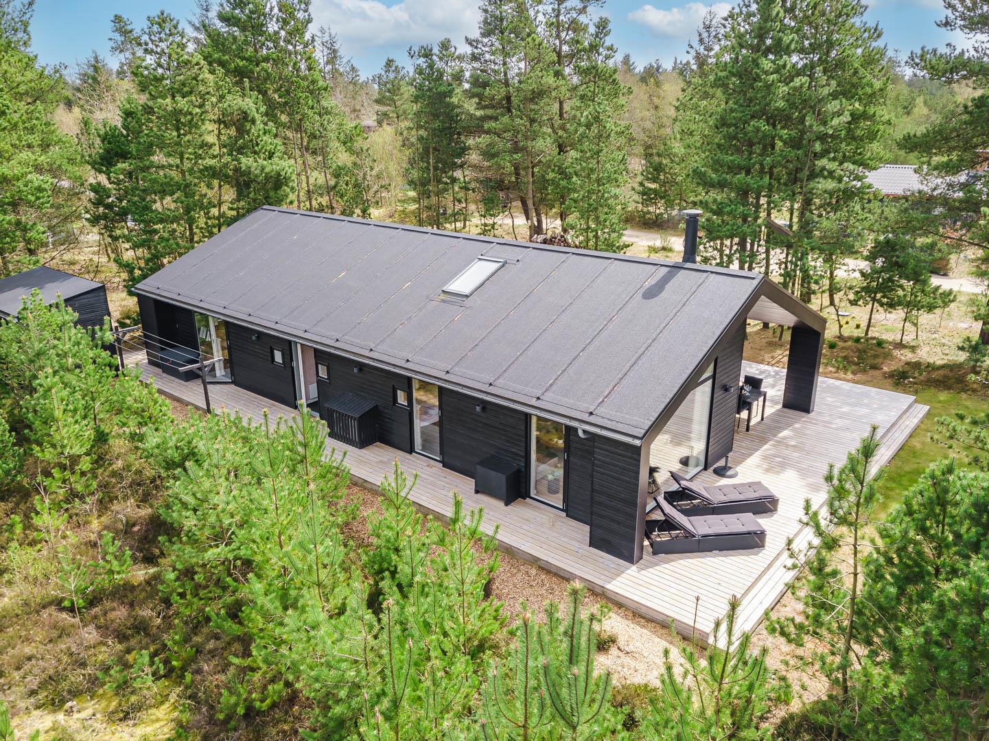 I vil føle jer godt tilpas i de bekvemmelige omgivelser med køkken og spiseplads i åbent forbindelse til stue med brændeovn og varmepumpe. Stort badeværelse med badekar i forbindelse med det ene værelse og ekstra toilet med brus. Huset er omgivet af dejlig stor træterrasse, hvor en del er overdækket, hvor I kan nyde ferien.
