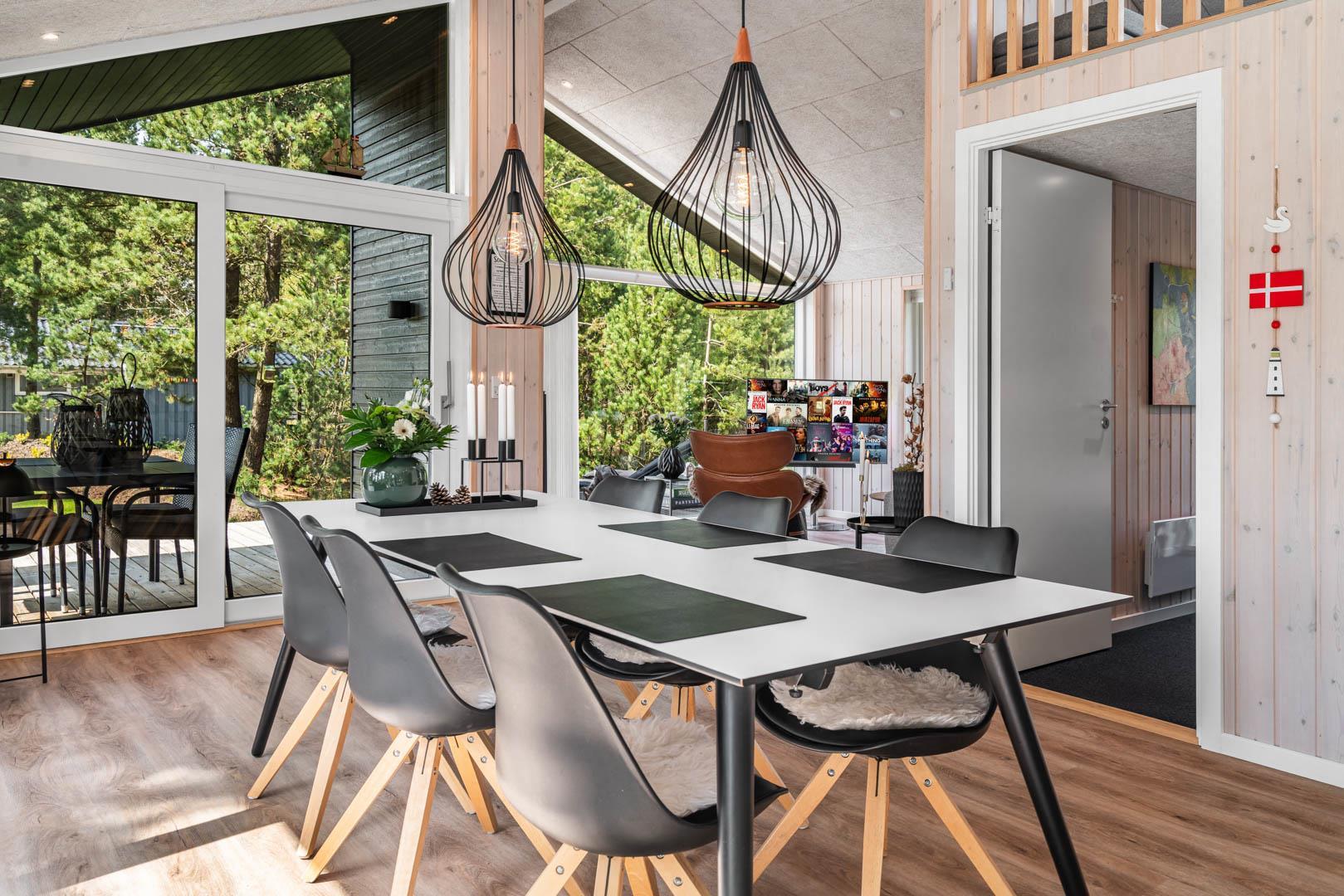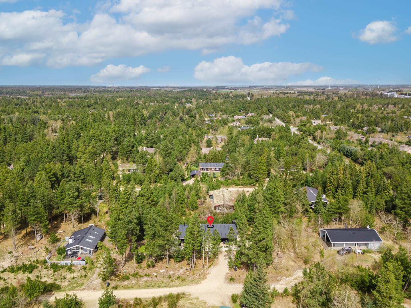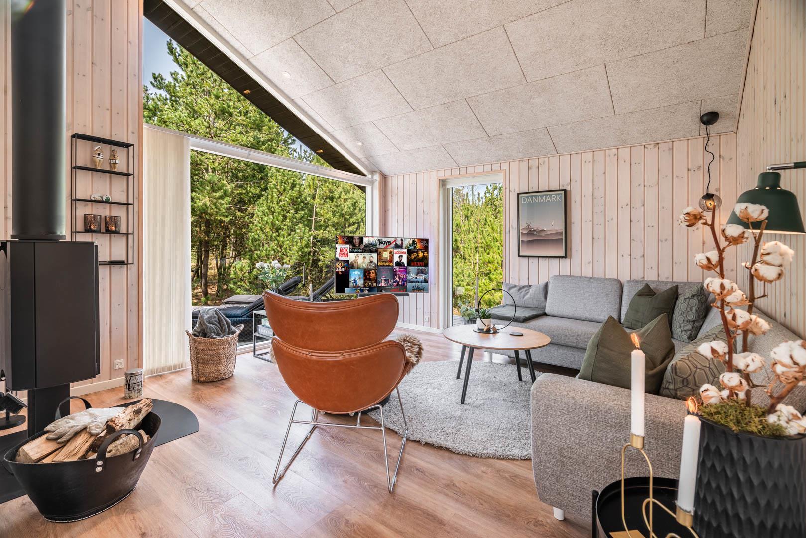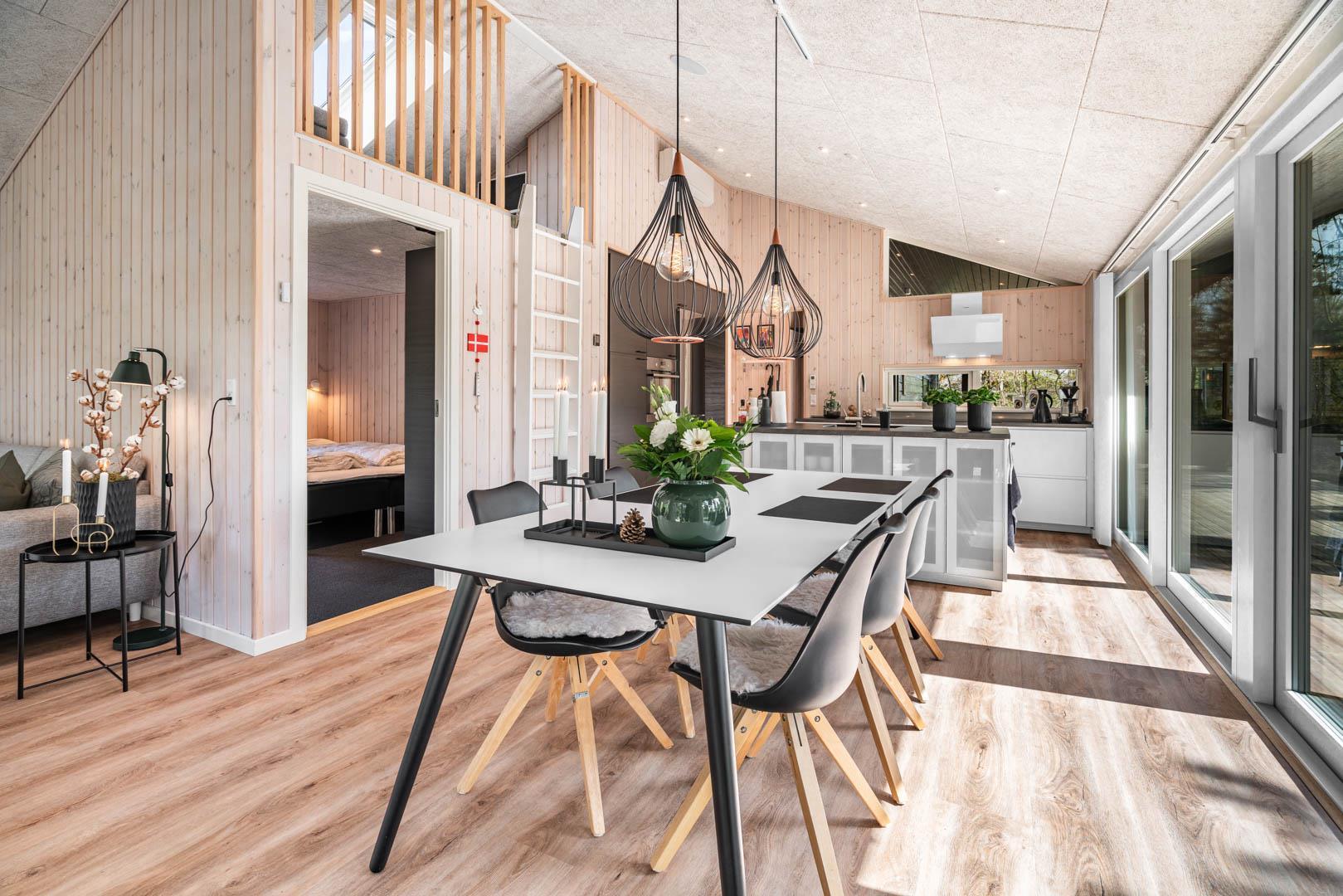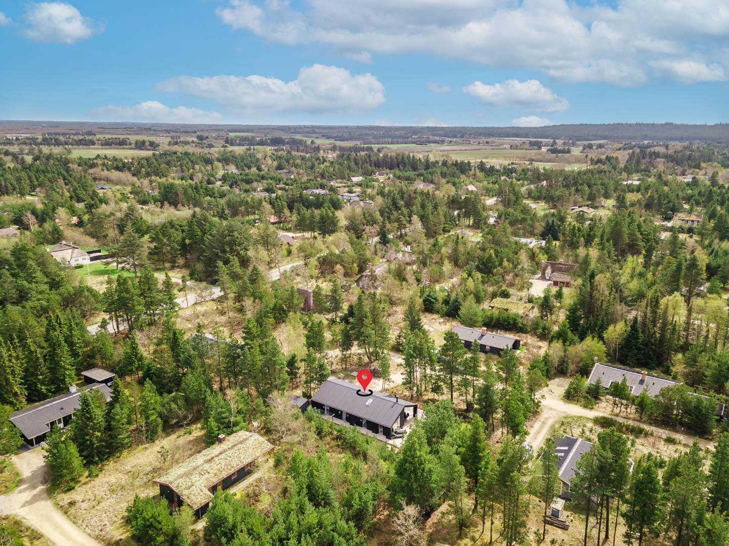 I vil føle jer godt tilpas i de bekvemmelige omgivelser med køkken og spiseplads i åbent forbindelse til stue med brændeovn og varmepumpe. Stort badeværelse med badekar i forbindelse med det ene værelse og ekstra toilet med brus. Huset er omgivet af dejlig stor træterrasse, hvor en del er overdækket, hvor I kan nyde ferien.