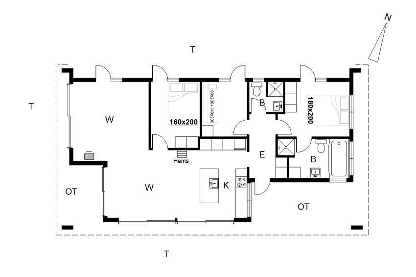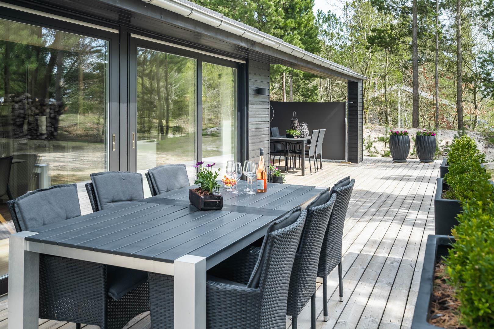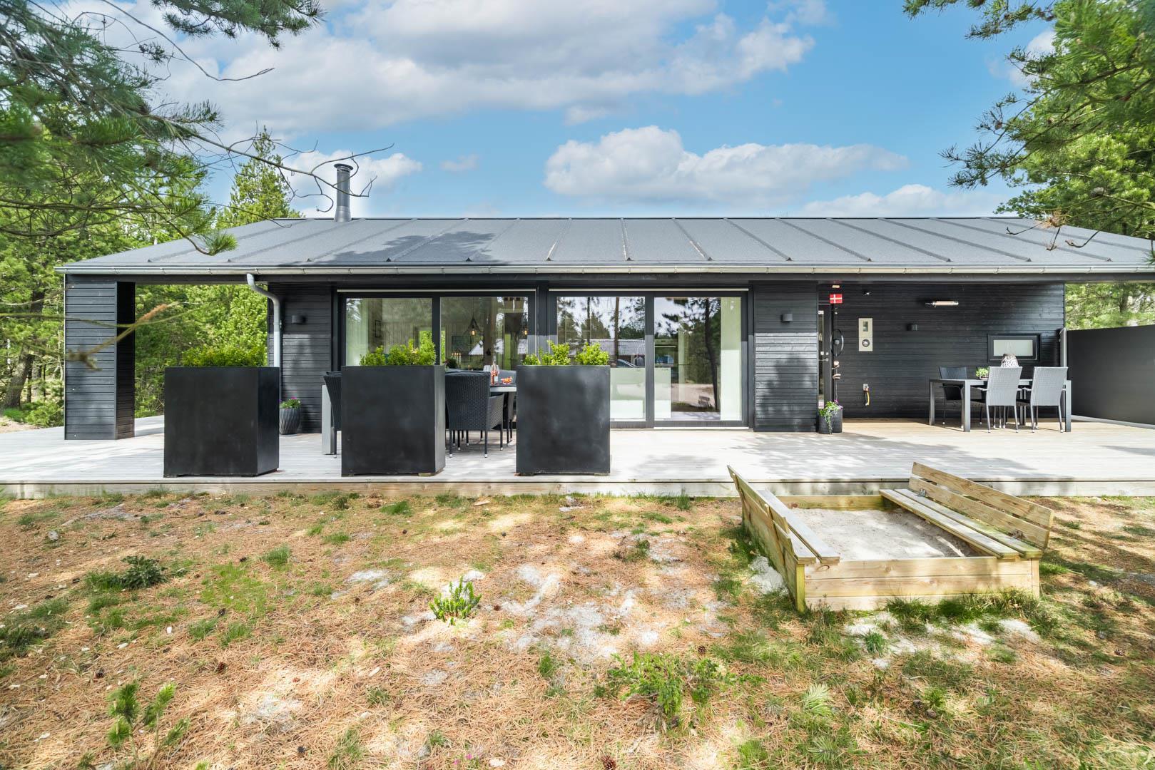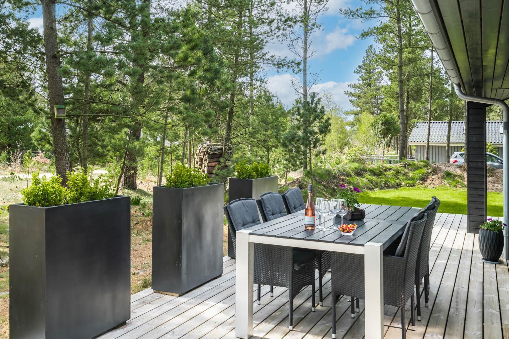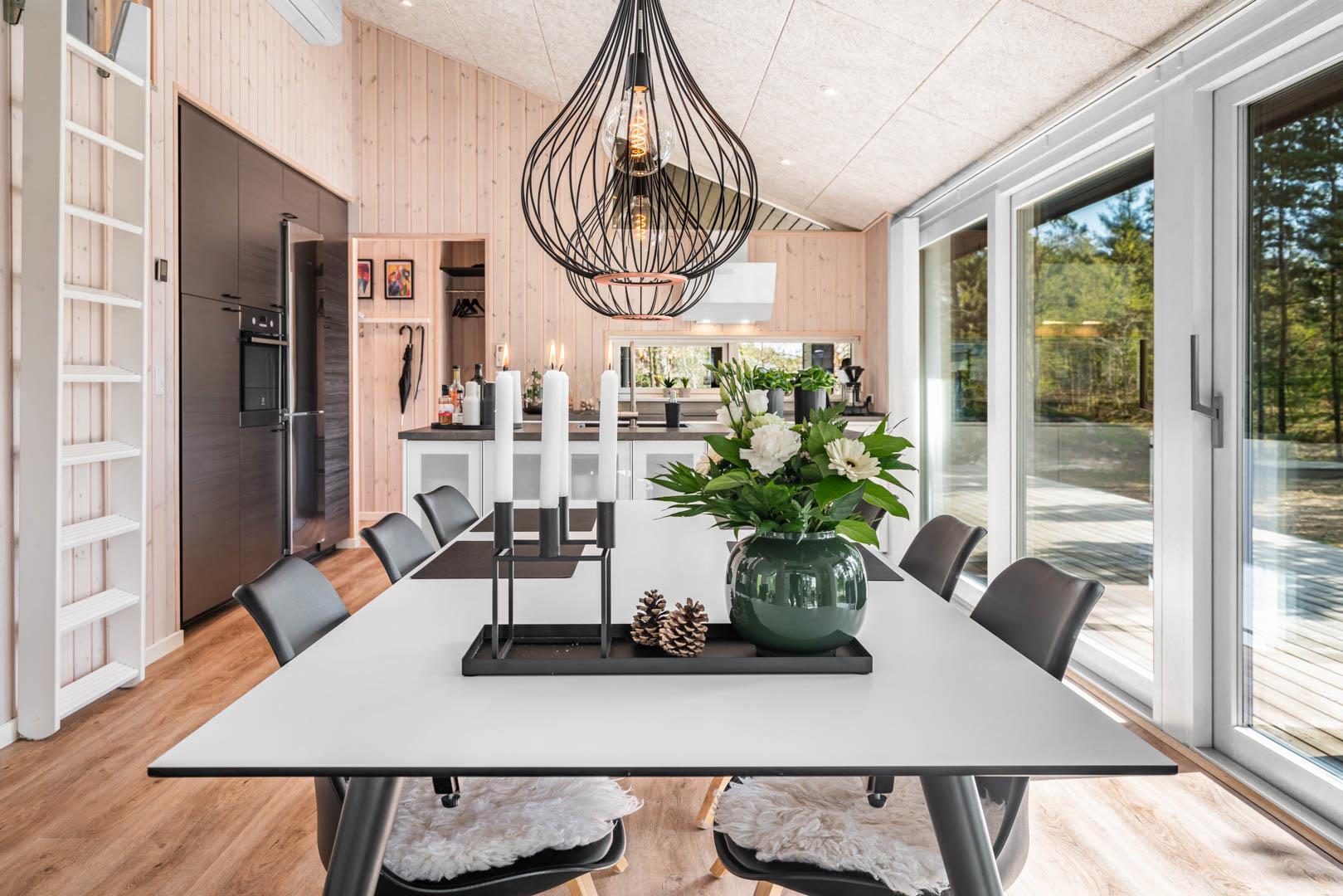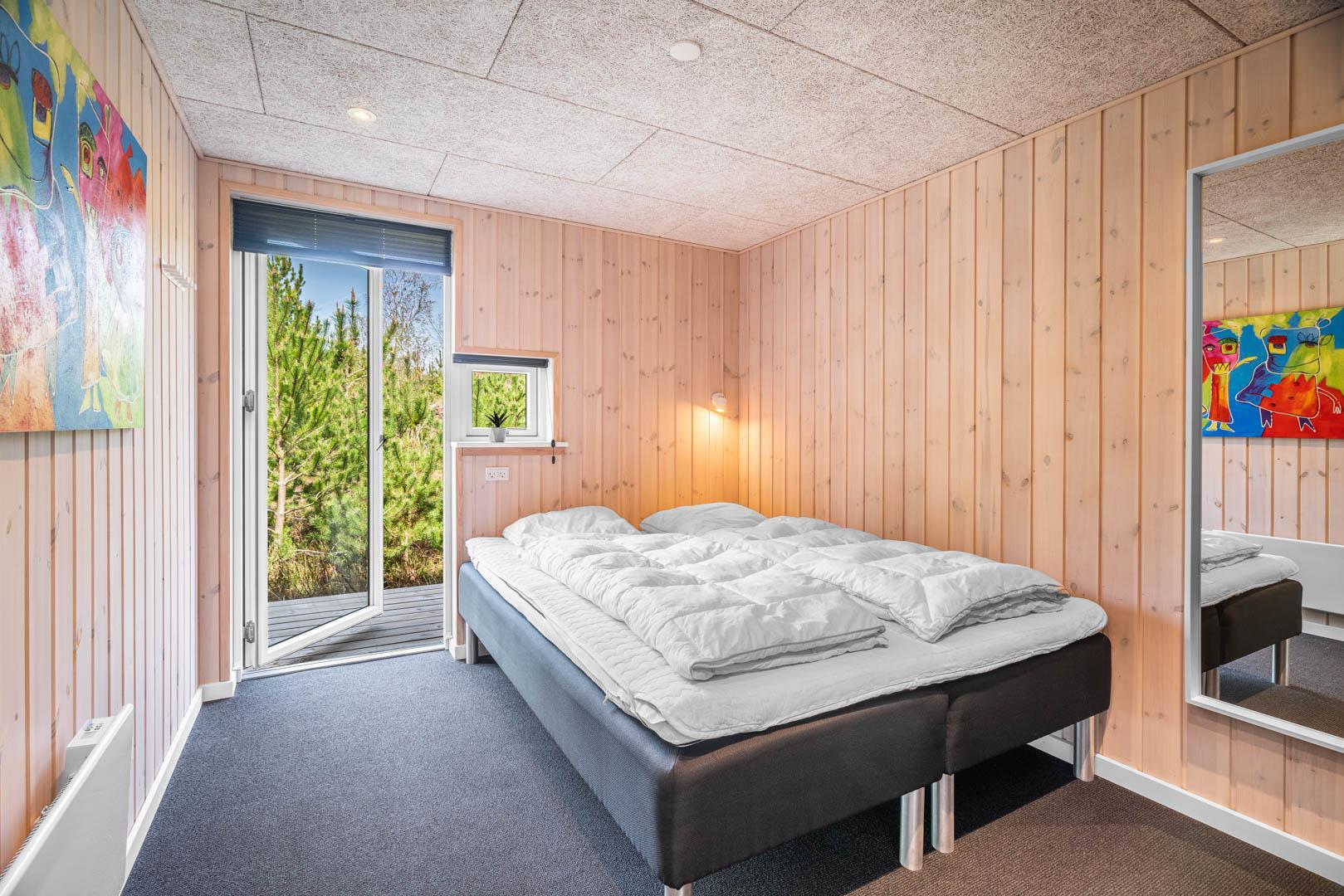 I vil føle jer godt tilpas i de bekvemmelige omgivelser med køkken og spiseplads i åbent forbindelse til stue med brændeovn og varmepumpe. Stort badeværelse med badekar i forbindelse med det ene værelse og ekstra toilet med brus. Huset er omgivet af dejlig stor træterrasse, hvor en del er overdækket, hvor I kan nyde ferien.