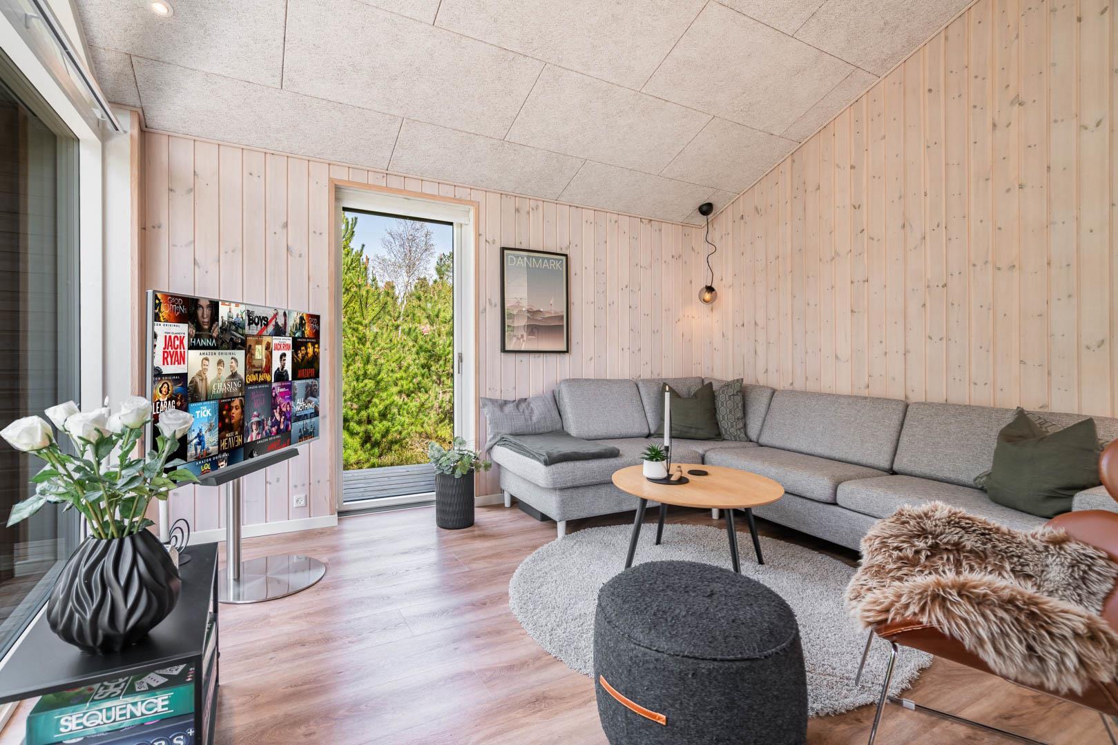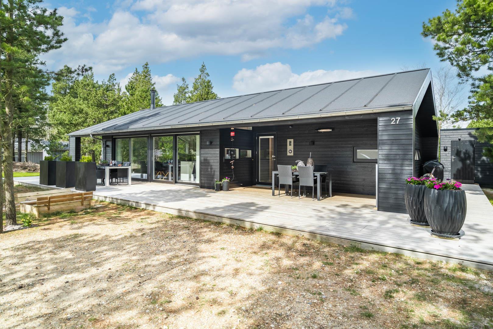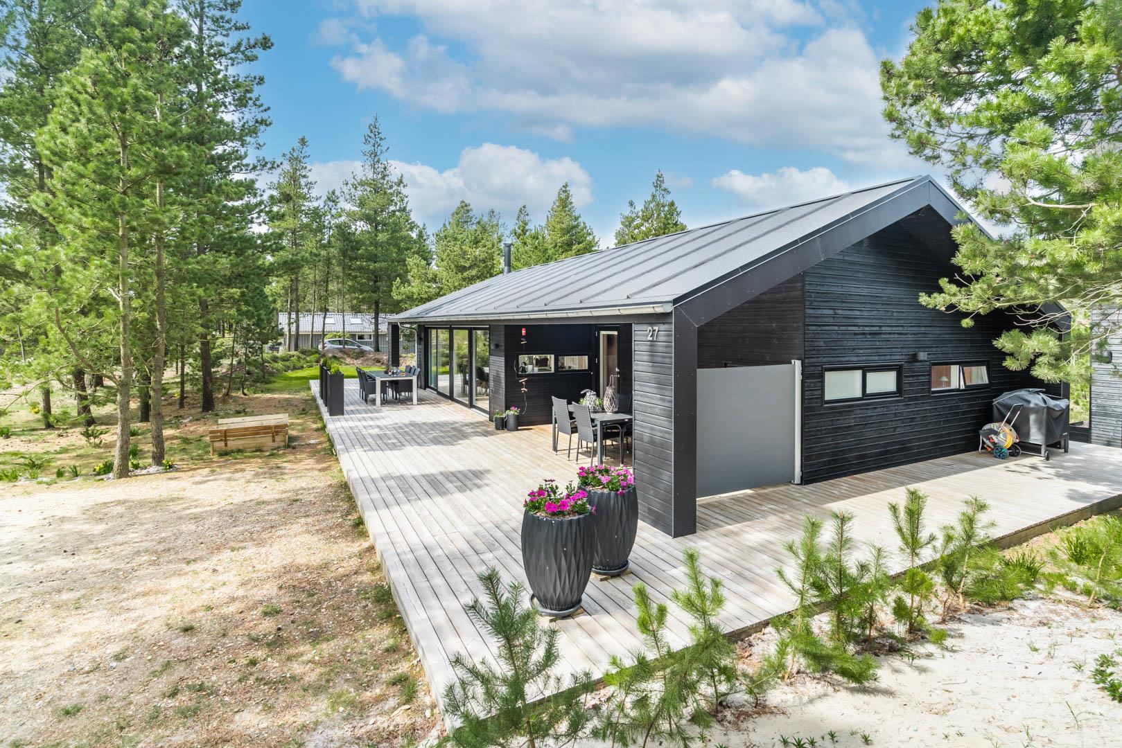 På denne skønne naturgrund i det veletablerede sommerhusområde ved Houstrup Strand ligger dette nybyggede feriehus fra 2019 på Højsvej 27 Huset er for dig, der lægger vægt på et moderne hus med dejlig stor terrasse tæt på den skønne Blåbjerg plantage. Huset er stilfuldt indrettet med højt til loftet og åbent køkken alrum. Der findes tre soverum, alle med dobbeltseng - hvoraf et af soverummene er med en 140 cm seng og desuden en køje. Derudover findes en hems i forbindelse med alrummet. TV på hems. Huset har desuden bluetooth.