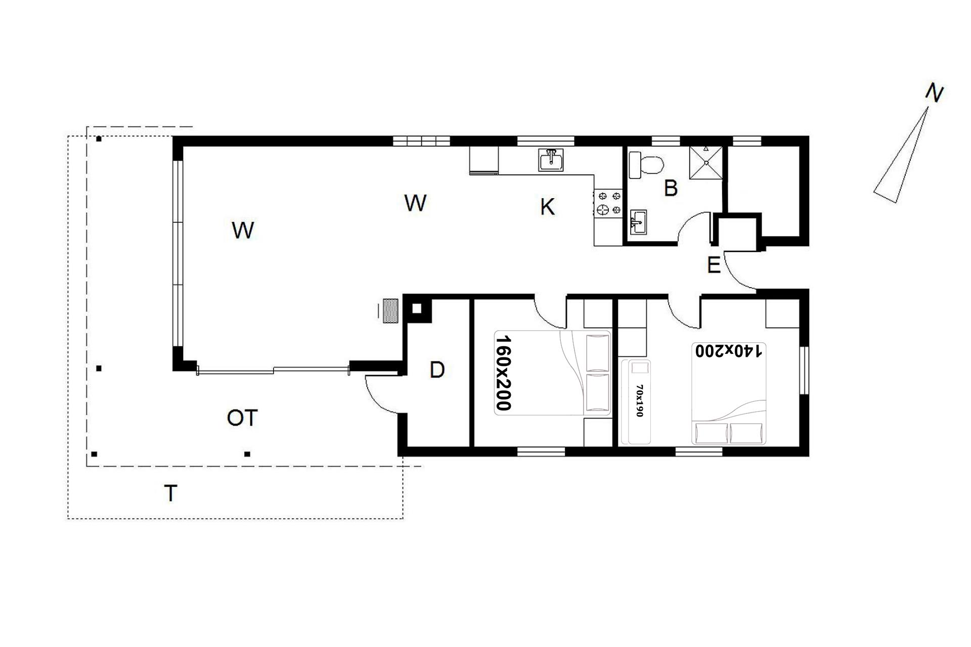 Sengestørrelse: 1 dobbeltseng 140 x 200 cm + 1 dobbeltseng 160 x 200 cm + 1 køjeseng 70 x 190 cm.