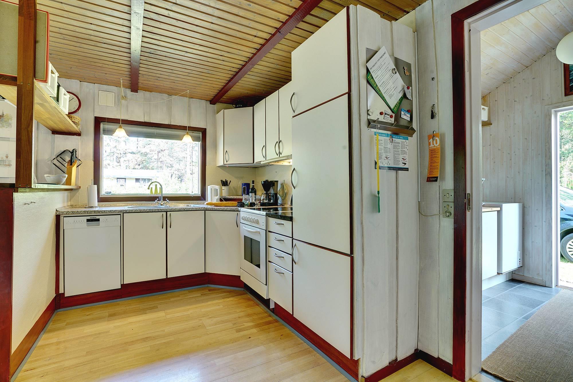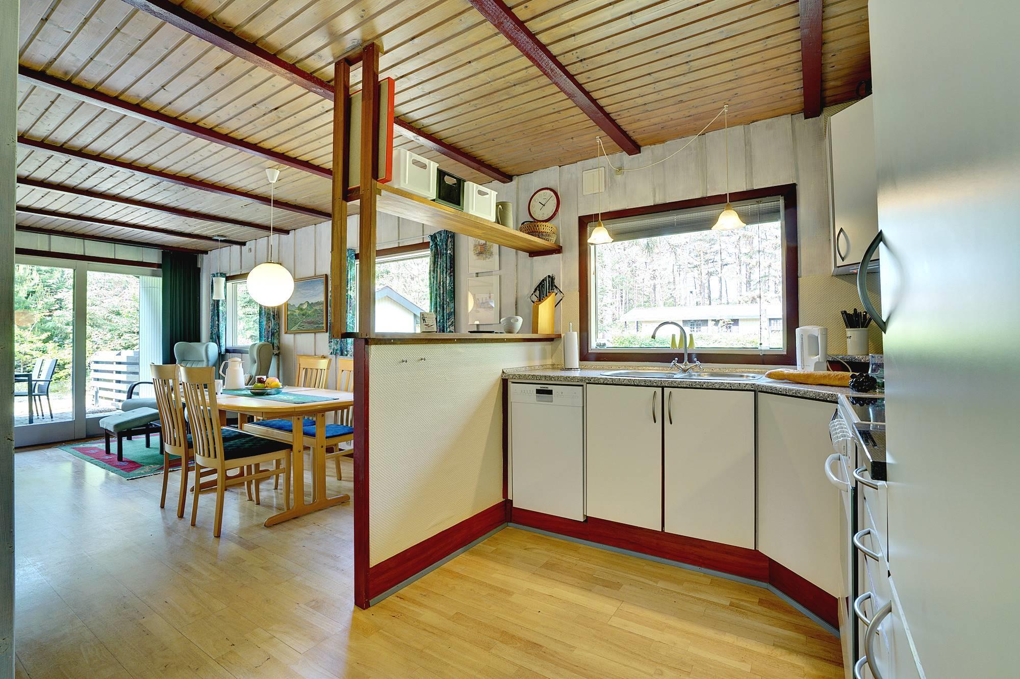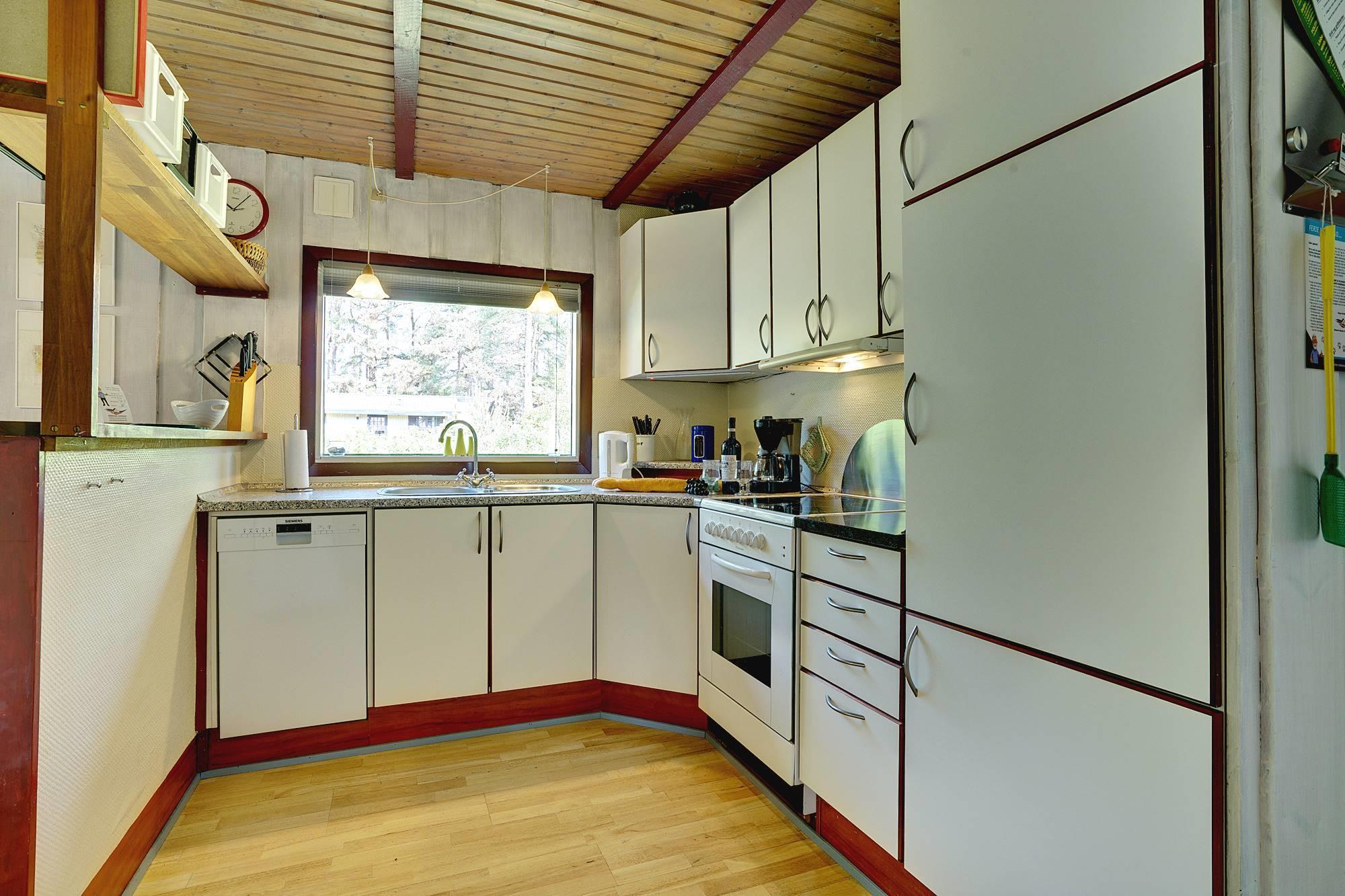 Sommerhuset har en funktionel og gennemtænkt indretning. Det lyse køkken er veludstyret og ideelt til fælles madlavning. Badeværelset med bruseniche og klinkegulv.