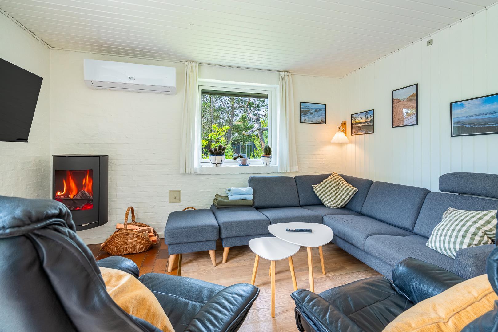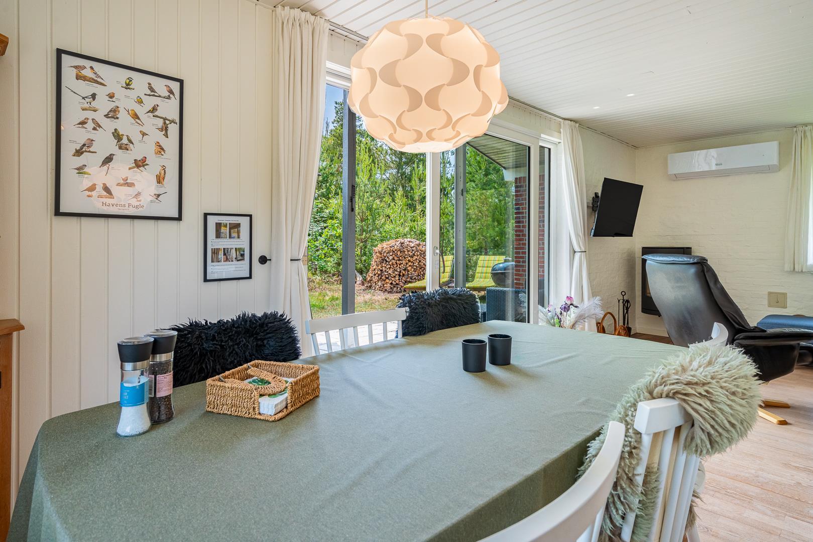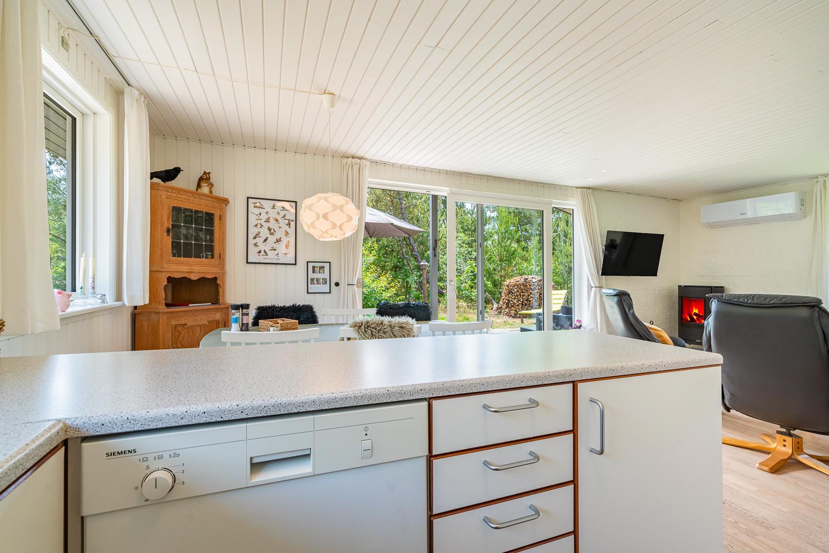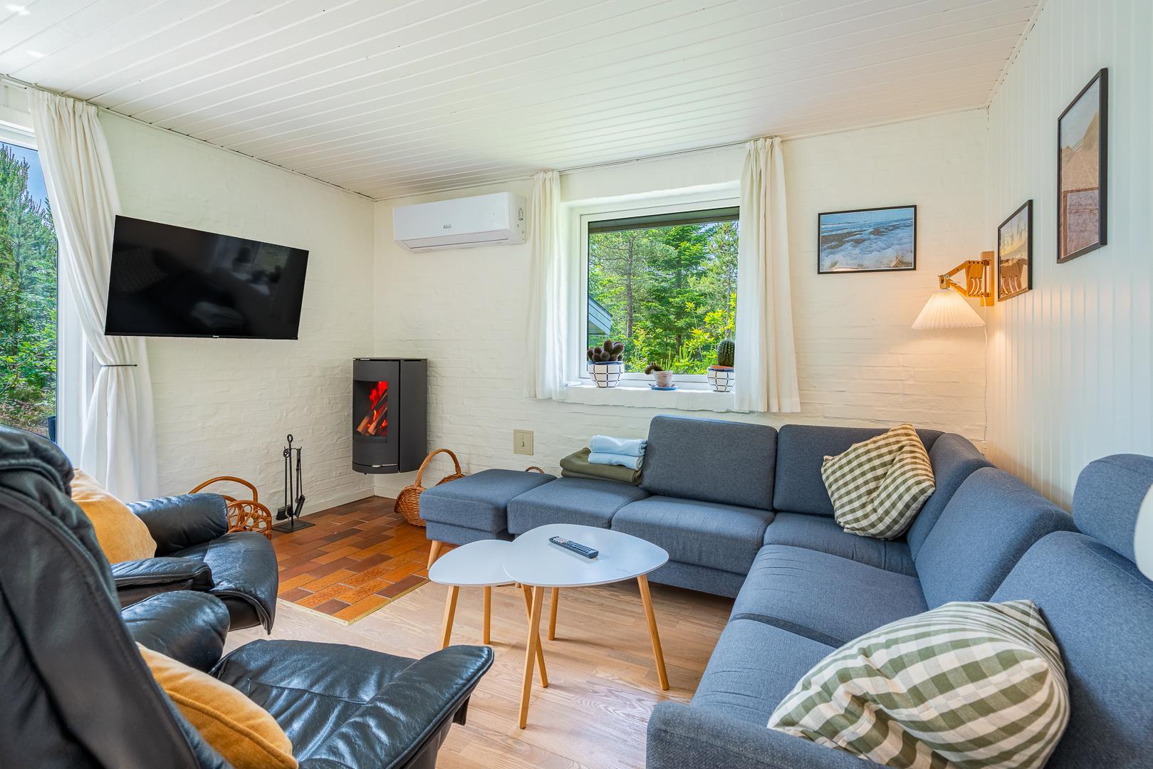 Det lyse opholdsrum er hjemmets hjerte, med store vinduer, der lukker naturen ind, og direkte adgang til terrassen. Brændeovnen skaber varme og stemning på kølige dage, mens varmepumpen sørger for et behageligt indeklima året rundt. TV med Chromecast giver mulighed for nem streaming af dine yndlingsfilm og serier.