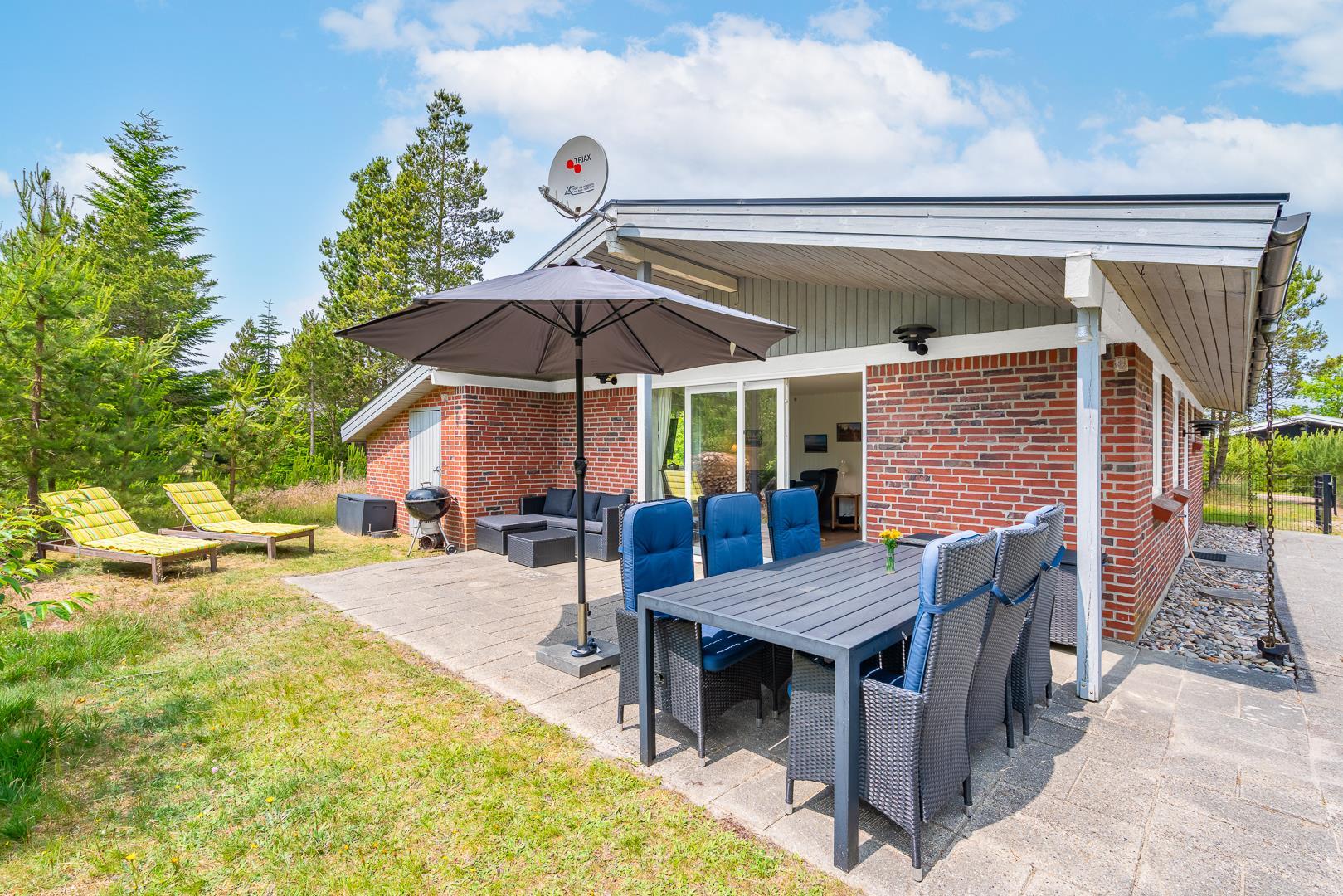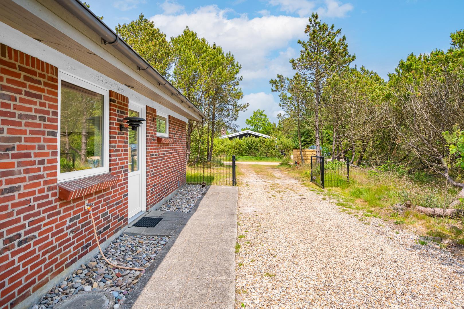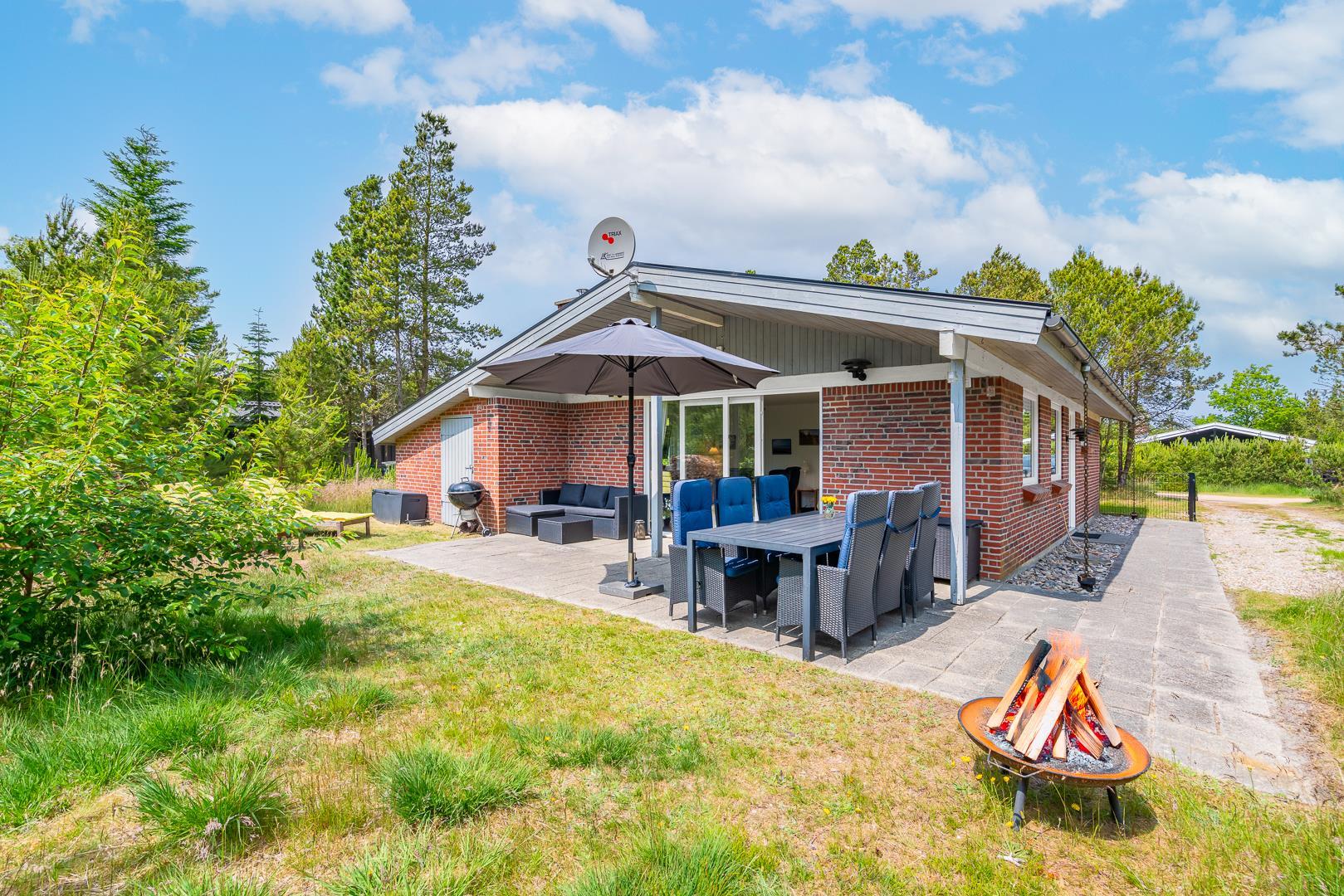 Udenfor finder du et skønt, roligt område, hvor du kan nyde naturen i fred og ro. Sommerhuset ligger på en stor, indhegnet naturgrund omgivet af høje træer og vestjysk hedelandskab – perfekt til både afslapning og leg.
