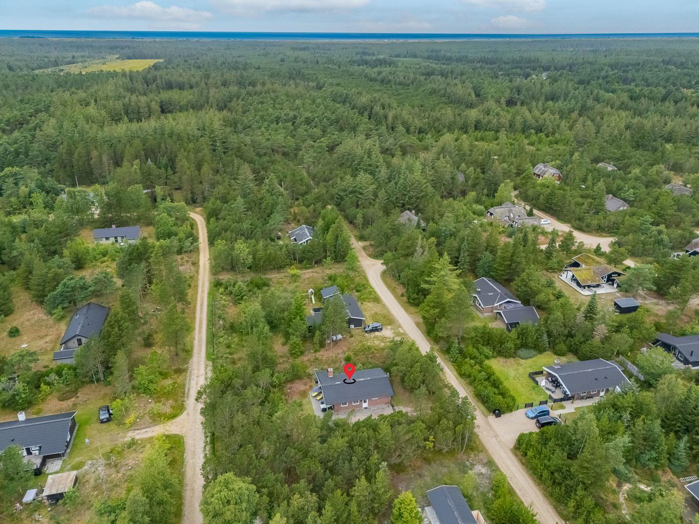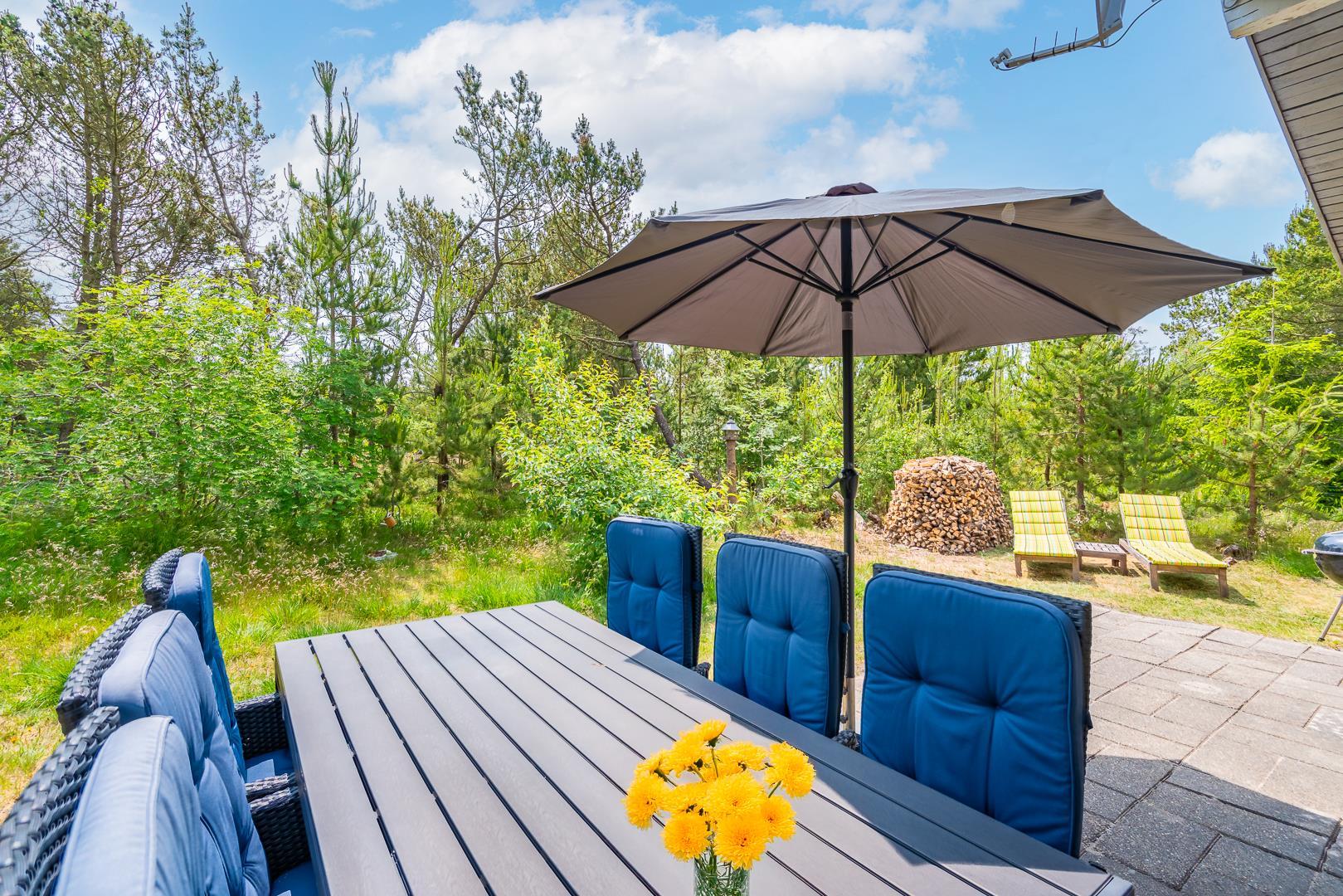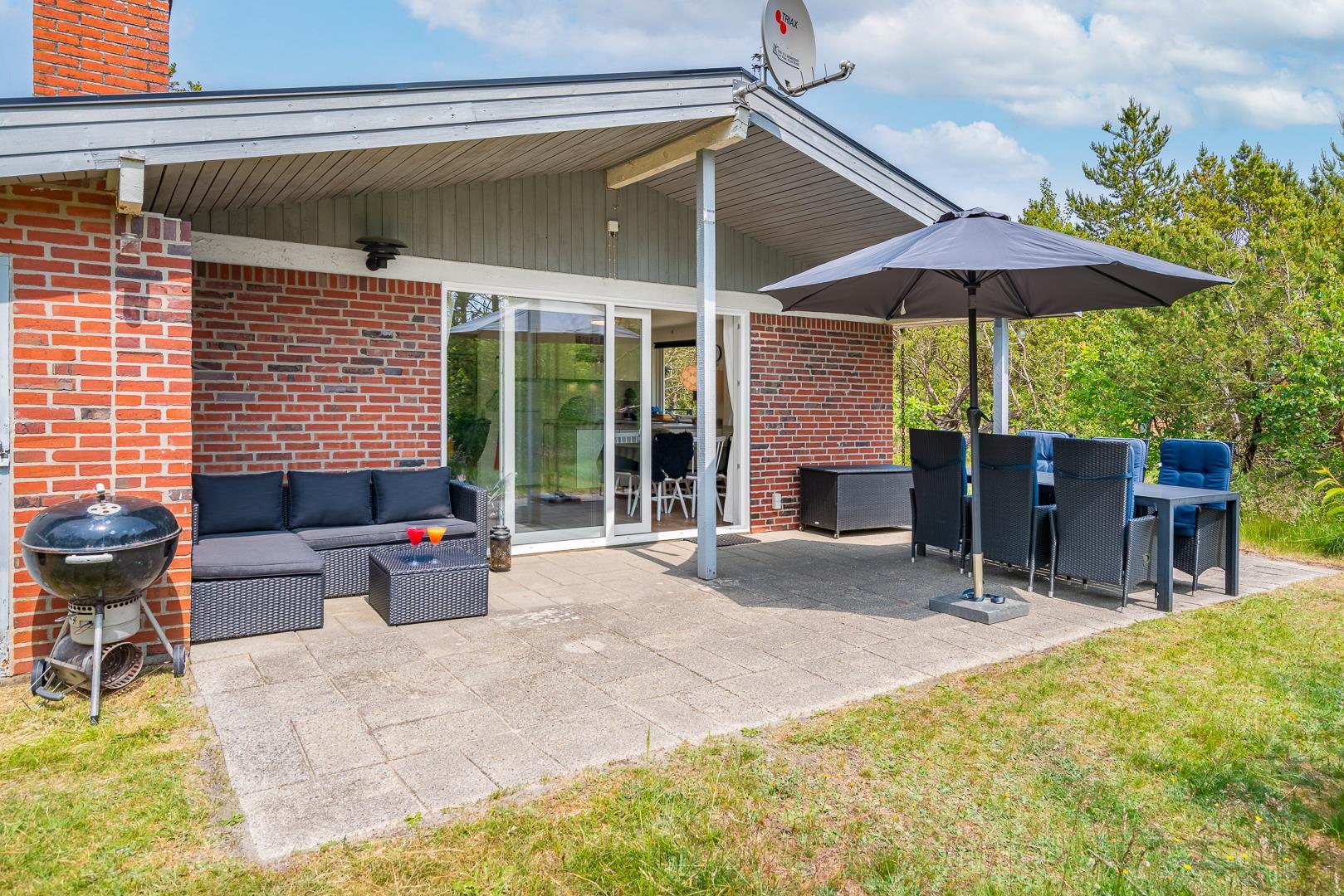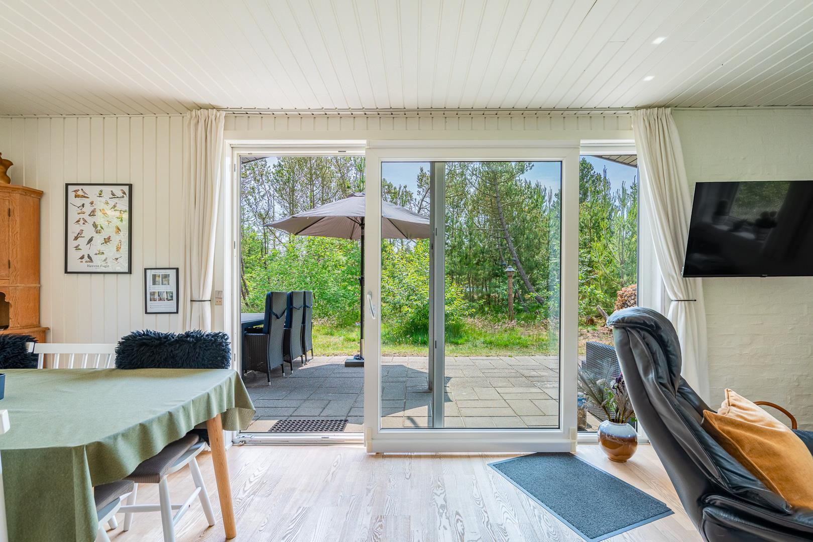 Udenfor finder du et skønt, roligt område, hvor du kan nyde naturen i fred og ro. Sommerhuset ligger på en stor, indhegnet naturgrund omgivet af høje træer og vestjysk hedelandskab – perfekt til både afslapning og leg.