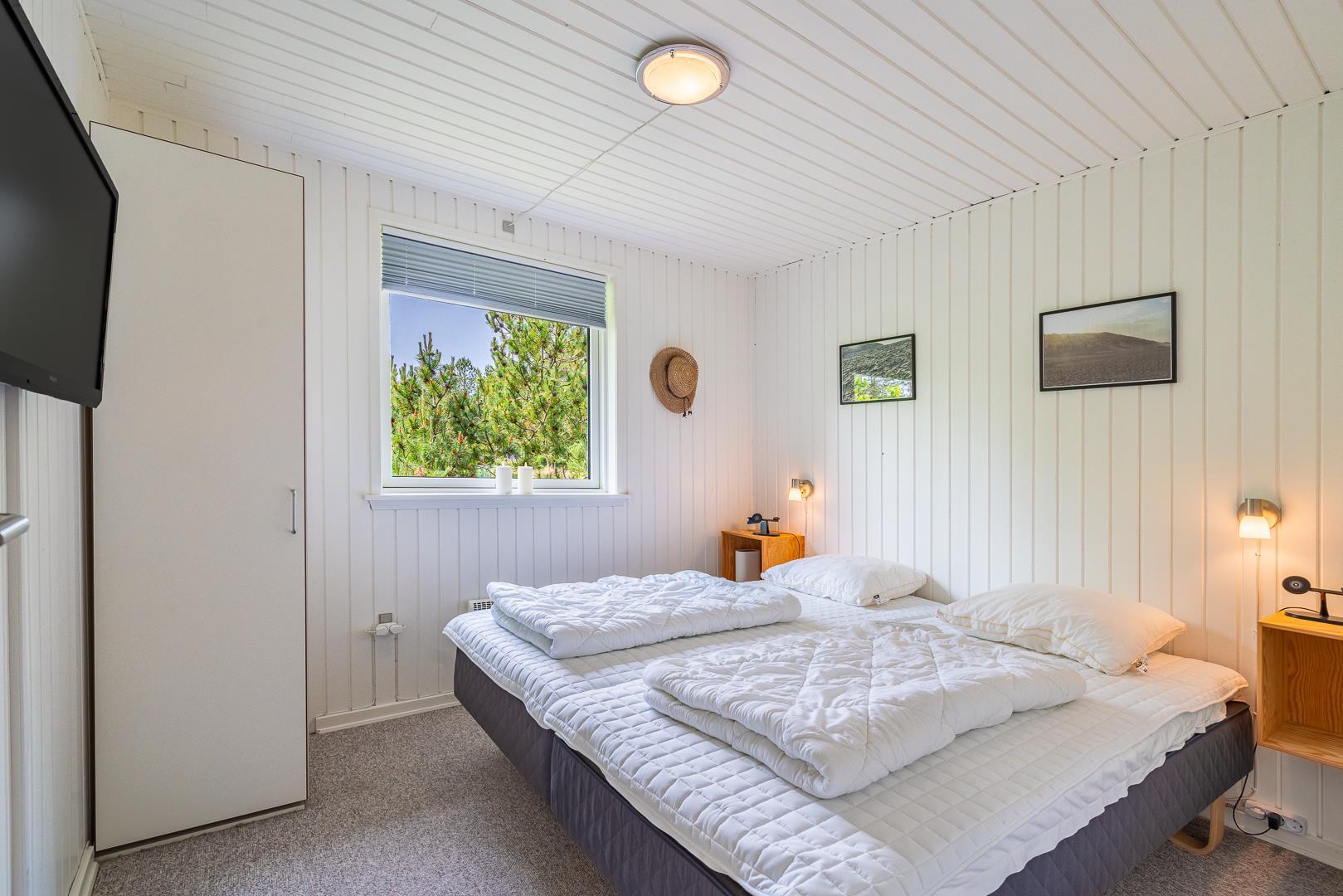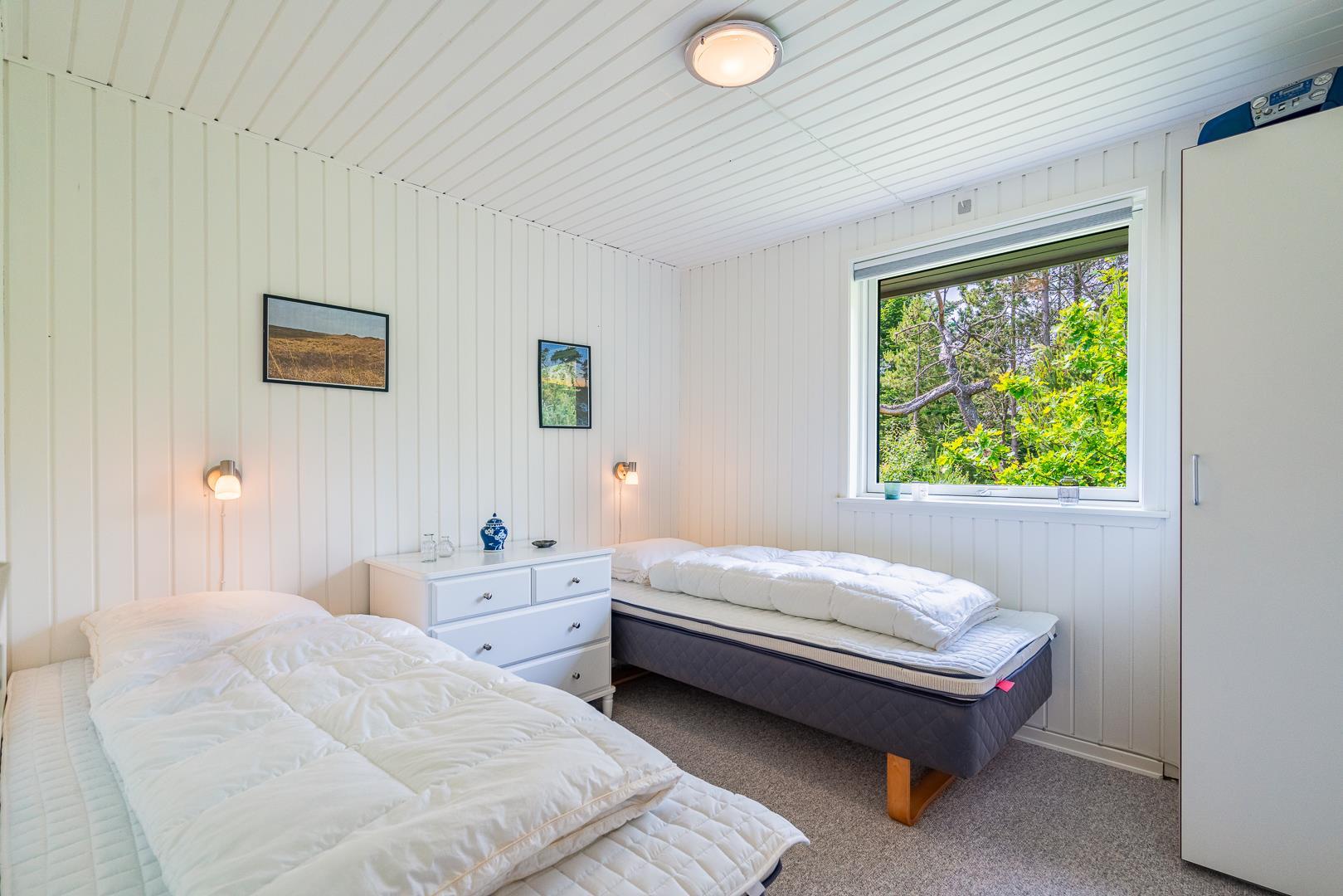 Der er tre soveværelser med plads til op til 5 personer: ét med dobbeltseng, ét med en 120 cm seng og to med enkeltsenge. Indretningen er enkel, lys og afslappet – perfekt til en god lur efter en dag ved stranden.