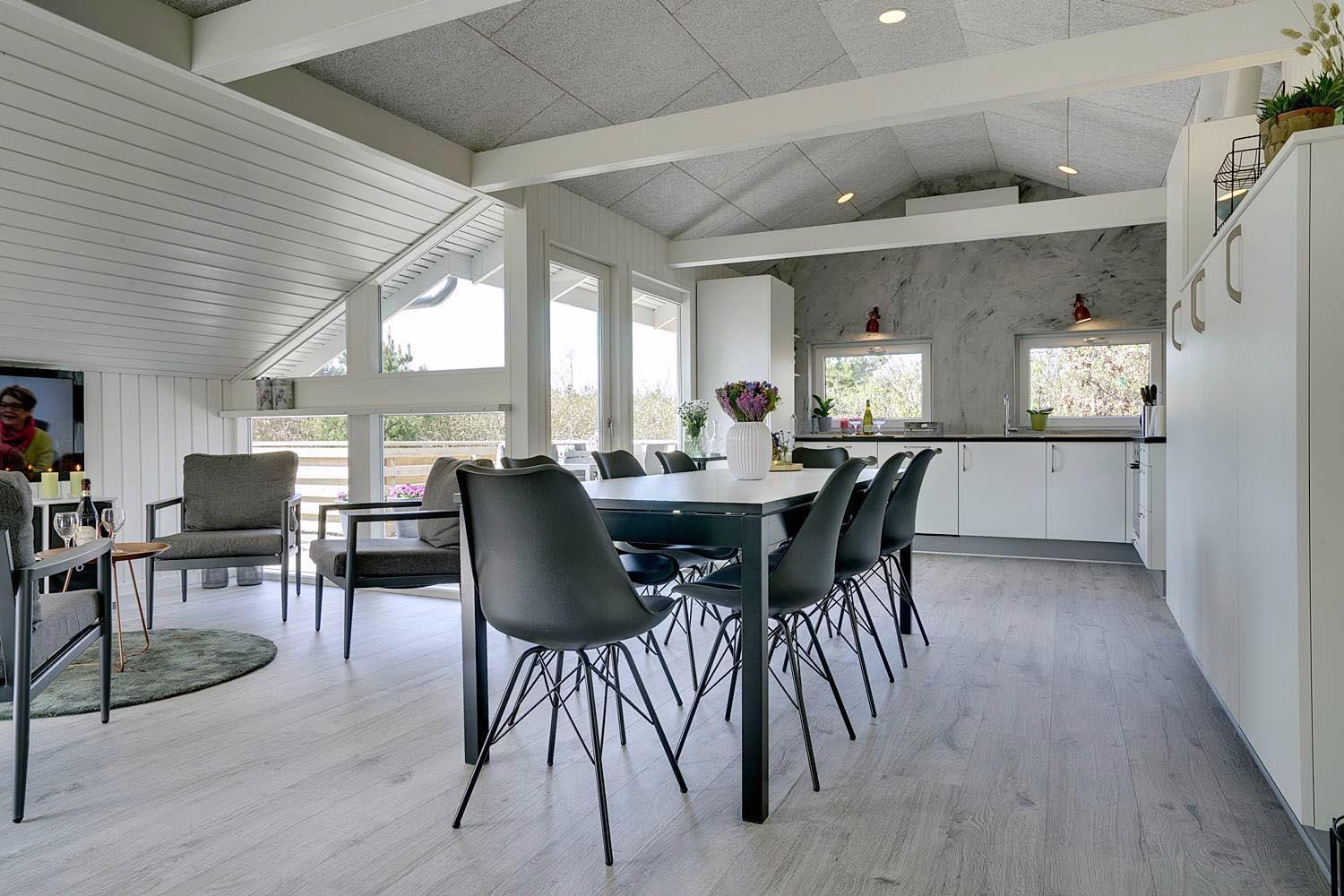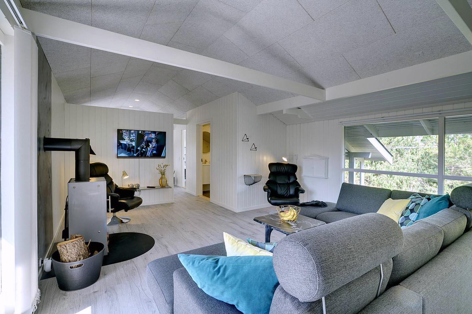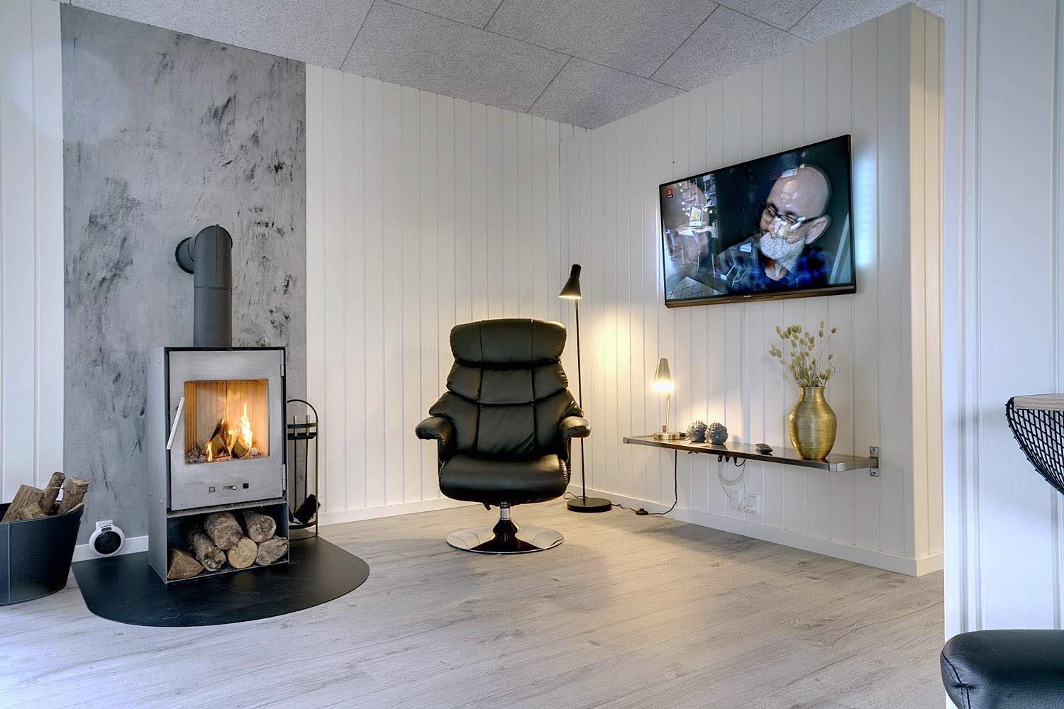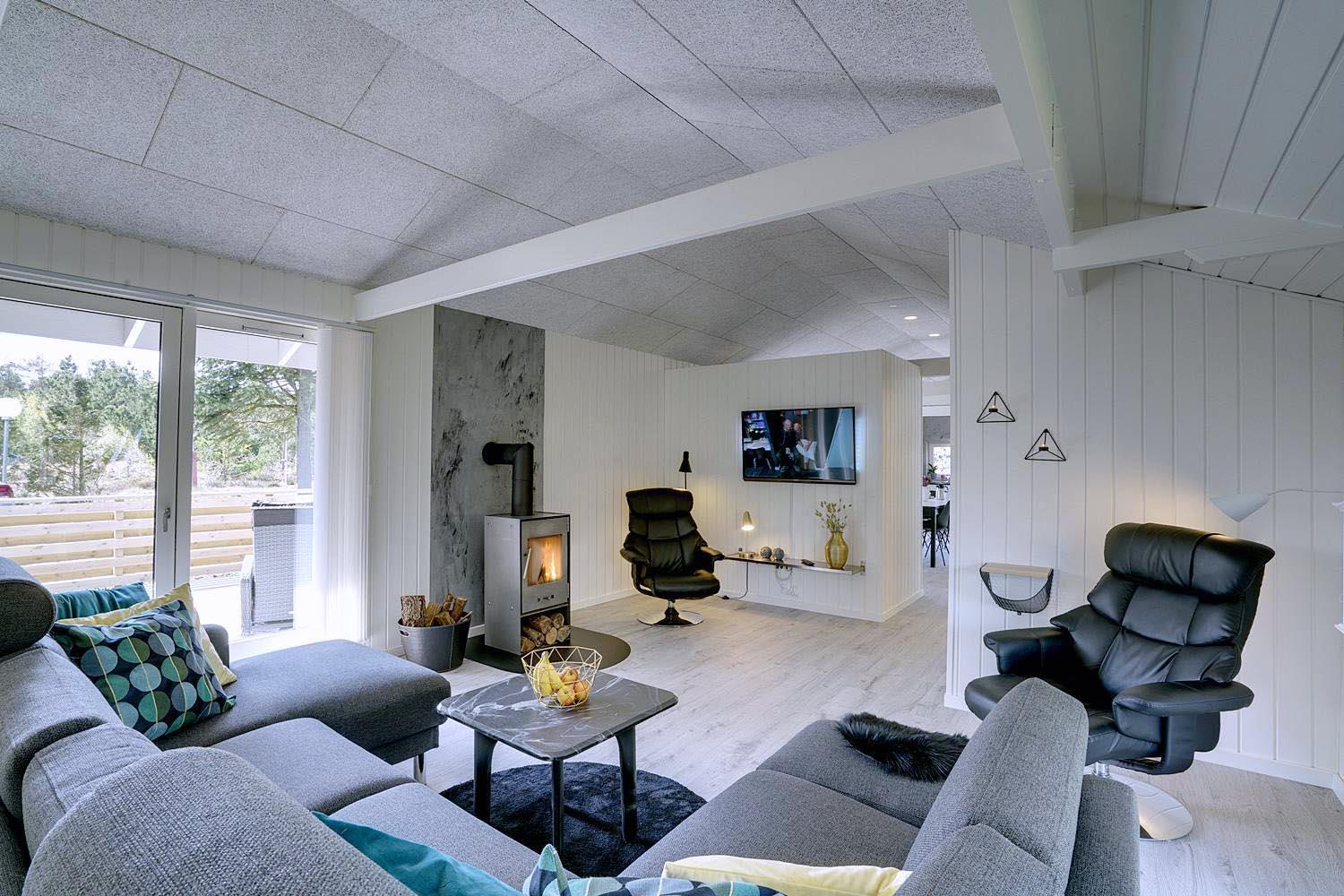 Åbent køkken-alrum med brændeovn, TV og moderne faciliteter