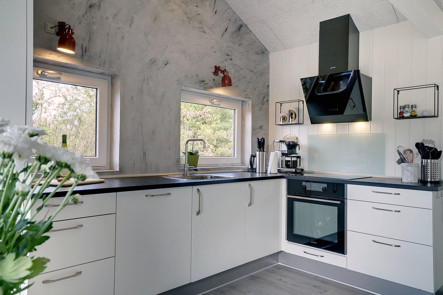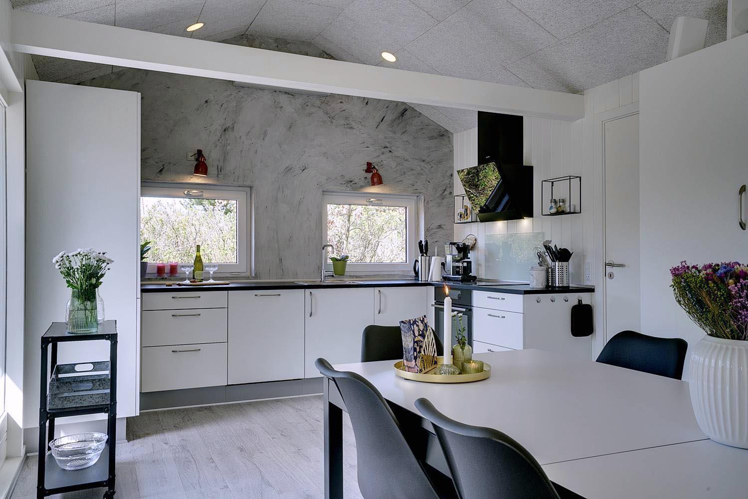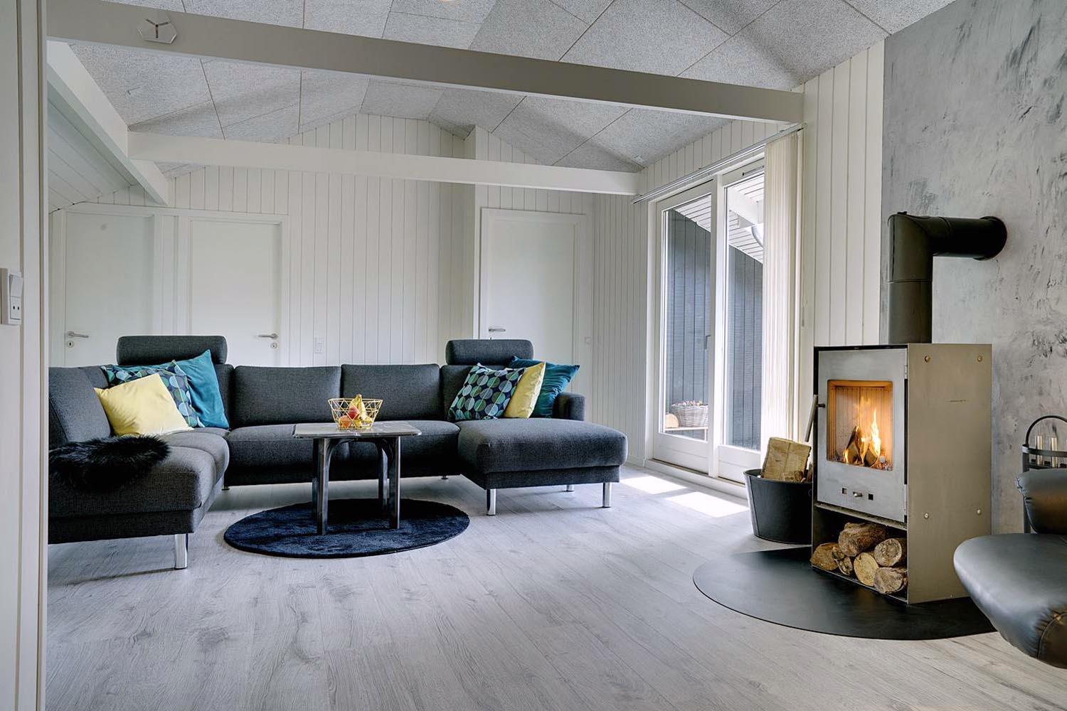 Den hyggelige opholdsstue er udstyret med brændeovn, TV og en radio med Bluetooth-funktion – perfekt til hyggelige aftener. Det åbne køkken har bl.a. opvaskemaskine og et køleskab med separat fryseafsnit (50 liter). En energivenlig varmepumpe sikrer et behageligt indeklima og lavere elforbrug.