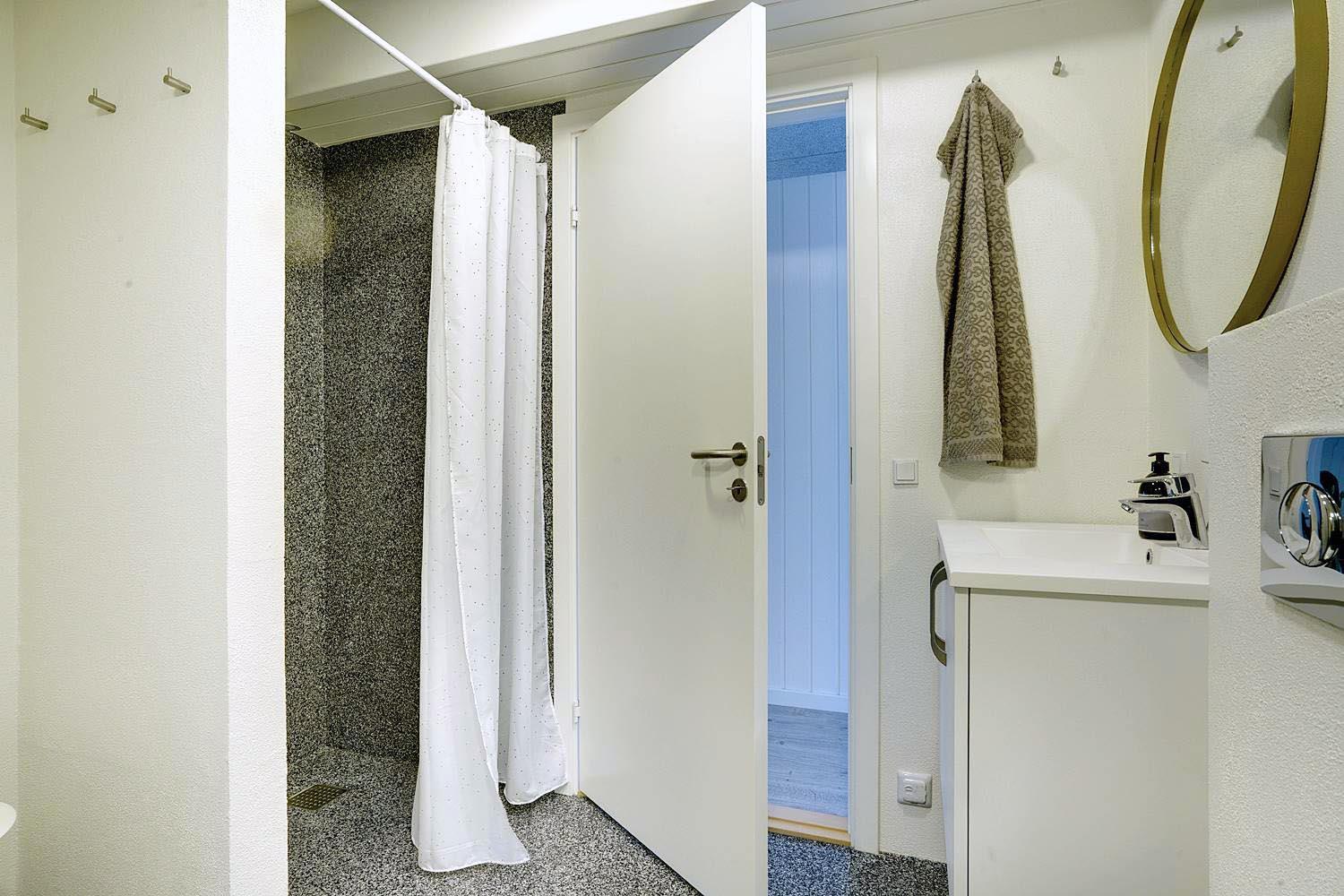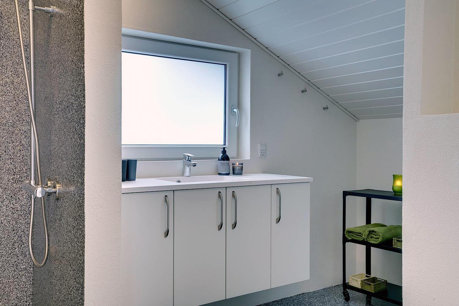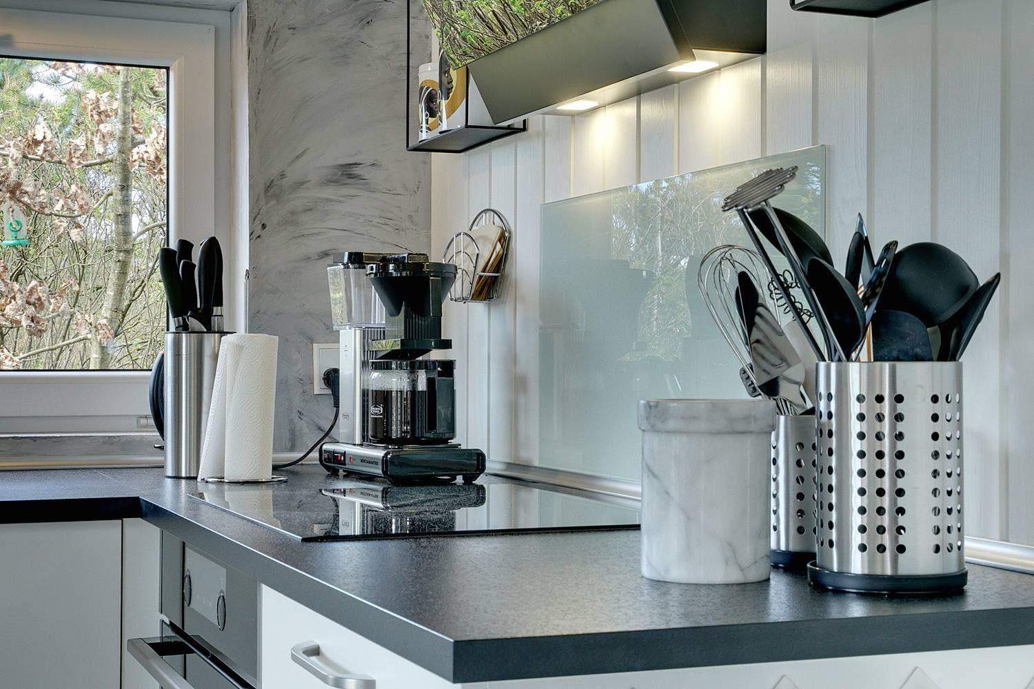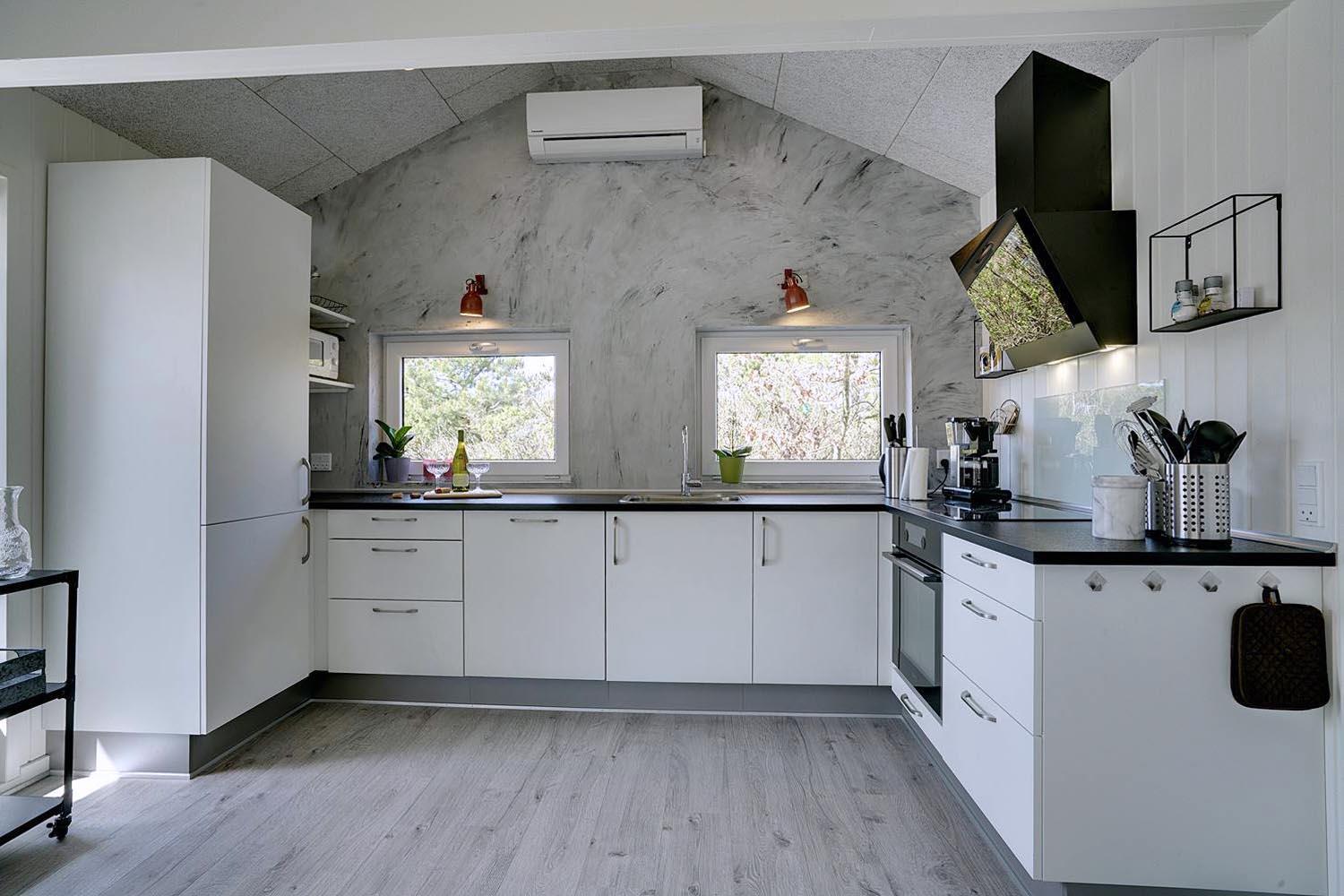 Den hyggelige opholdsstue er udstyret med brændeovn, TV og en radio med Bluetooth-funktion – perfekt til hyggelige aftener. Det åbne køkken har bl.a. opvaskemaskine og et køleskab med separat fryseafsnit (50 liter). En energivenlig varmepumpe sikrer et behageligt indeklima og lavere elforbrug.