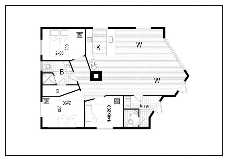 Sengestørrelse: 1 dobbeltseng med 2 madrasser 90 x 200 cm + 1 dobbeltseng med 2 madrasser 80 x 200 cm + 1 dobbeltseng 140 x 200 cm.