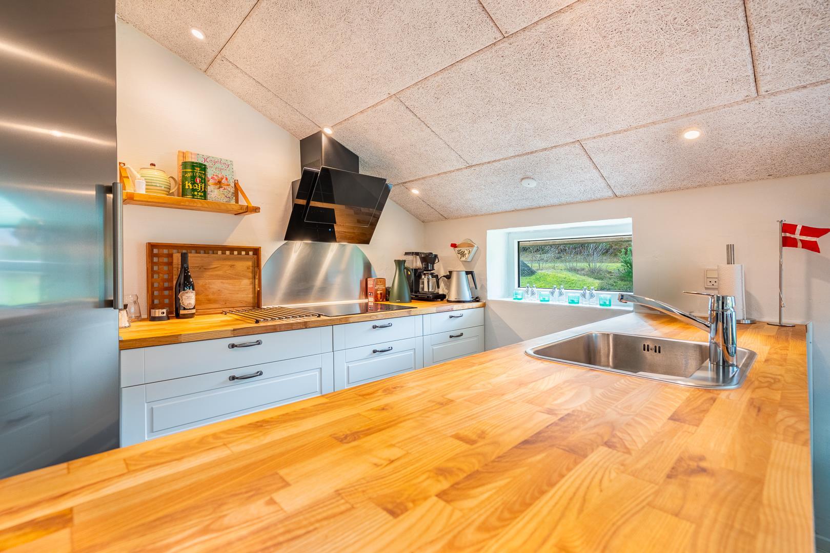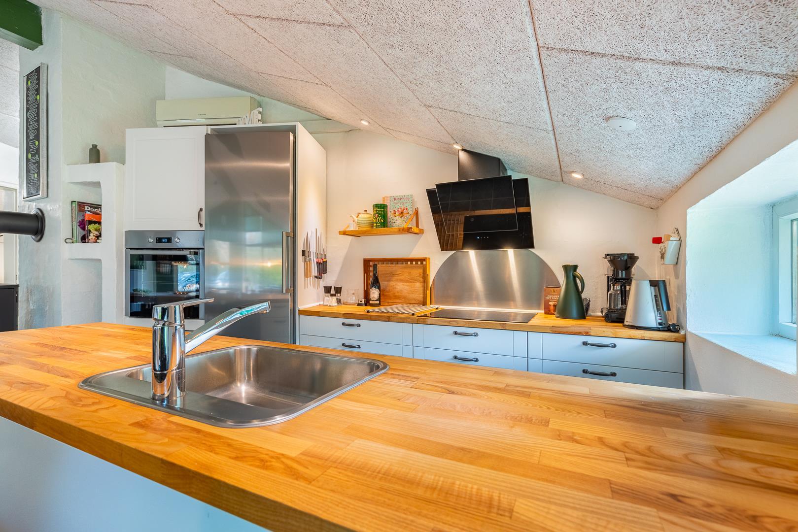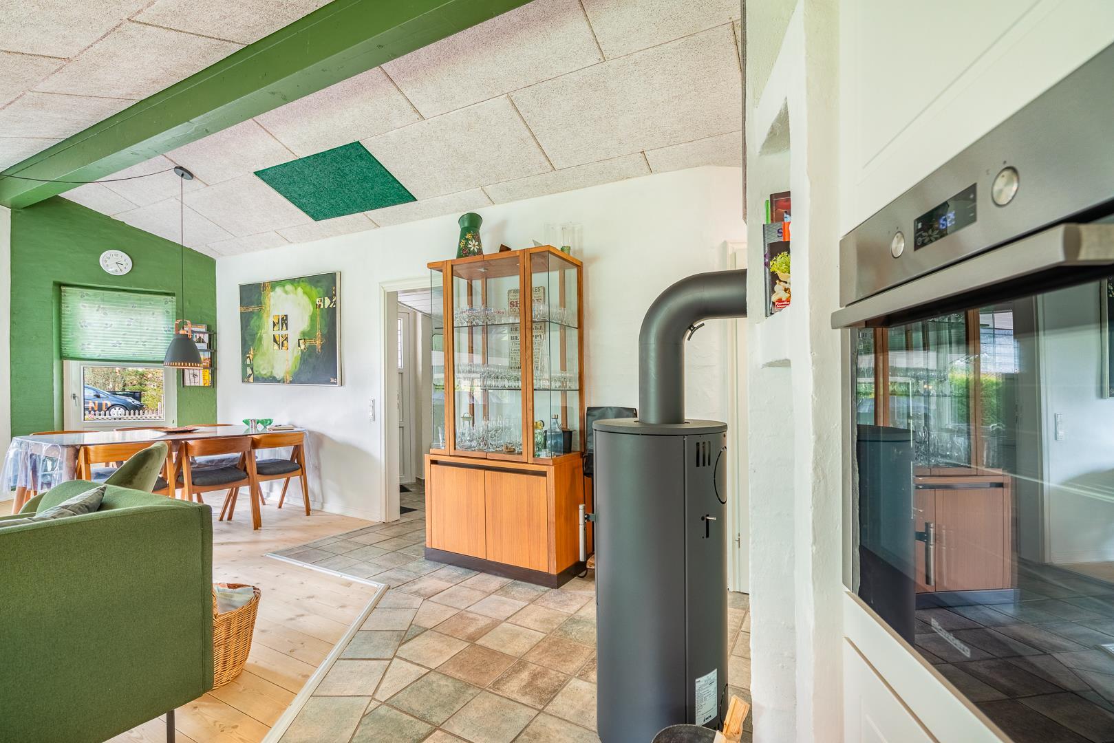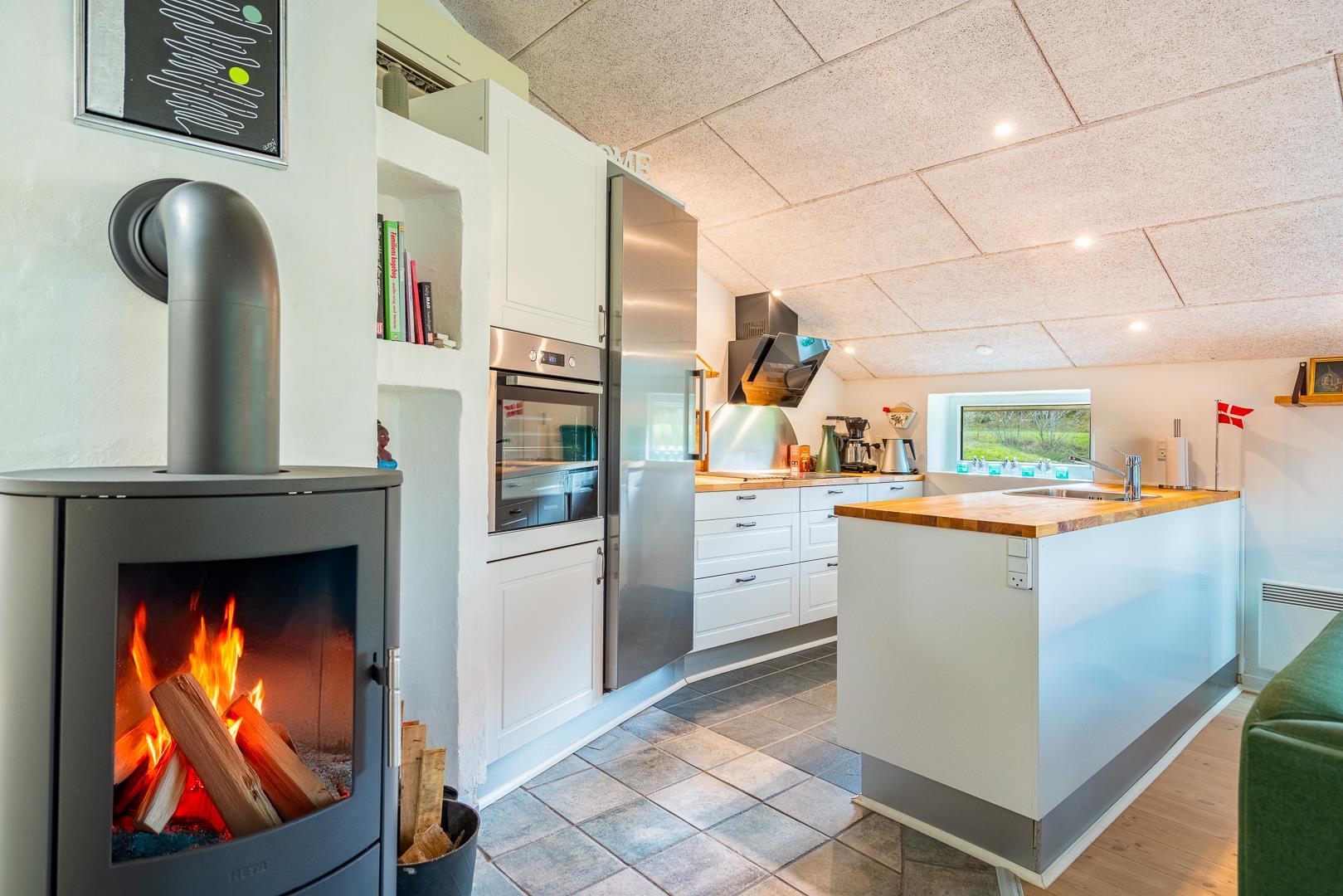 Husets hjerte er det åbne køkken/alrum, hvor brændeovnen spreder varme og skaber en hyggelig atmosfære. Her kan I nyde lange middage, spille spil eller udfordre hinanden i en omgang Wii. Fra stuen har I direkte adgang til en delvist overdækket terrasse, hvor I kan nyde morgenkaffen eller lune sommeraftener med udsigt til den store grund. Grunden giver rig mulighed for leg og boldspil, og for de eventyrlystne er her et shelter, hvor I kan prøve at sove under åben himmel.