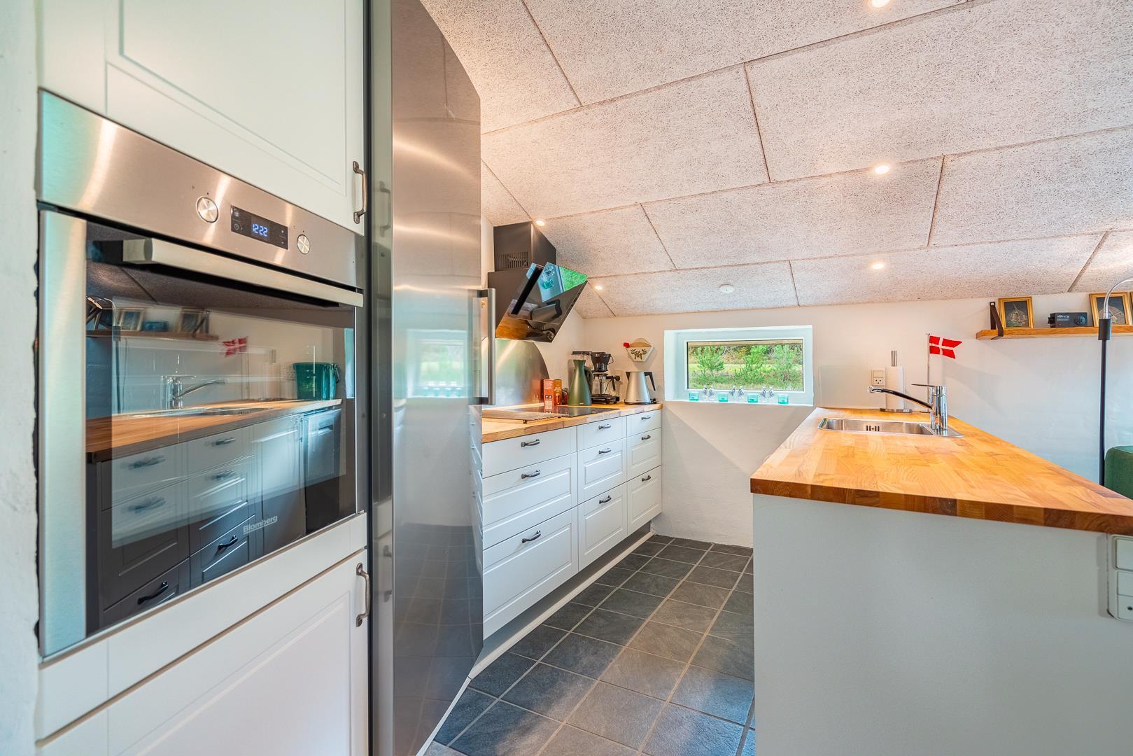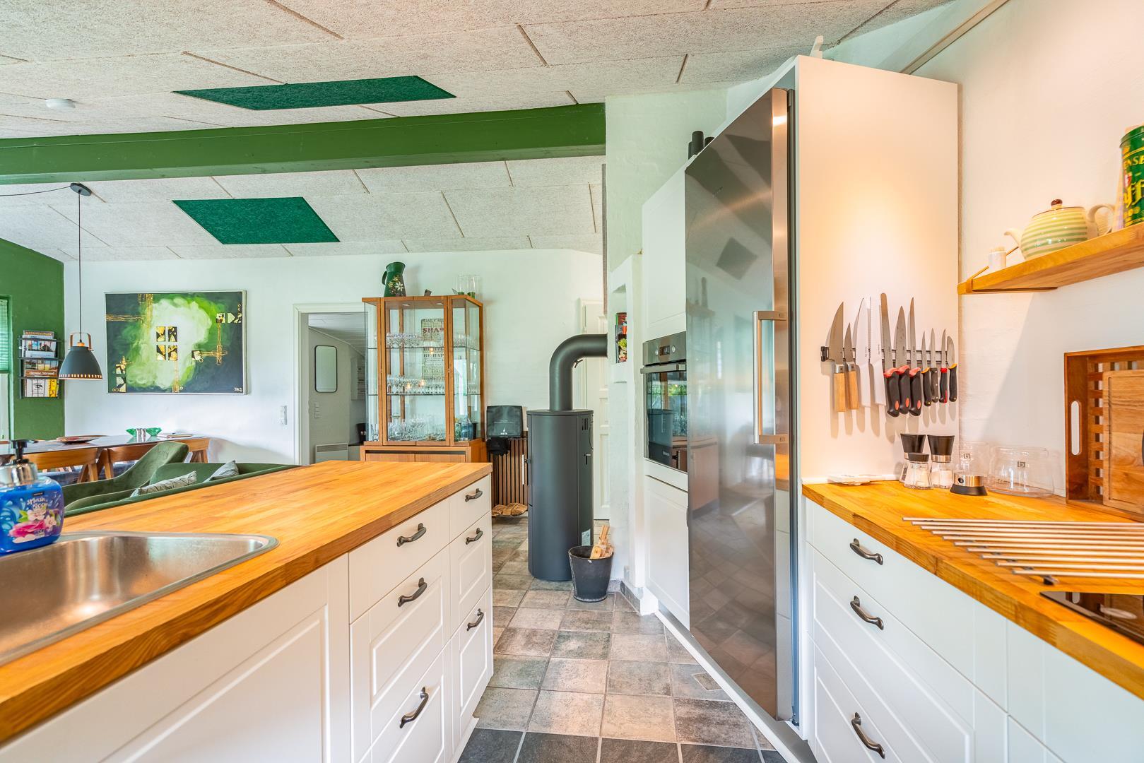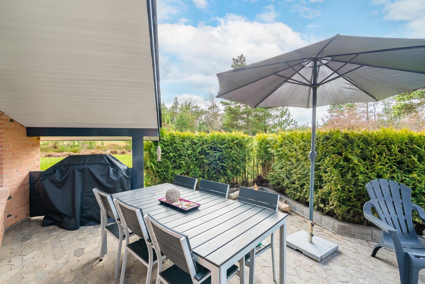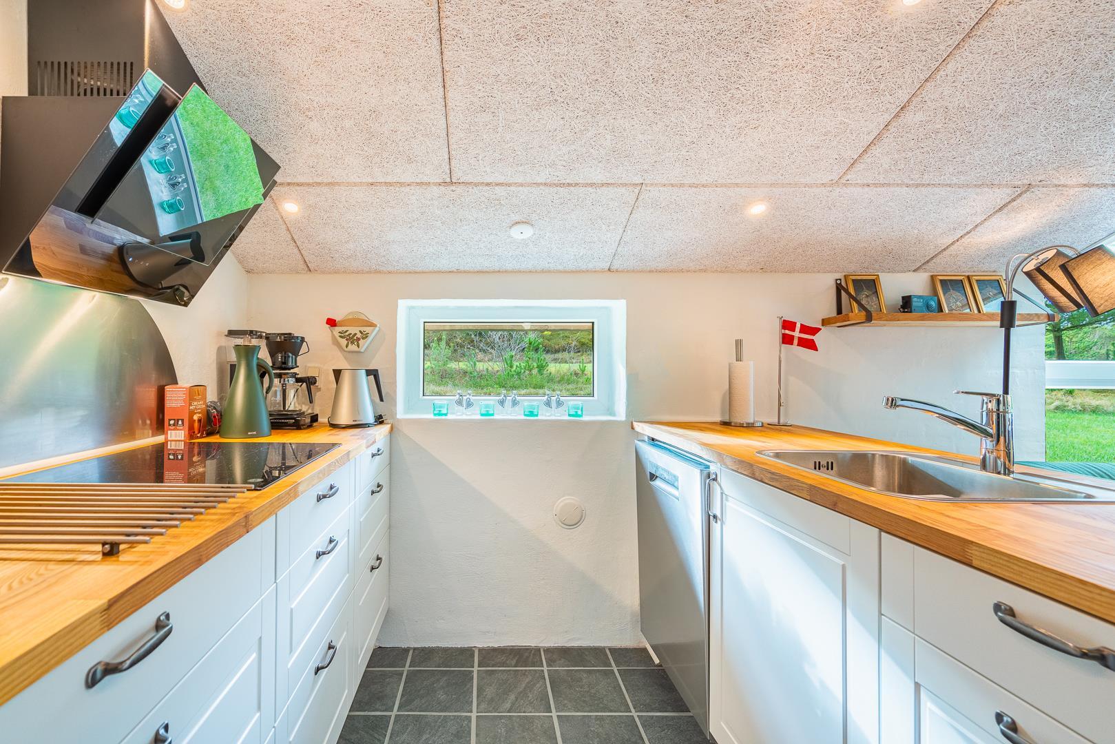 Husets hjerte er det åbne køkken/alrum, hvor brændeovnen spreder varme og skaber en hyggelig atmosfære. Her kan I nyde lange middage, spille spil eller udfordre hinanden i en omgang Wii. Fra stuen har I direkte adgang til en delvist overdækket terrasse, hvor I kan nyde morgenkaffen eller lune sommeraftener med udsigt til den store grund. Grunden giver rig mulighed for leg og boldspil, og for de eventyrlystne er her et shelter, hvor I kan prøve at sove under åben himmel.