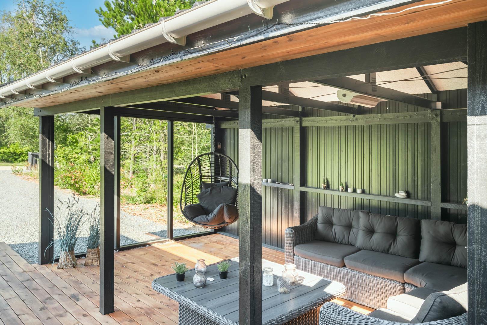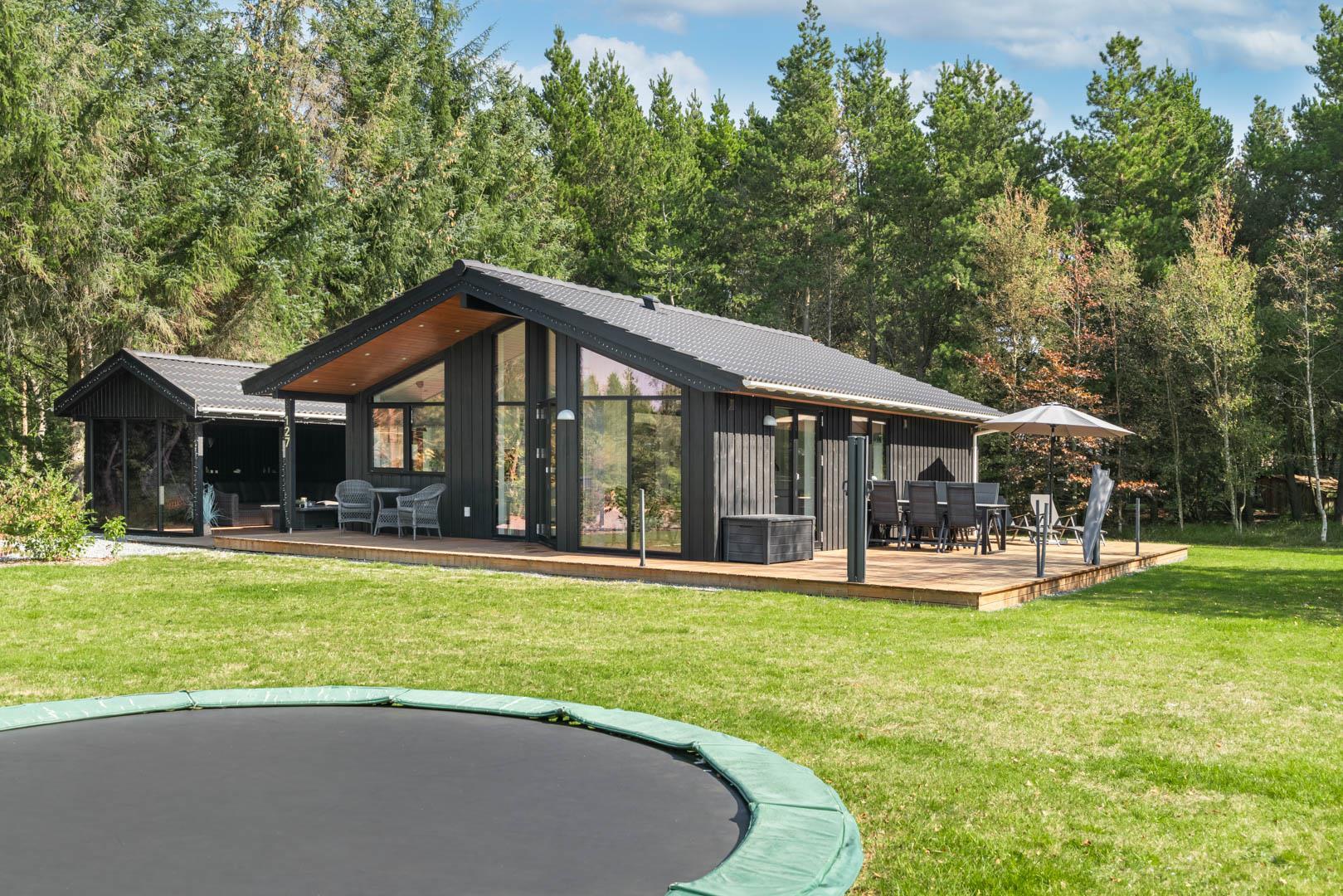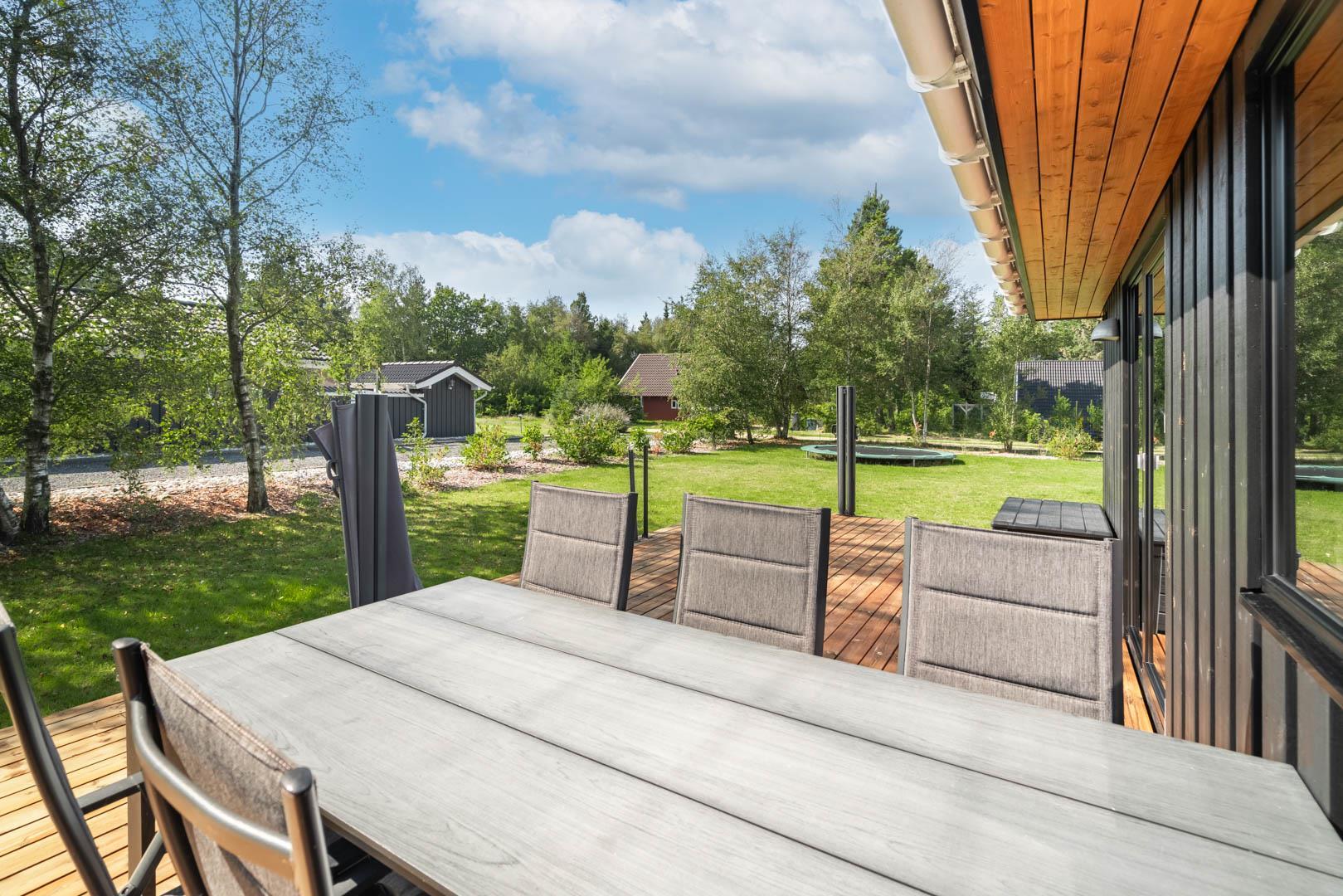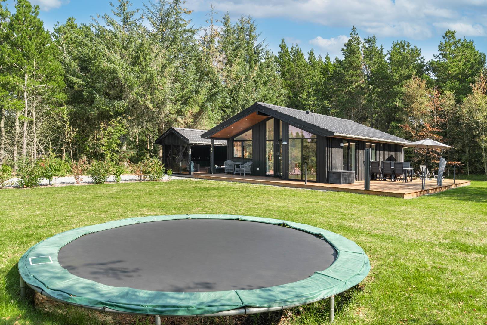 Udenfor kan du nyde den overdækkede terrasse, mens børnene leger på trampolinen. I depotrummet er der plads til to cykler.