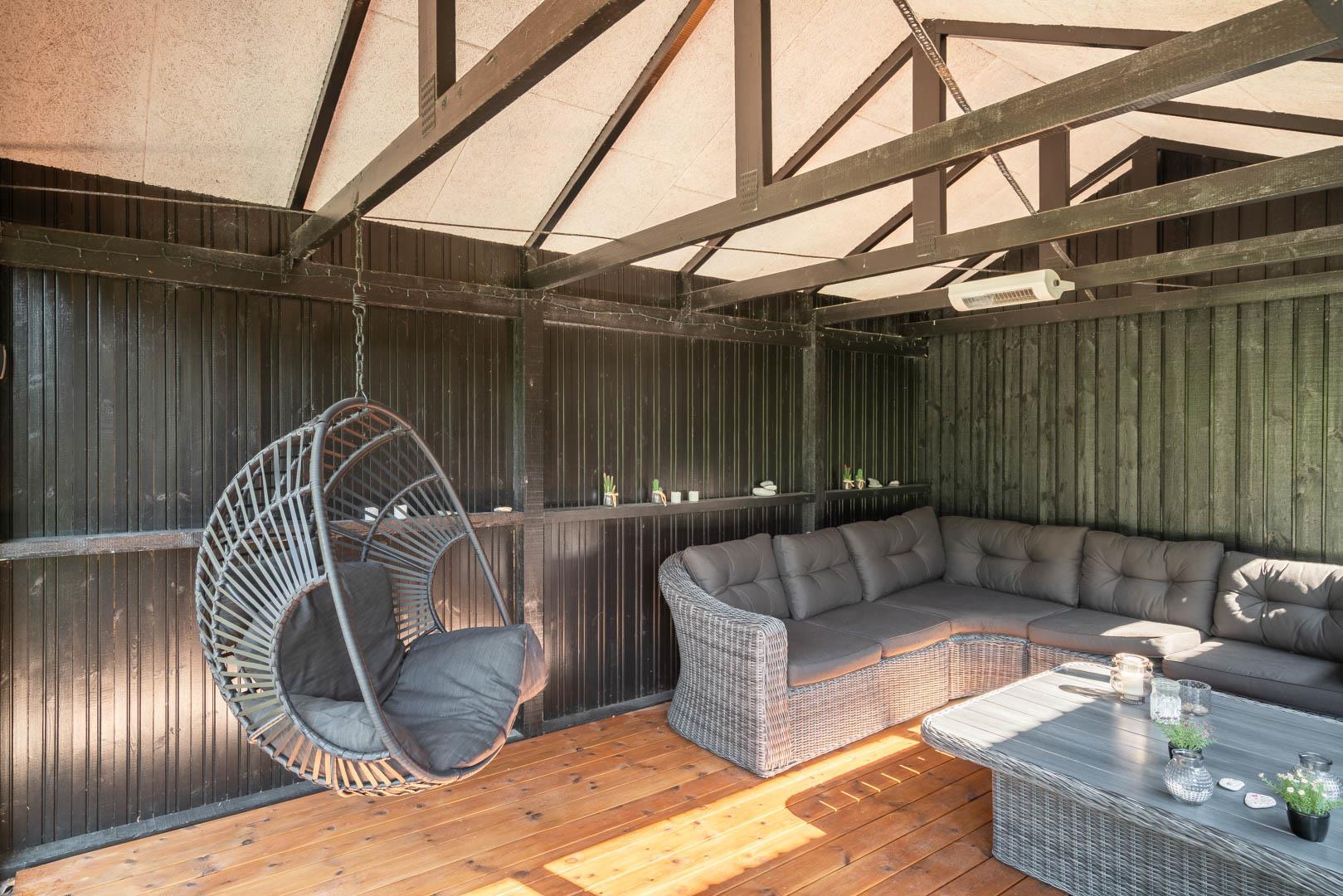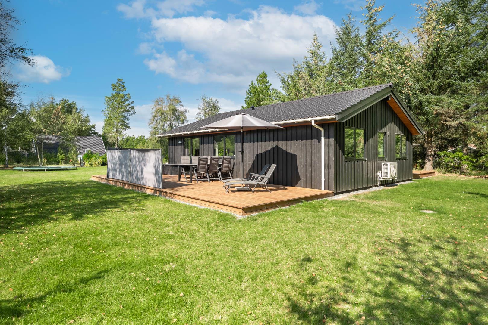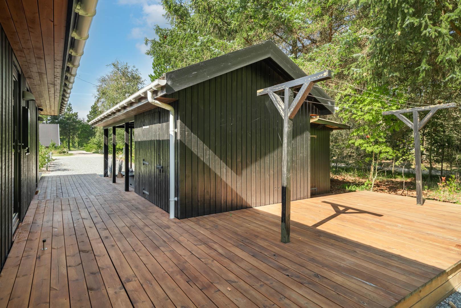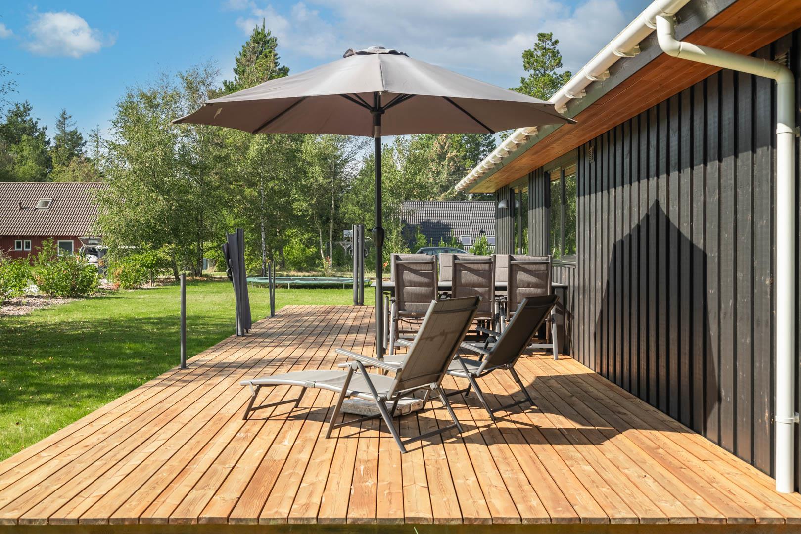 Udenfor kan du nyde den overdækkede terrasse, mens børnene leger på trampolinen. I depotrummet er der plads til to cykler.
