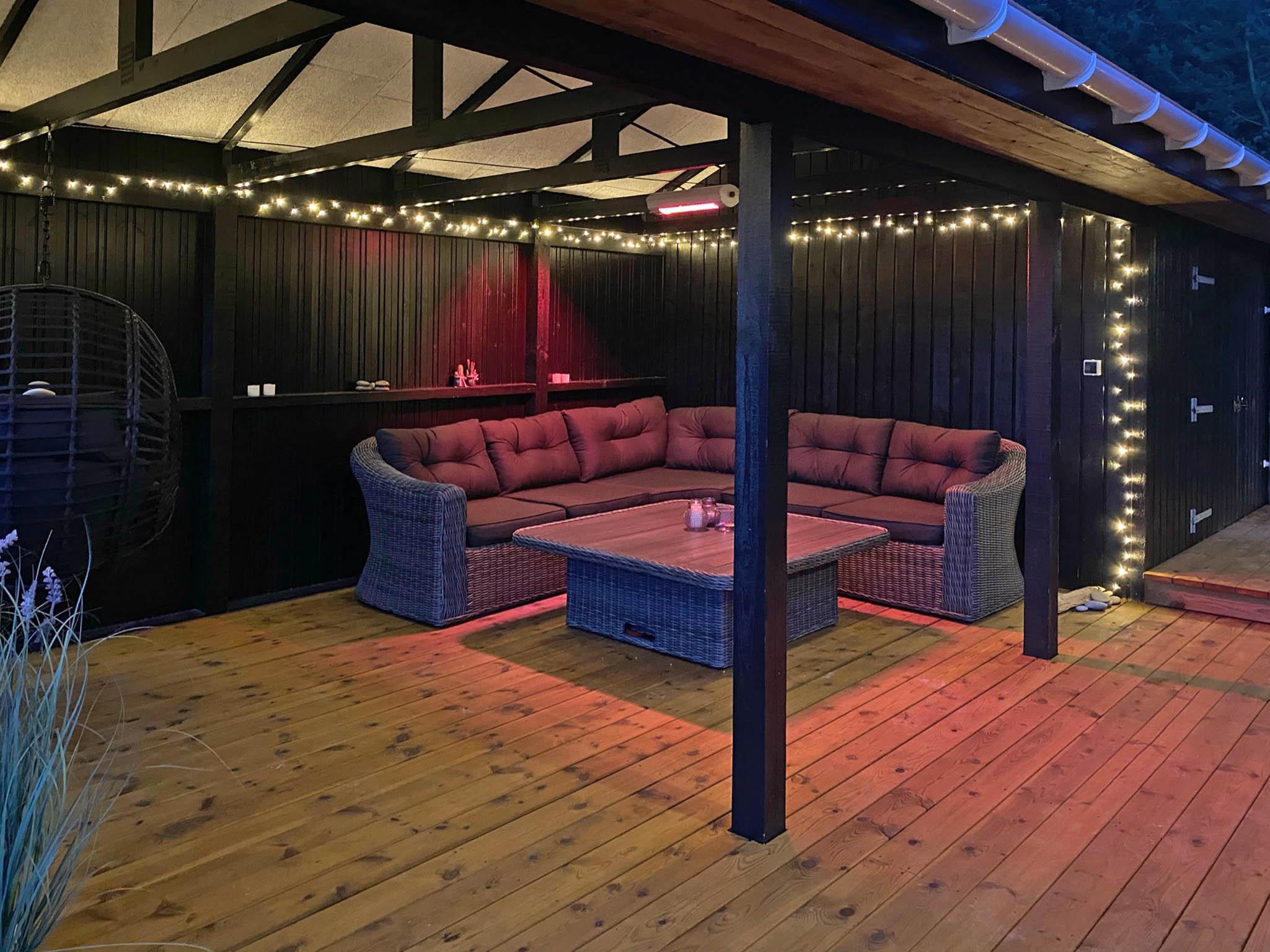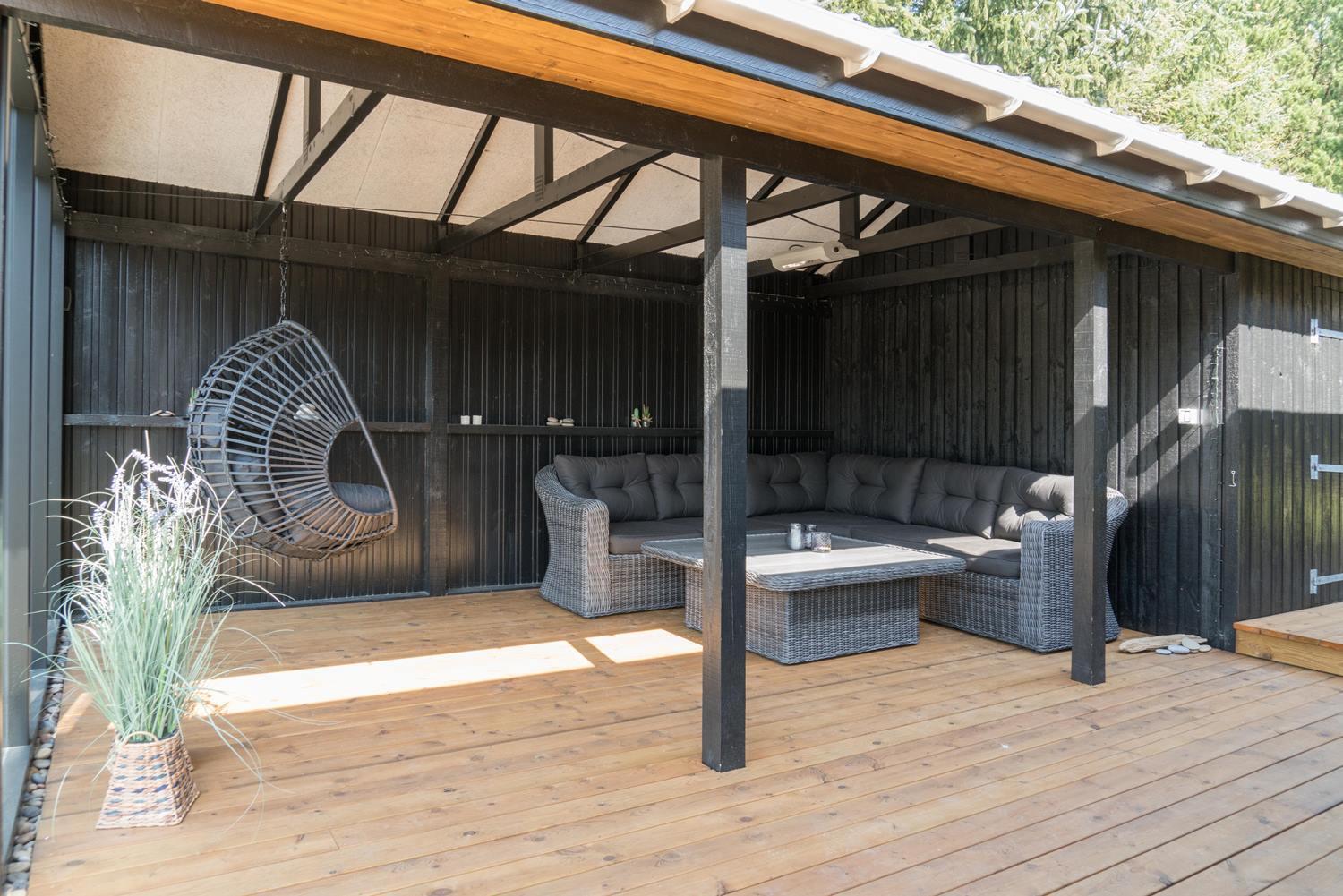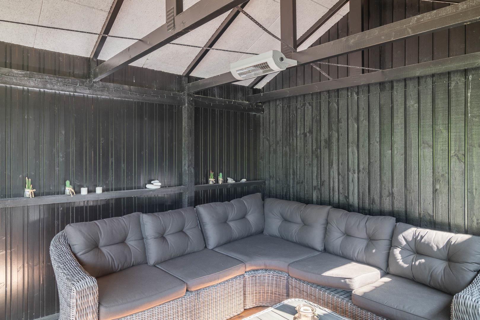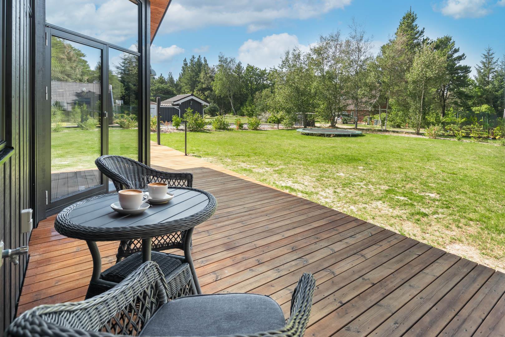 Udenfor kan du nyde den overdækkede terrasse, mens børnene leger på trampolinen. I depotrummet er der plads til to cykler.