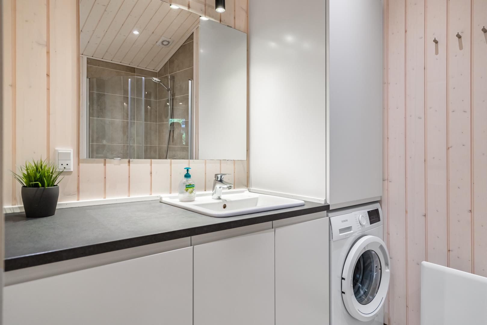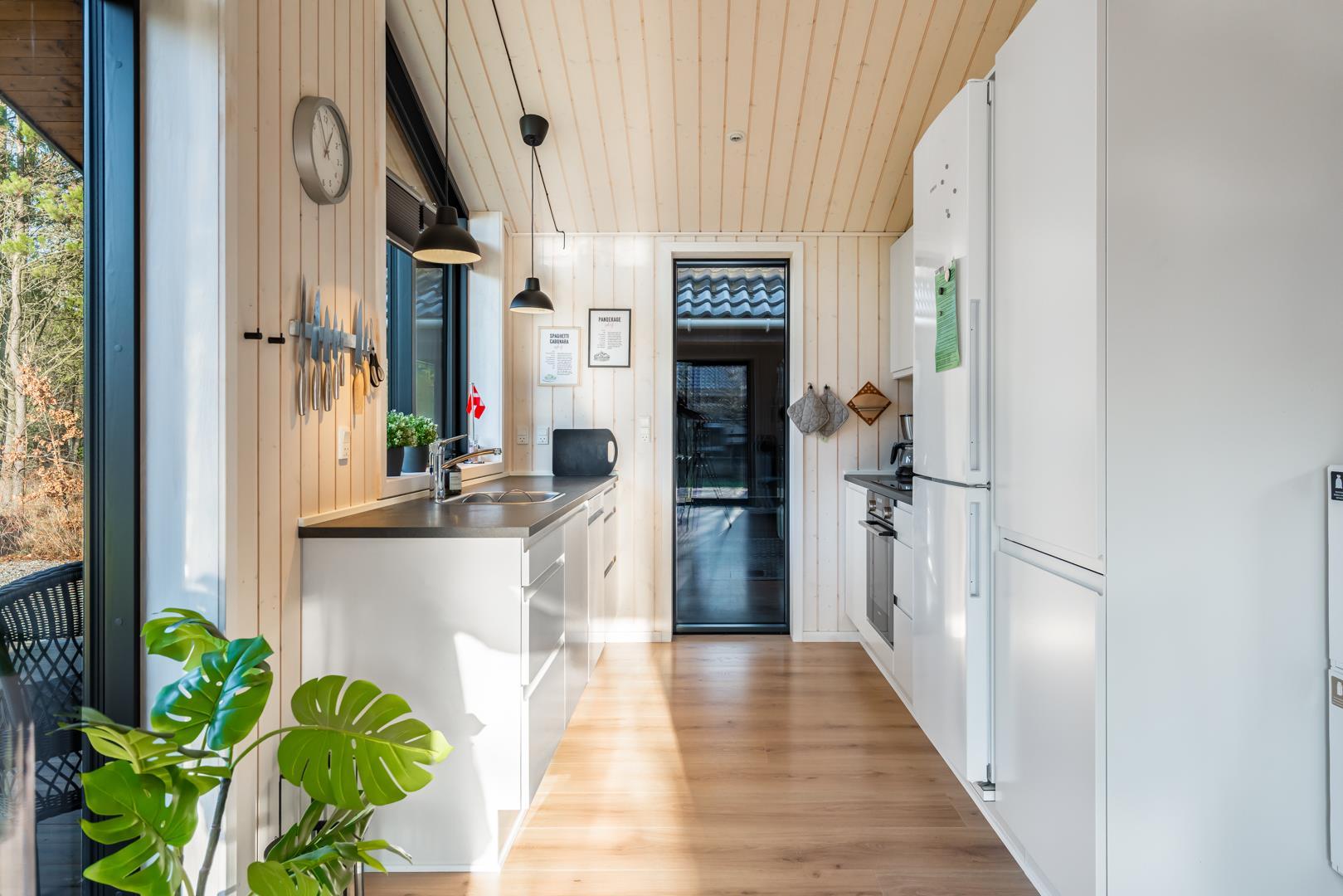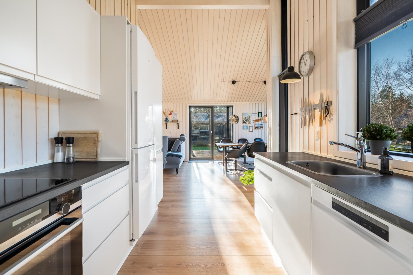 Det veludstyrede køkken med opvaskemaskine gør madlavningen nem, og huset råder desuden over vaskemaskine, værdiboks, energivenlige varmepumpe samt gulvvarme på badeværelset.