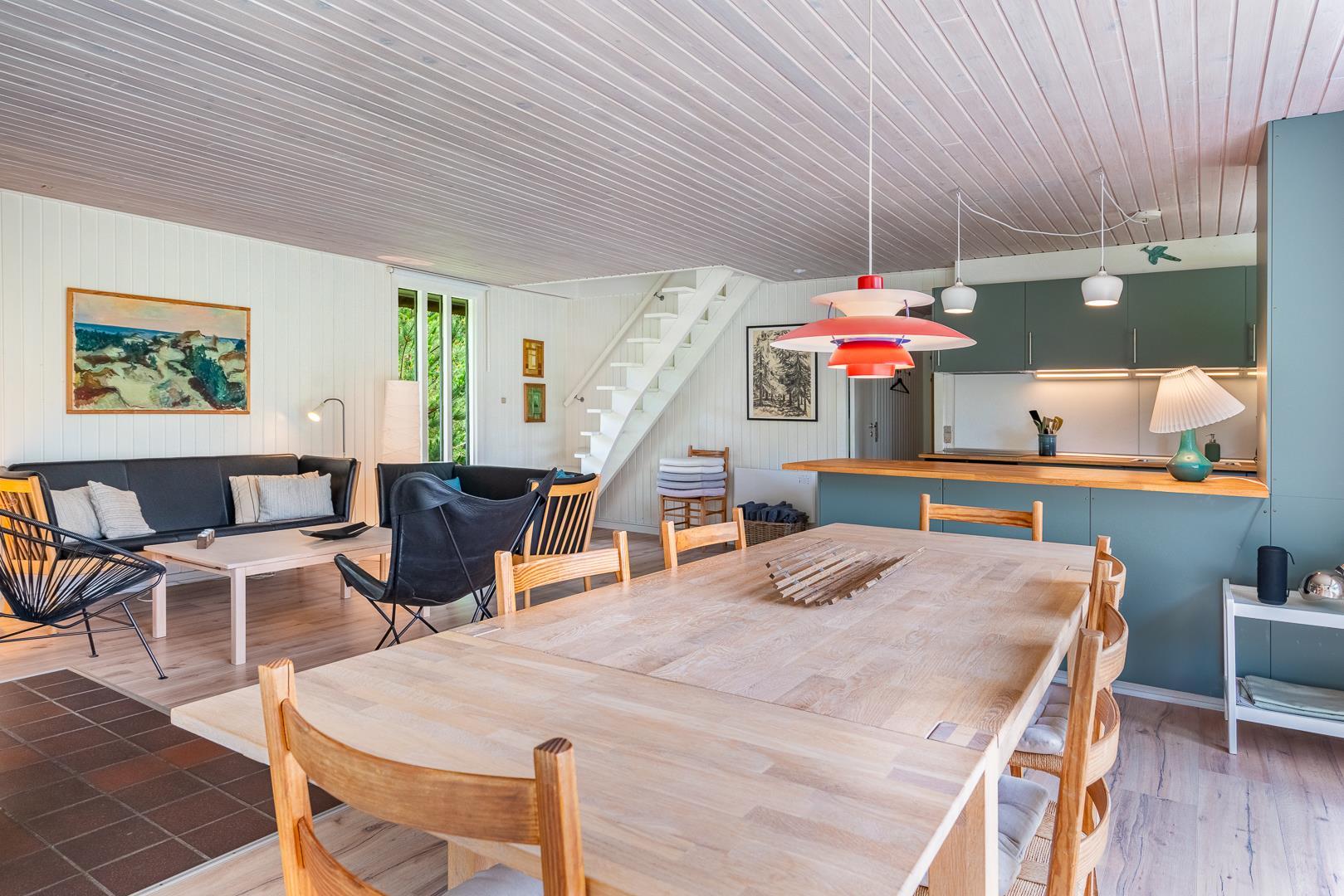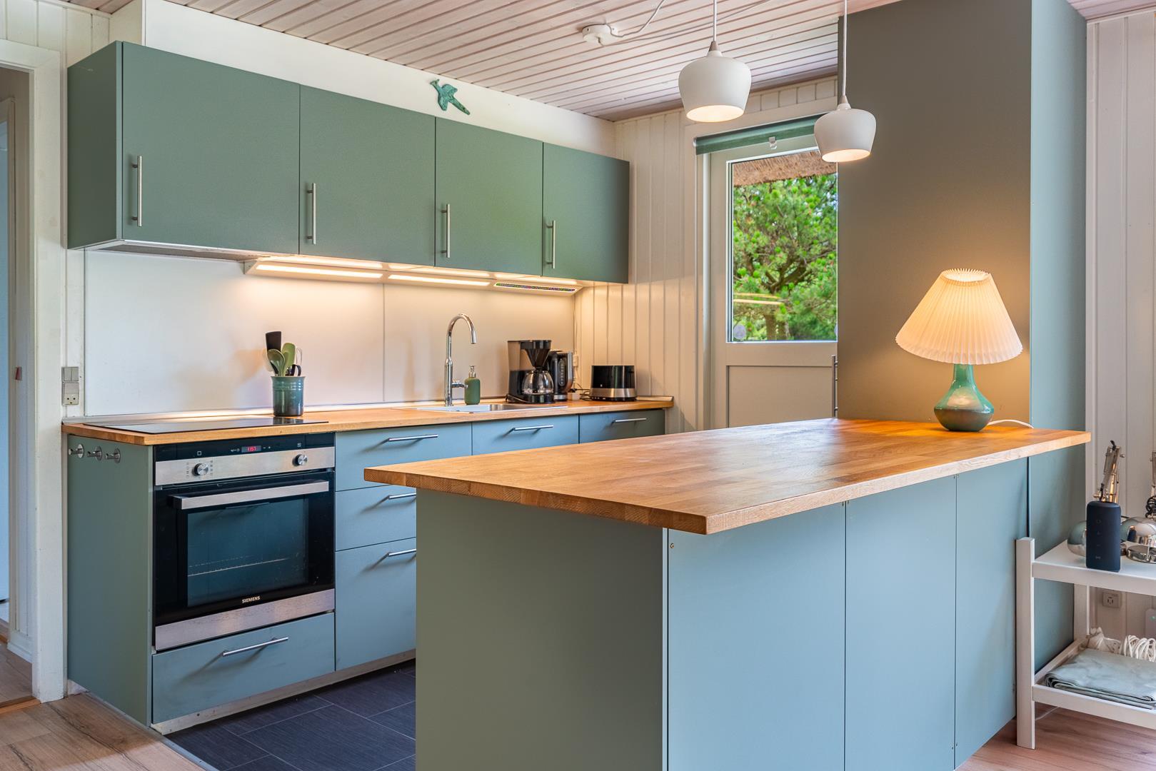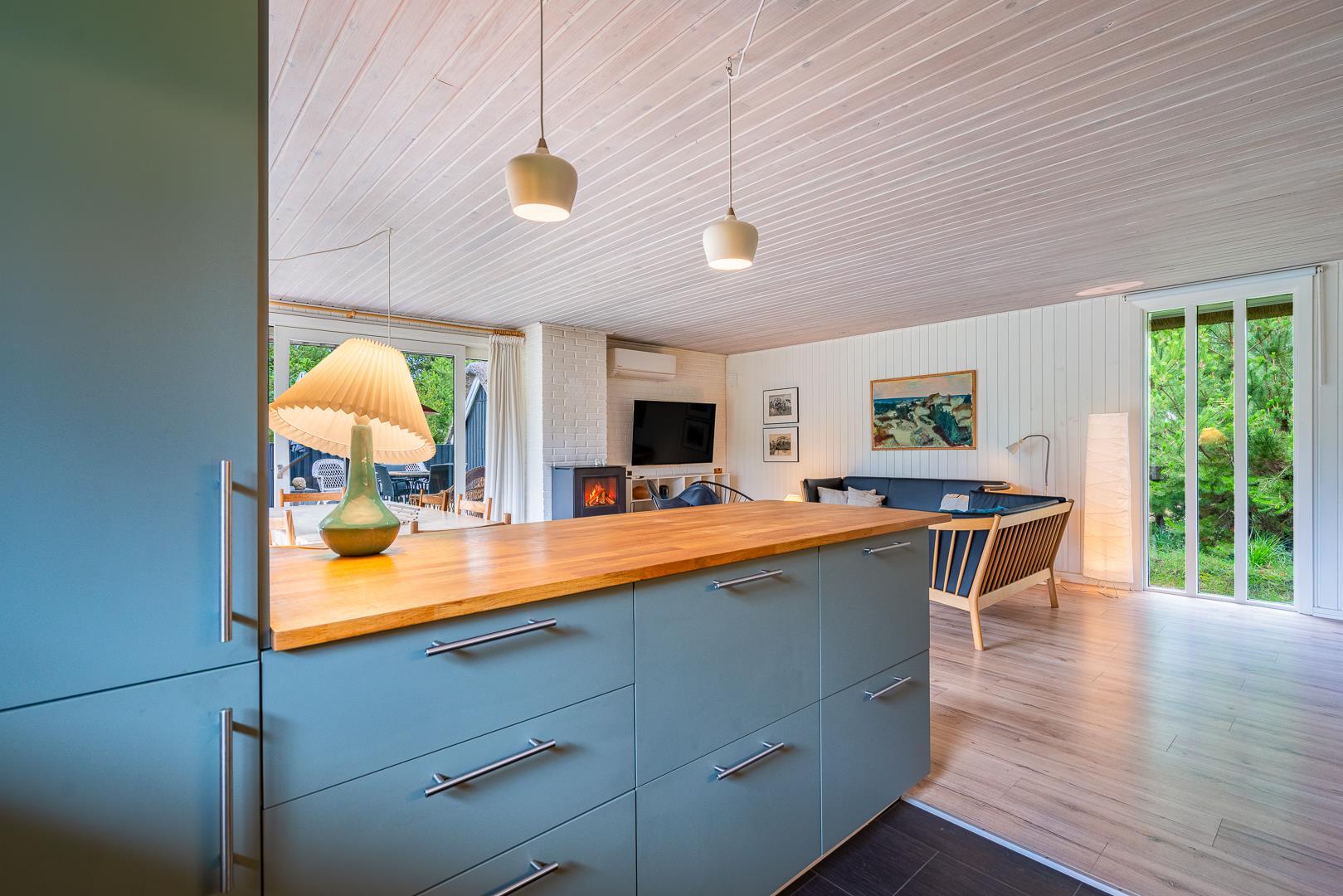 Et stort moderne køkken/alrum fra 2021 venter på jer og I kan nyde hinandens nærhed. Herfra er desuden udgang til den attraktive grund, der er charmerende og helt forskellig, afhængig af årstid. Der er brændeovn til opvarmning og hygge, ellers kan huset opvarmes med en energivenlig varmepumpe.