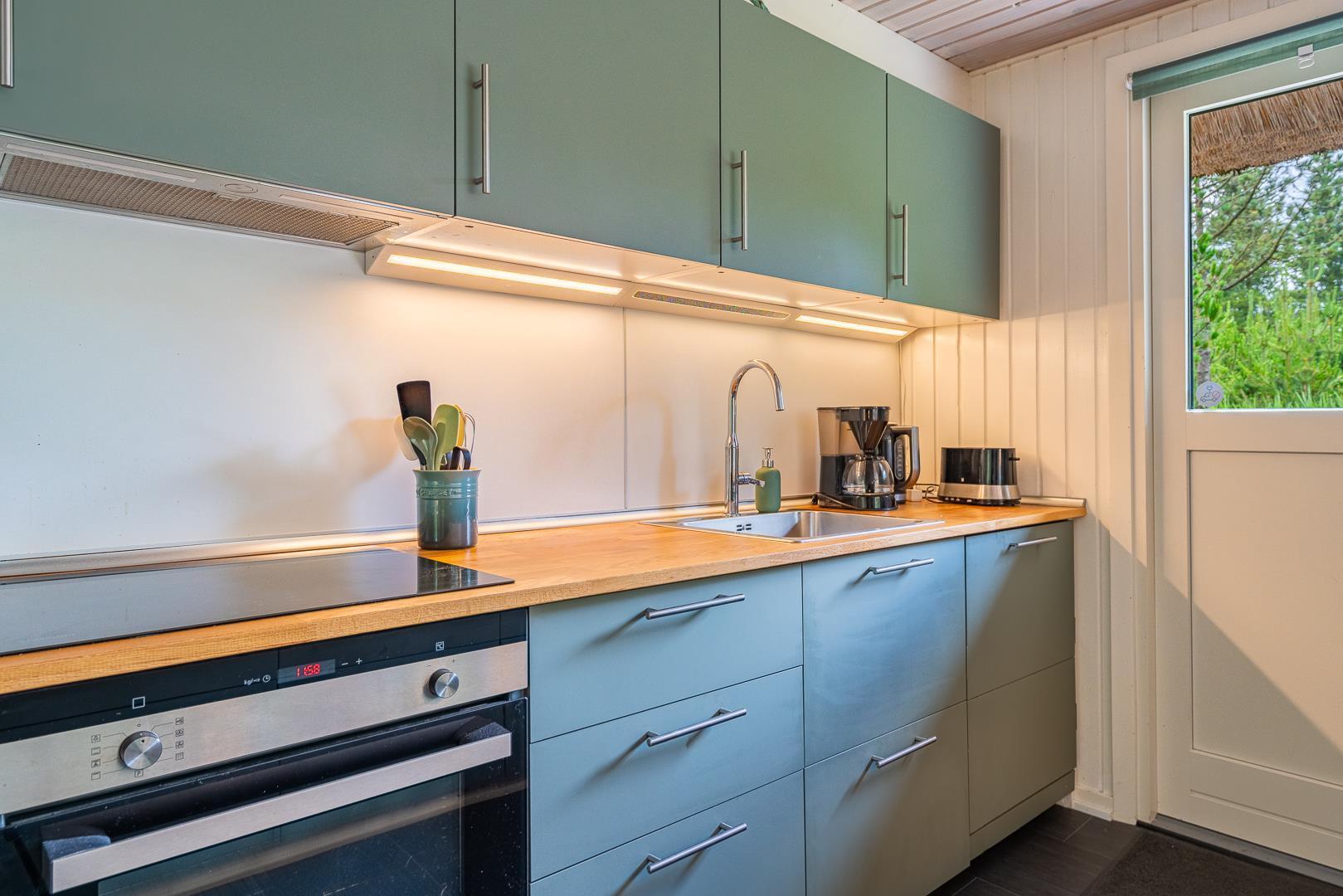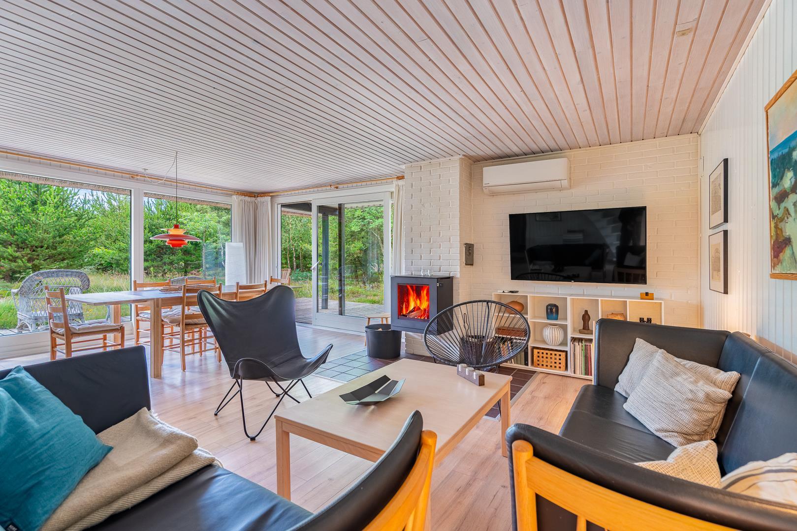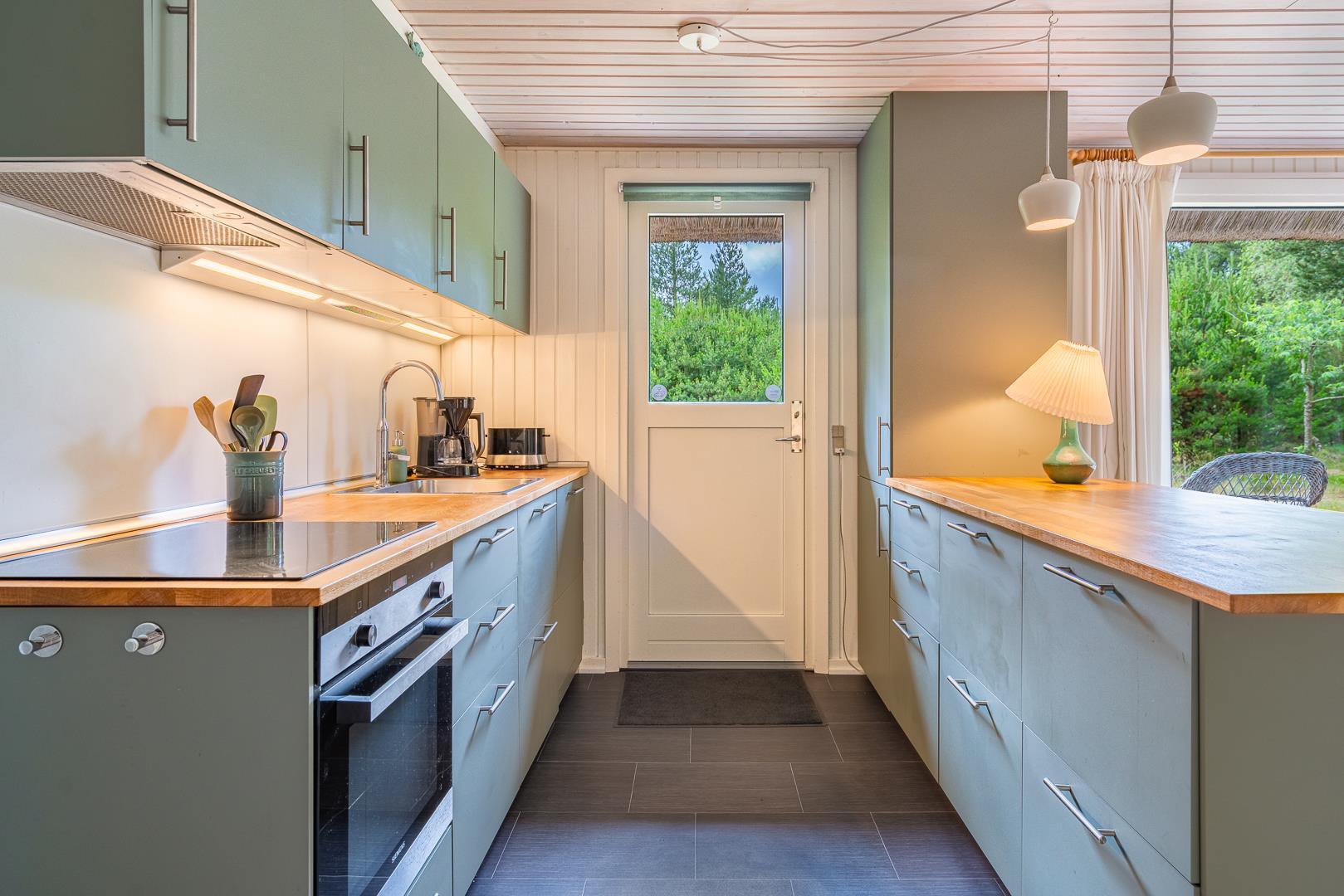 Et stort moderne køkken/alrum fra 2021 venter på jer og I kan nyde hinandens nærhed. Herfra er desuden udgang til den attraktive grund, der er charmerende og helt forskellig, afhængig af årstid. Der er brændeovn til opvarmning og hygge, ellers kan huset opvarmes med en energivenlig varmepumpe.