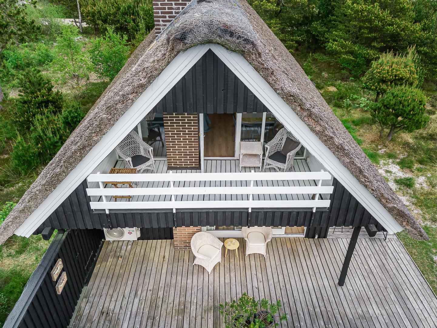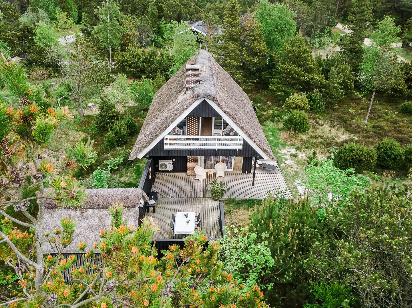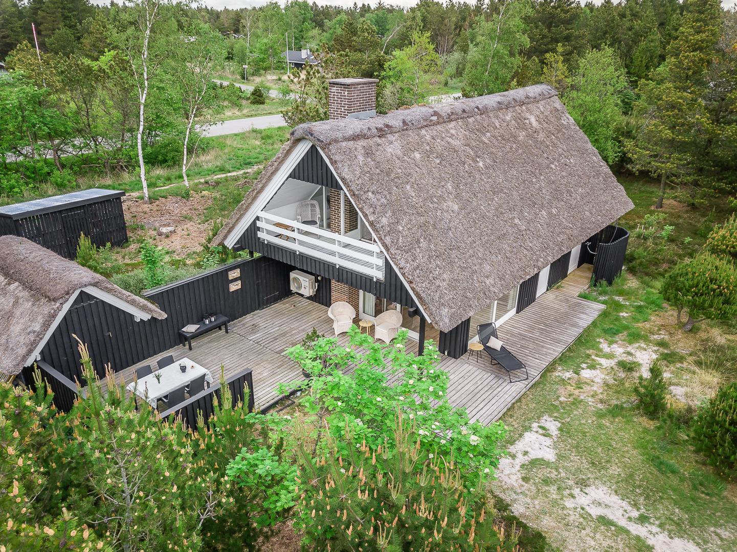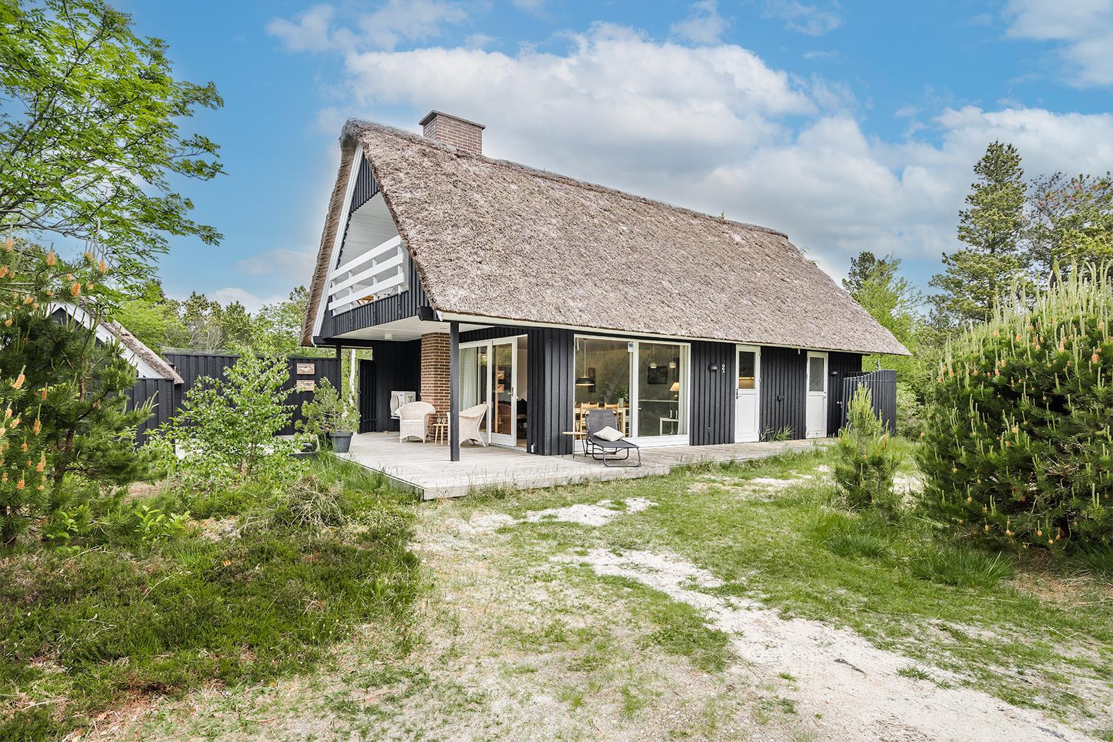 På Peder Larsens vej 2A i Houstrup ligger dette flotte feriehus med stråtag. Stor naturgrund på 2400 kvadratmeter og meget varieret bevoksning. På terrassen er der mulighed for at sidde både afskærmet i åben solgård eller overdækket hvis du trænger til skygge. Der er terrasse omkring størstedelen af huset.