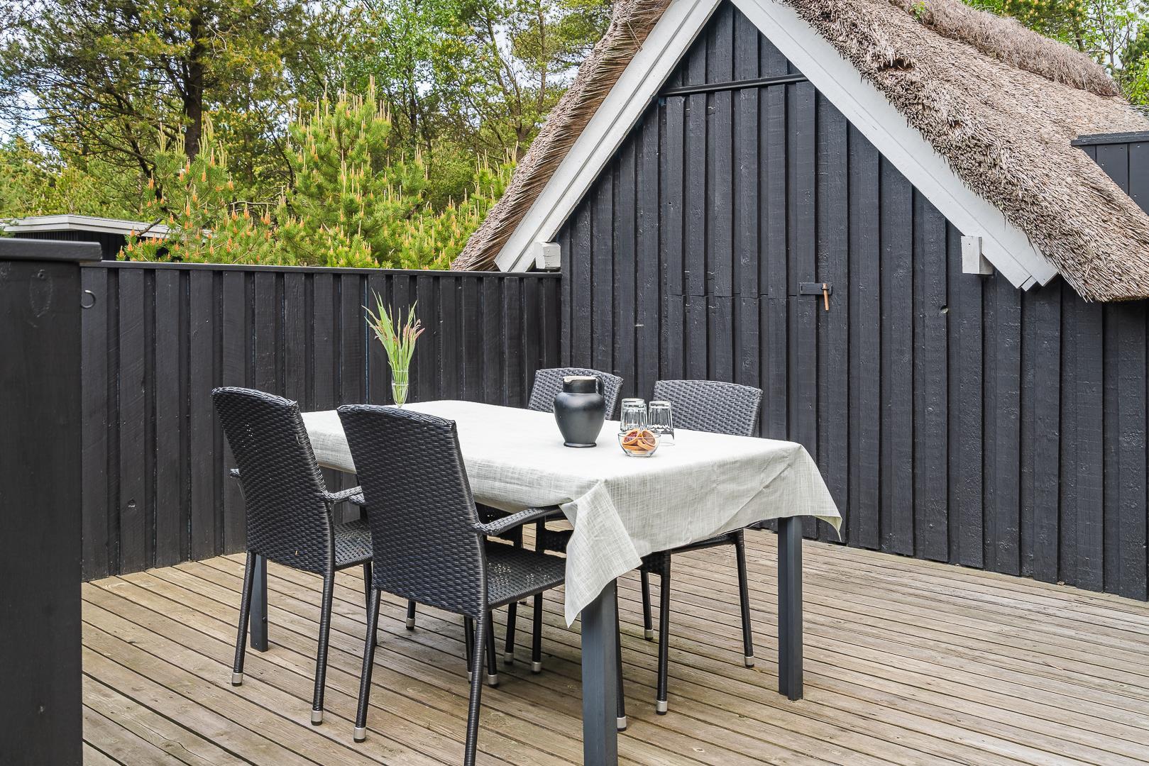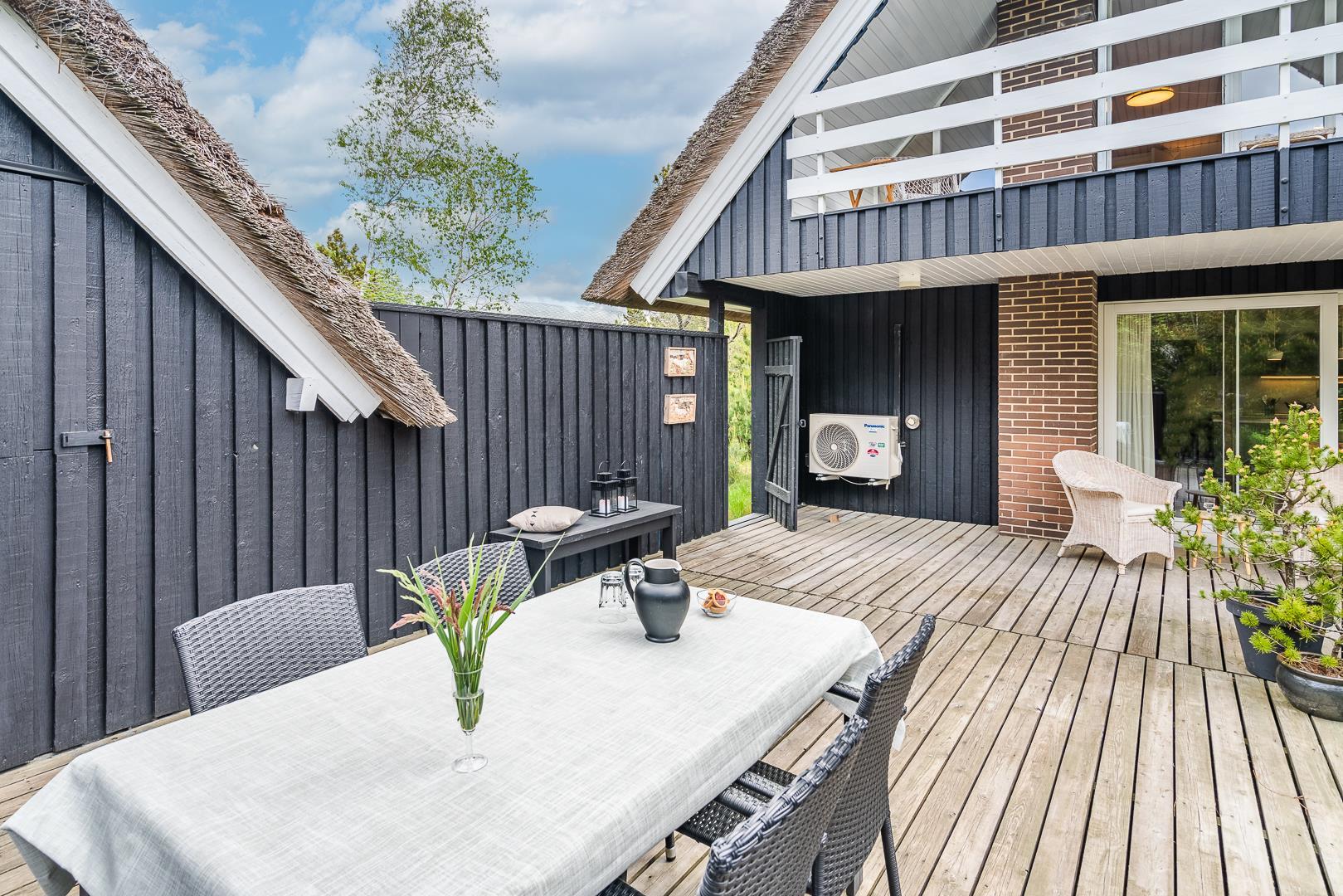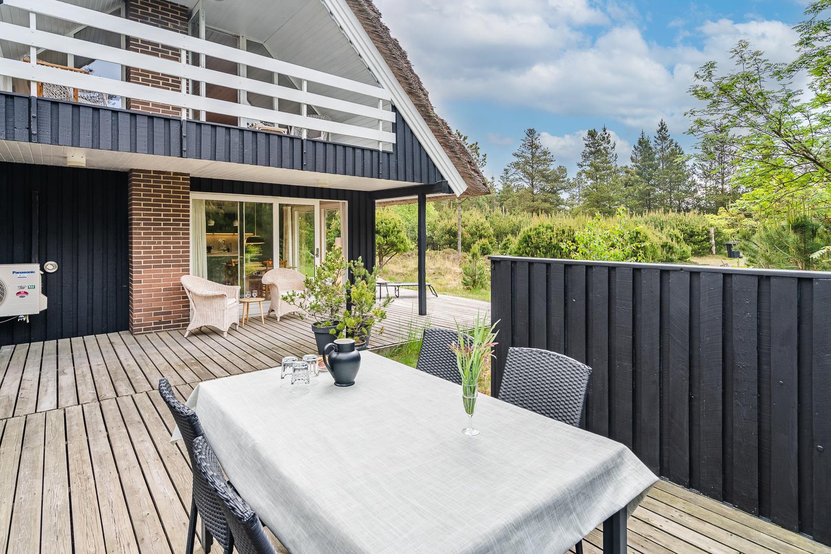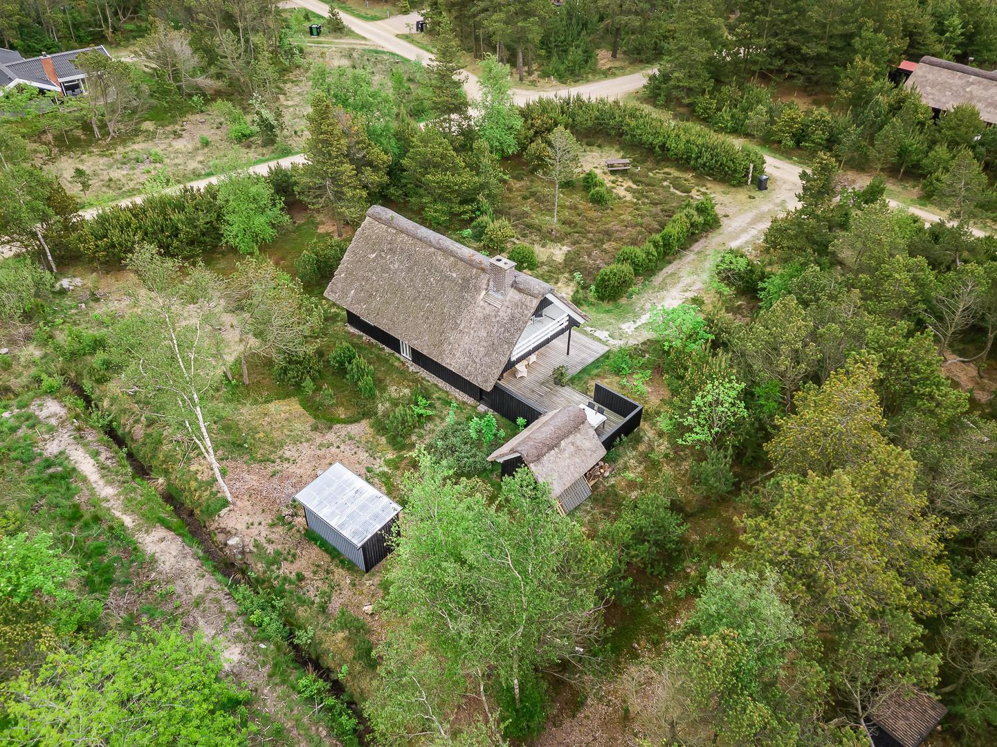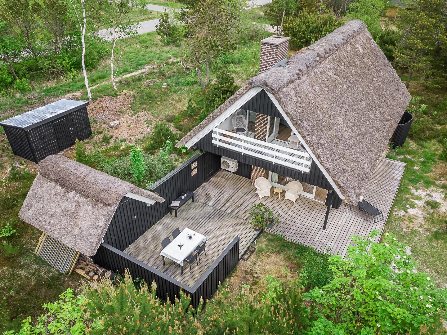 På Peder Larsens vej 2A i Houstrup ligger dette flotte feriehus med stråtag. Stor naturgrund på 2400 kvadratmeter og meget varieret bevoksning. På terrassen er der mulighed for at sidde både afskærmet i åben solgård eller overdækket hvis du trænger til skygge. Der er terrasse omkring størstedelen af huset.